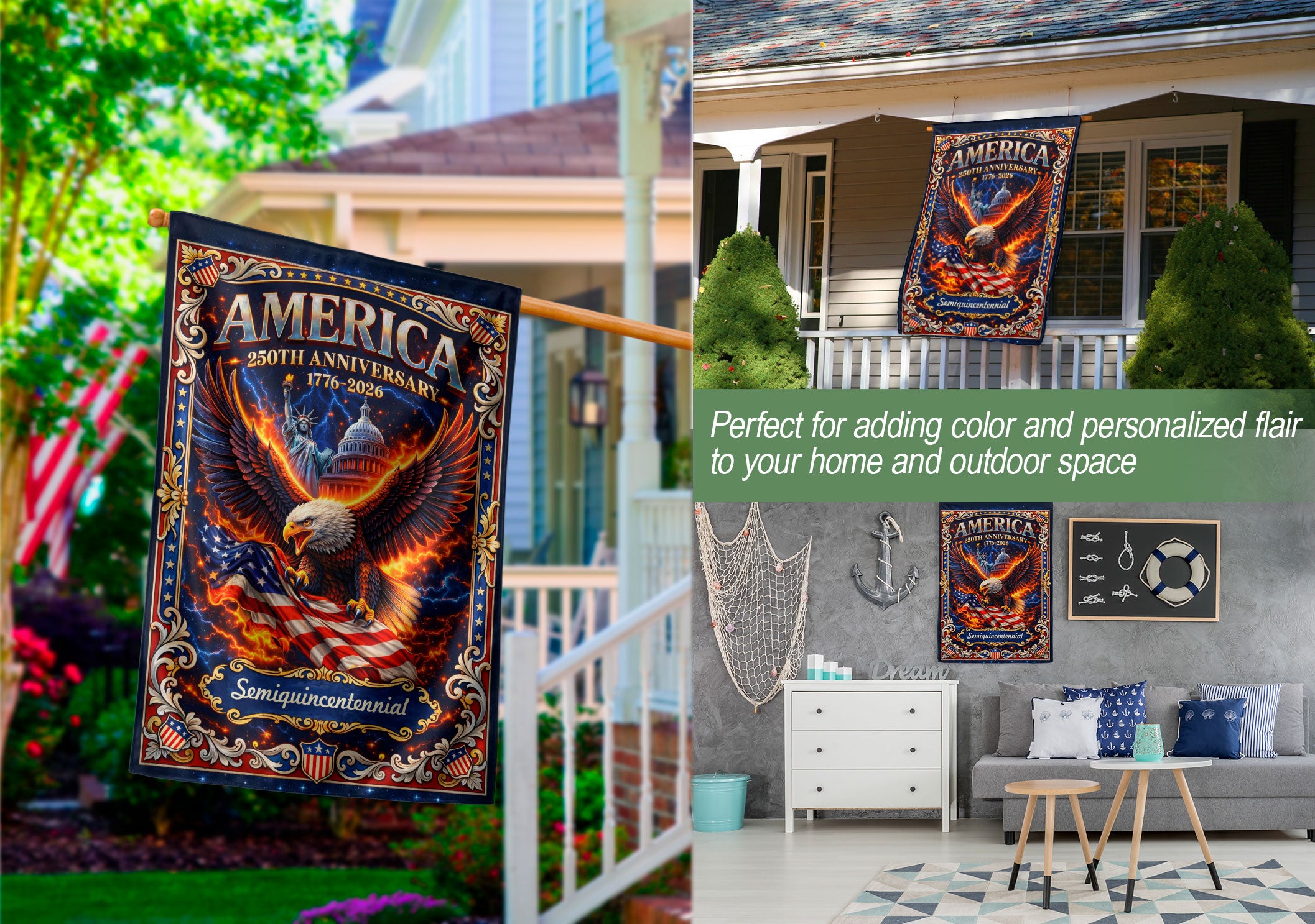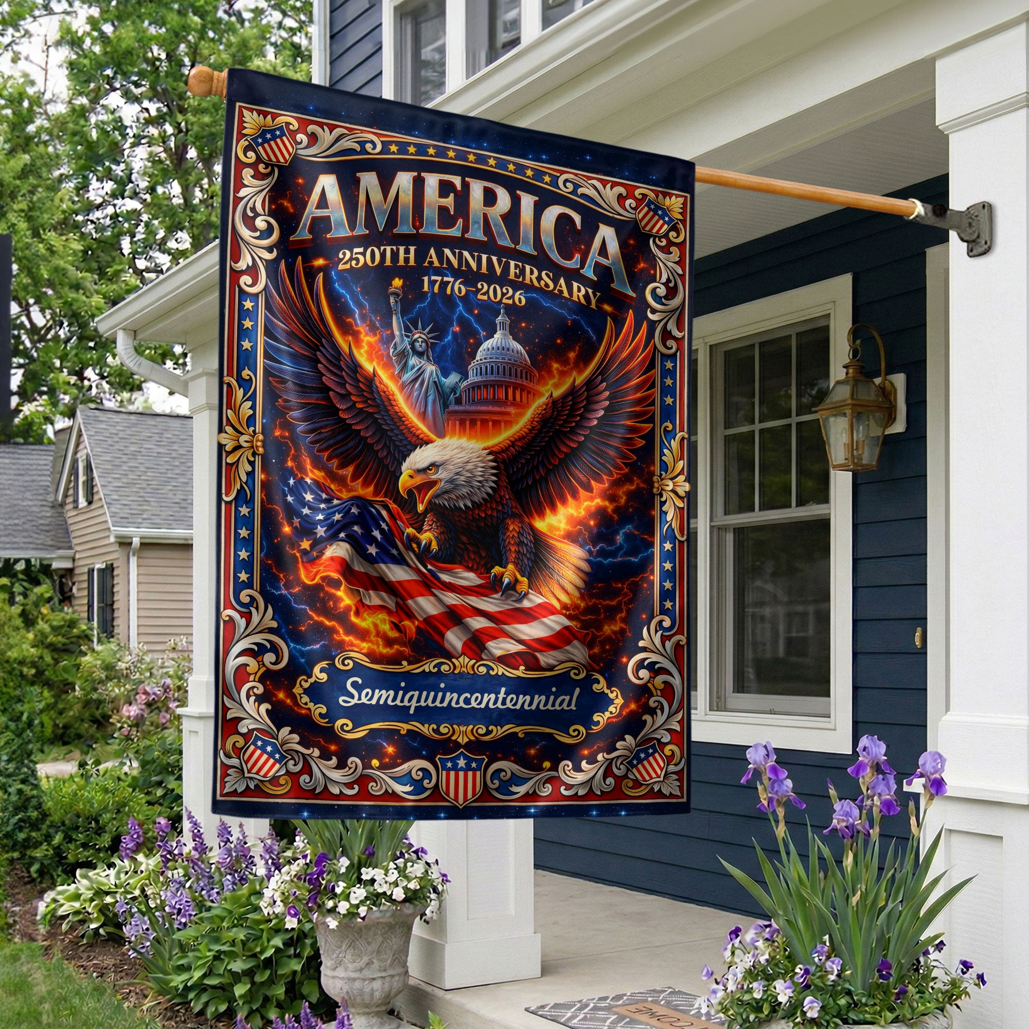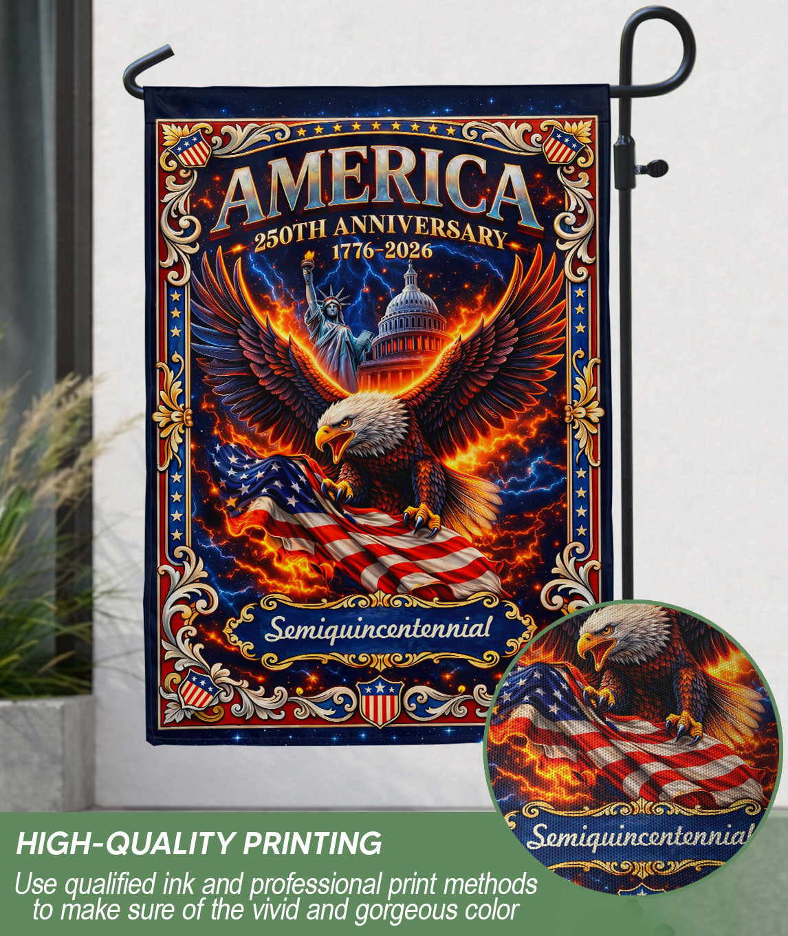 Celebrate America’s 250th anniversary from 1776 to 2026 with this striking double-sided house flag. Featuring a majestic bald eagle soaring above the iconic United States Capitol and the Statue of Liberty, this banner embodies national pride, unity, freedom, and strength. Perfect for displaying on porches, gardens, or flagpoles to honor the nation’s enduring legacy. Crafted for durability and vivid colors that withstand outdoor conditions, it’s an ideal patriotic decoration for holidays, Independence Day, or everyday display. Double-sided printing ensures clear visibility from both sides.