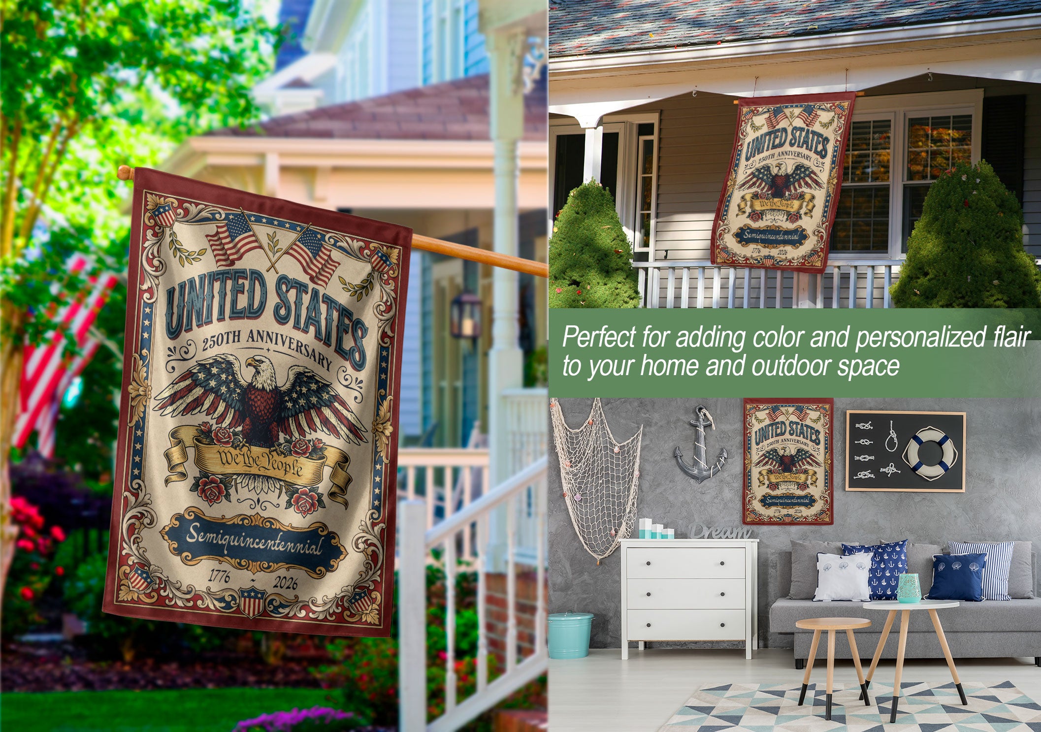 Celebrate America’s 250th anniversary from 1776 to 2026 with this patriotic garden flag featuring ‘We The People’ and a majestic bald eagle. Double-sided printing ensures vibrant visibility from both sides, perfect for gardens, porches, mailboxes, or yards. Crafted from durable polyester fabric, it withstands outdoor weather while showcasing symbols of unity, resilience, and 250 years of freedom. Easy to hang with a sleeve for standard garden flag poles. Ideal for Independence Day, Memorial Day, Fourth of July, or everyday display of American pride.