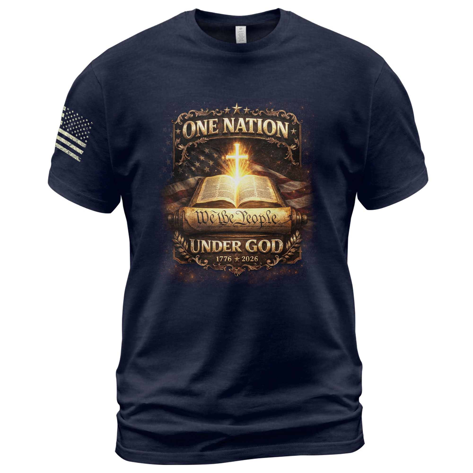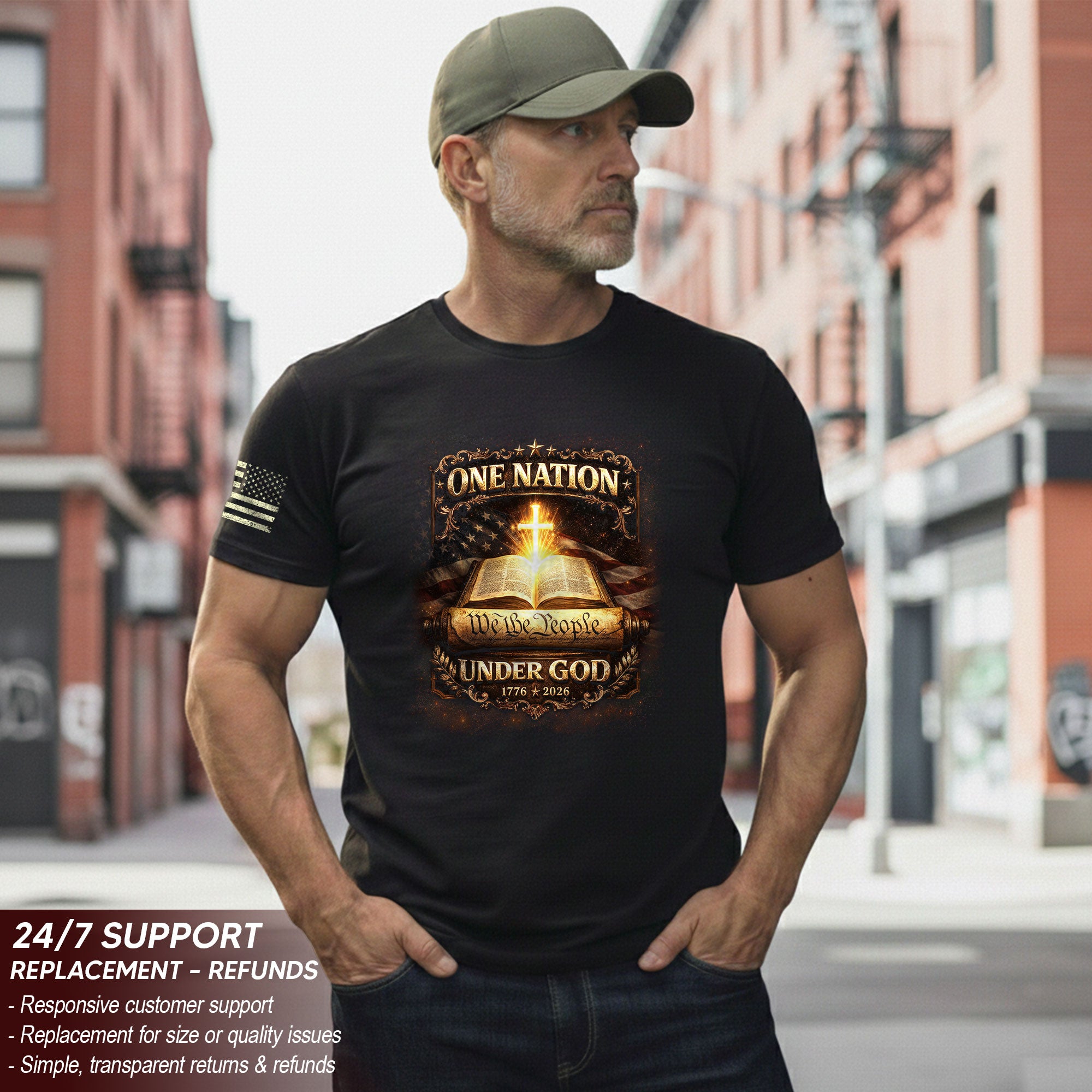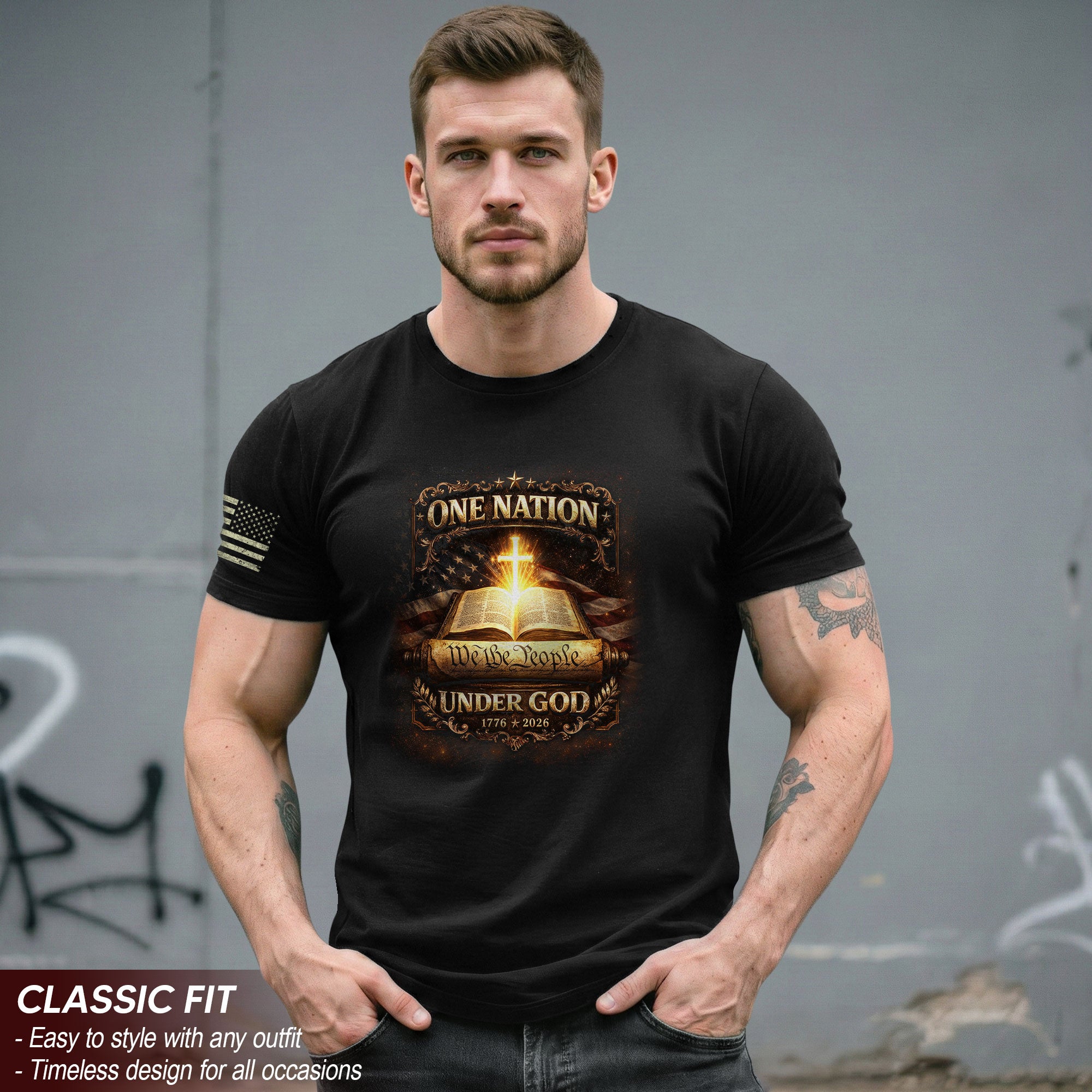 Belief woven into freedom’s story.Pairing We The People with the Bible and American flag, this tee reflects faith, unity, and 250 years of resilience under God.