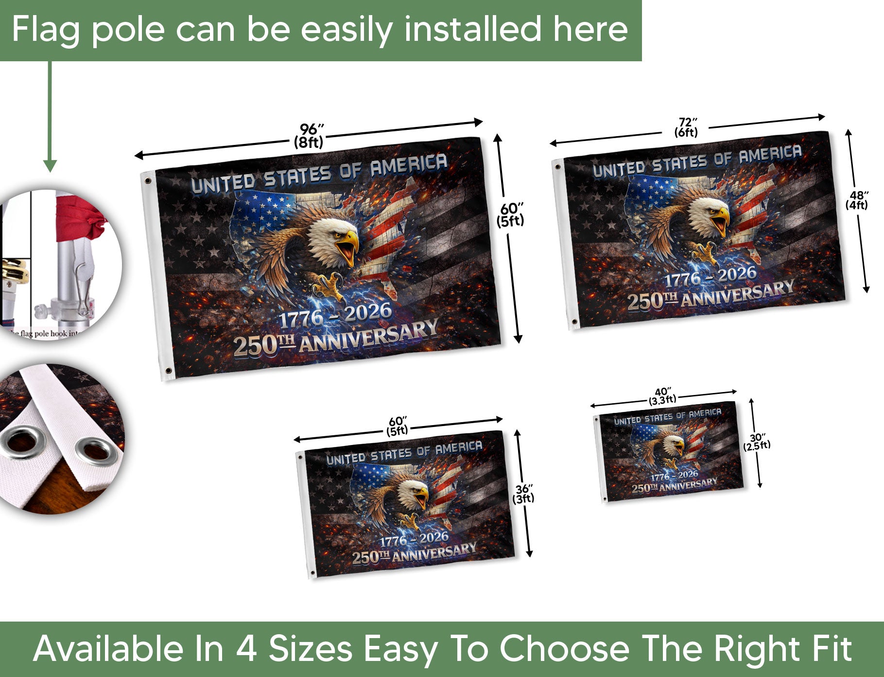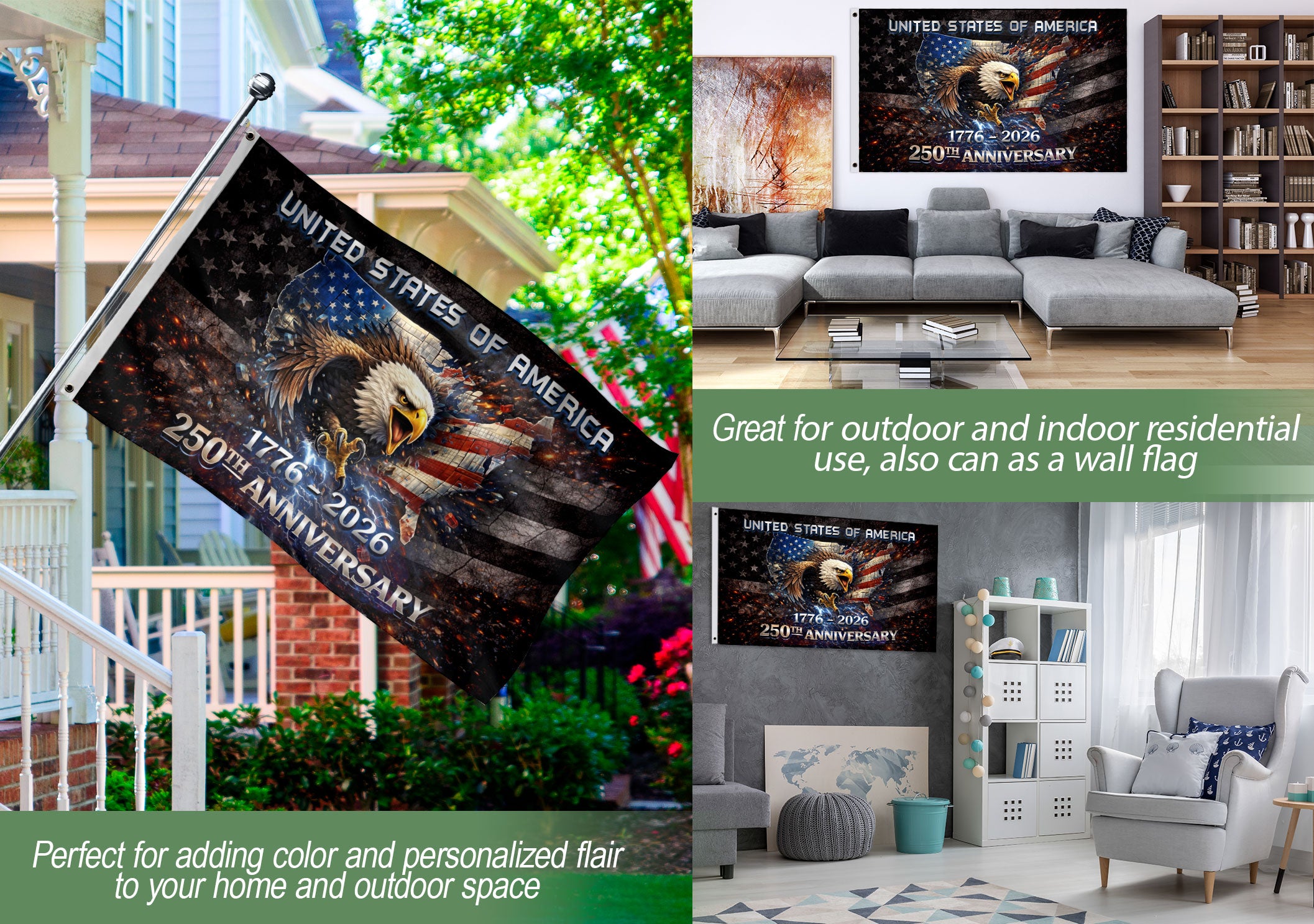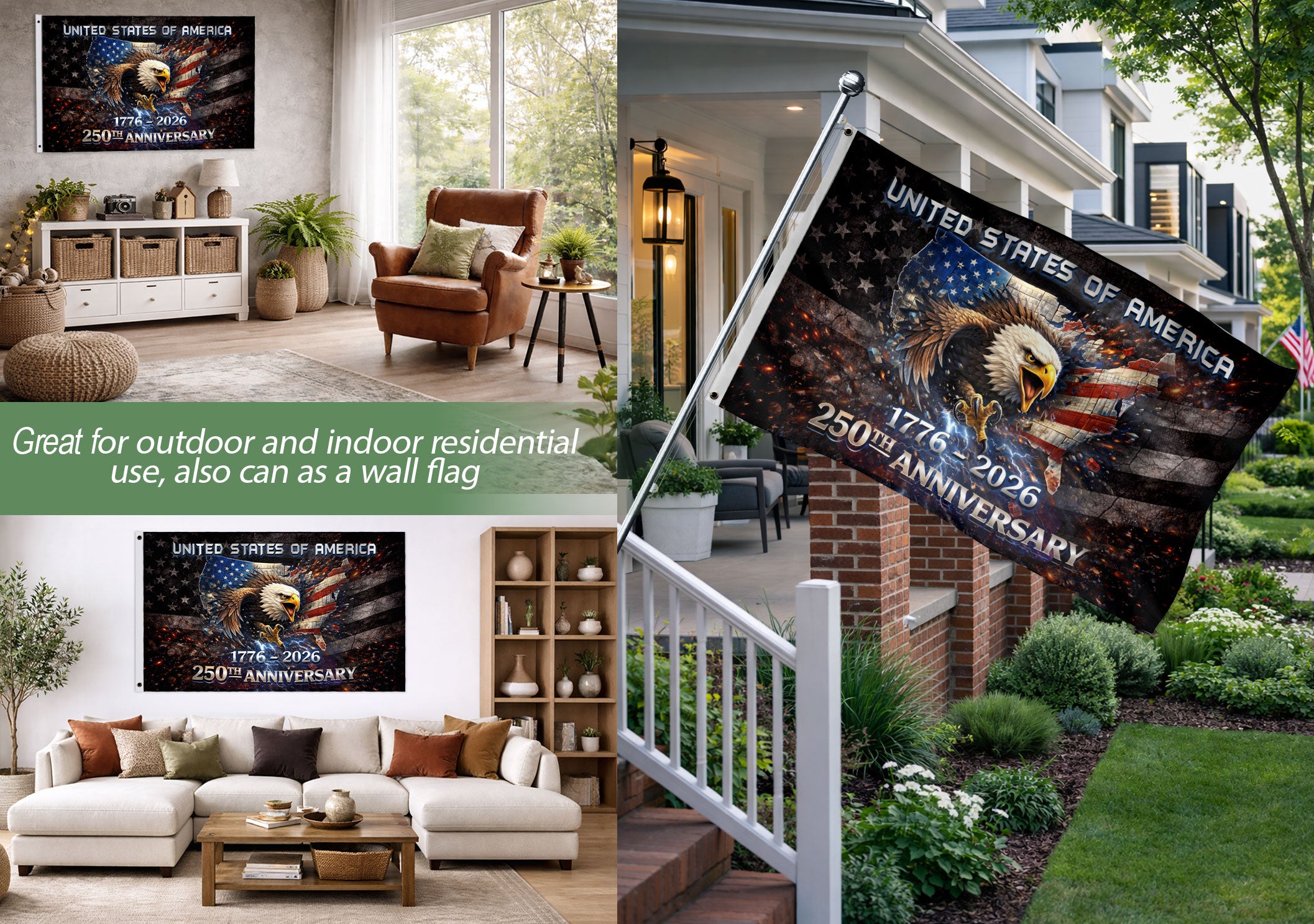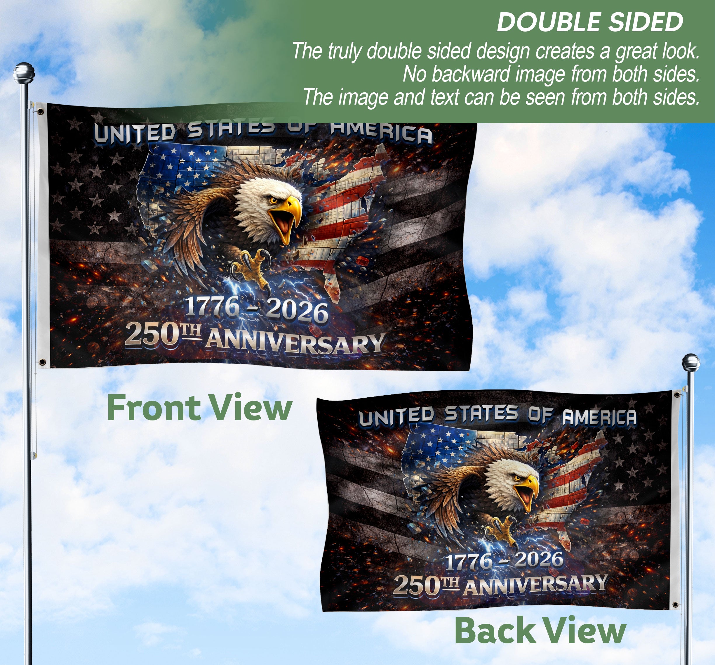 1776-2026 USA 250th Anniversary House Flag Vintage Bootleg Eagle Lightning Double Sided