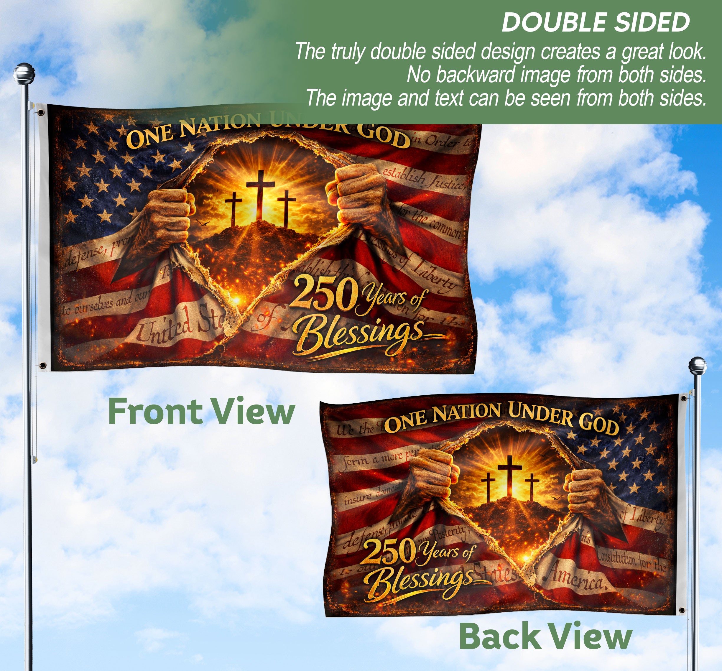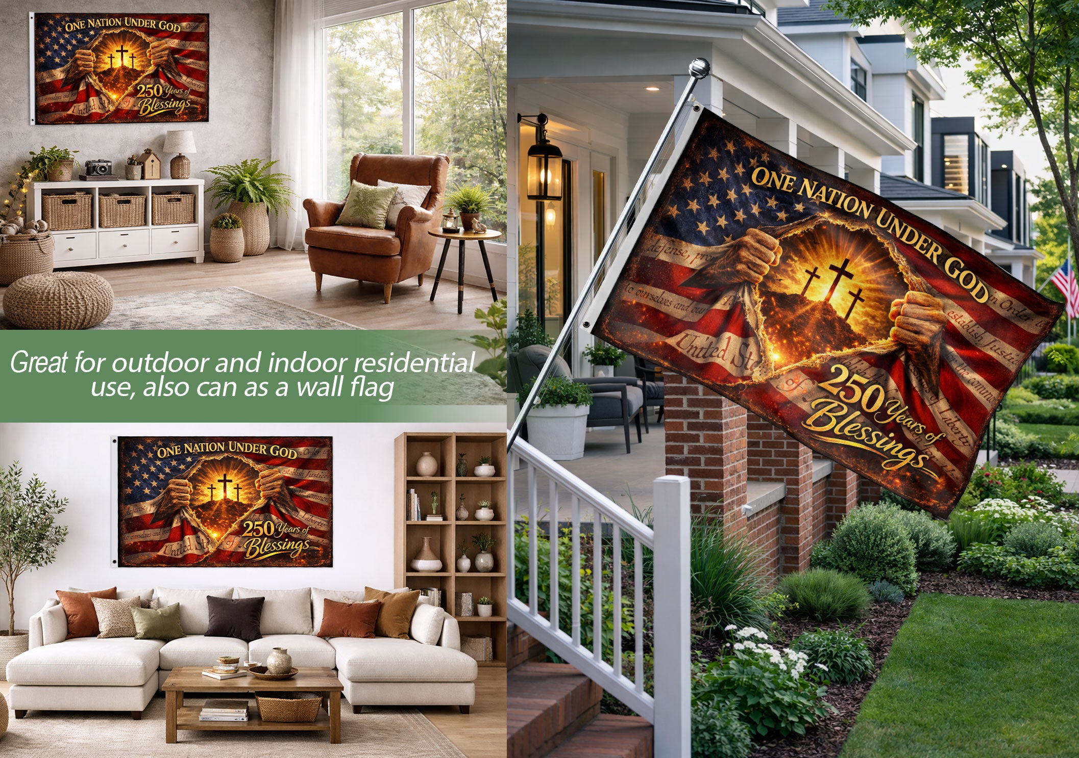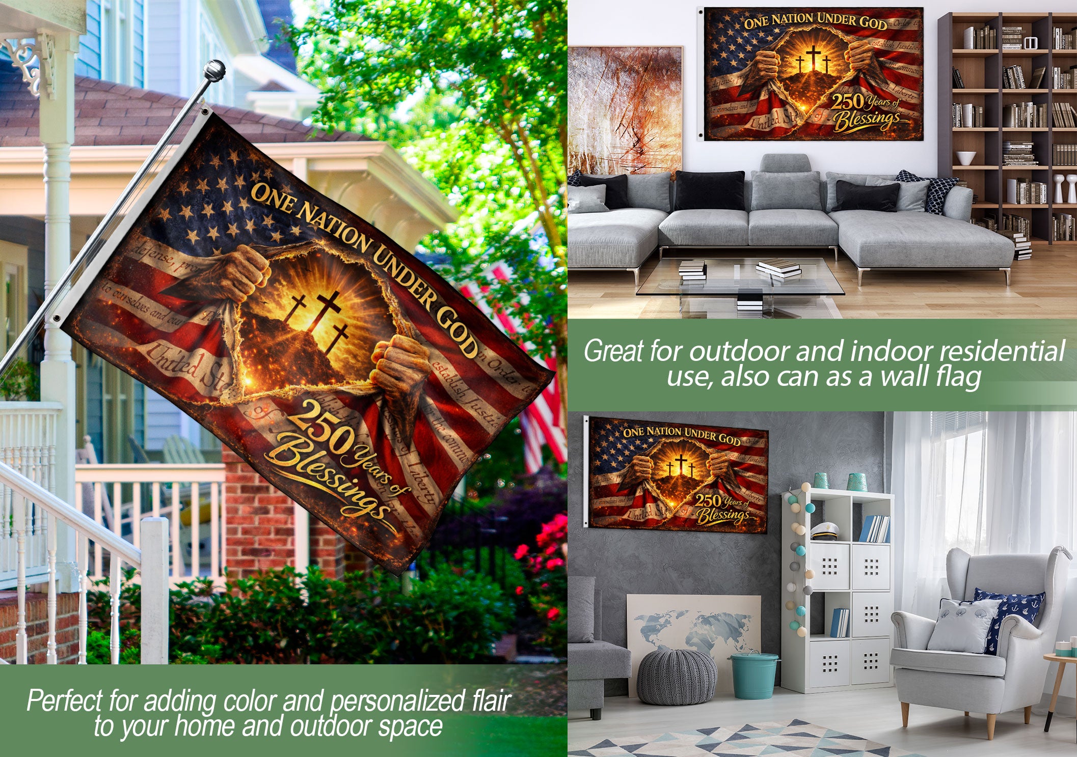 Celebrate America’s 250th anniversary with this striking house flag featuring a majestic eagle rising over a cross and the iconic American flag. Crafted for durability and vibrant display, this patriotic house flag embodies faith, freedom, and national unity. Perfect for porches, gardens, or patios, it honors 250 years of American history from 1776 to 2026. Made with high-quality polyester fabric that withstands weather elements, ensuring long-lasting color and clarity. The powerful design combines Christian symbolism with bold American pride, making it an ideal decoration for Independence Day, Memorial Day, or everyday display of patriotism.