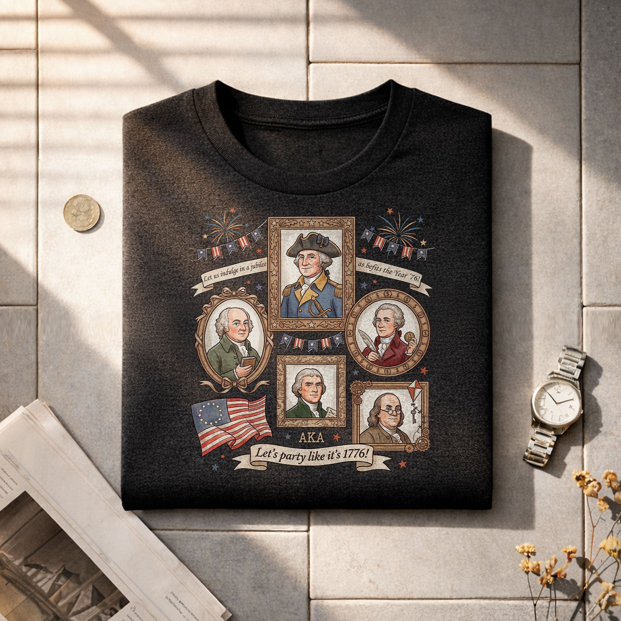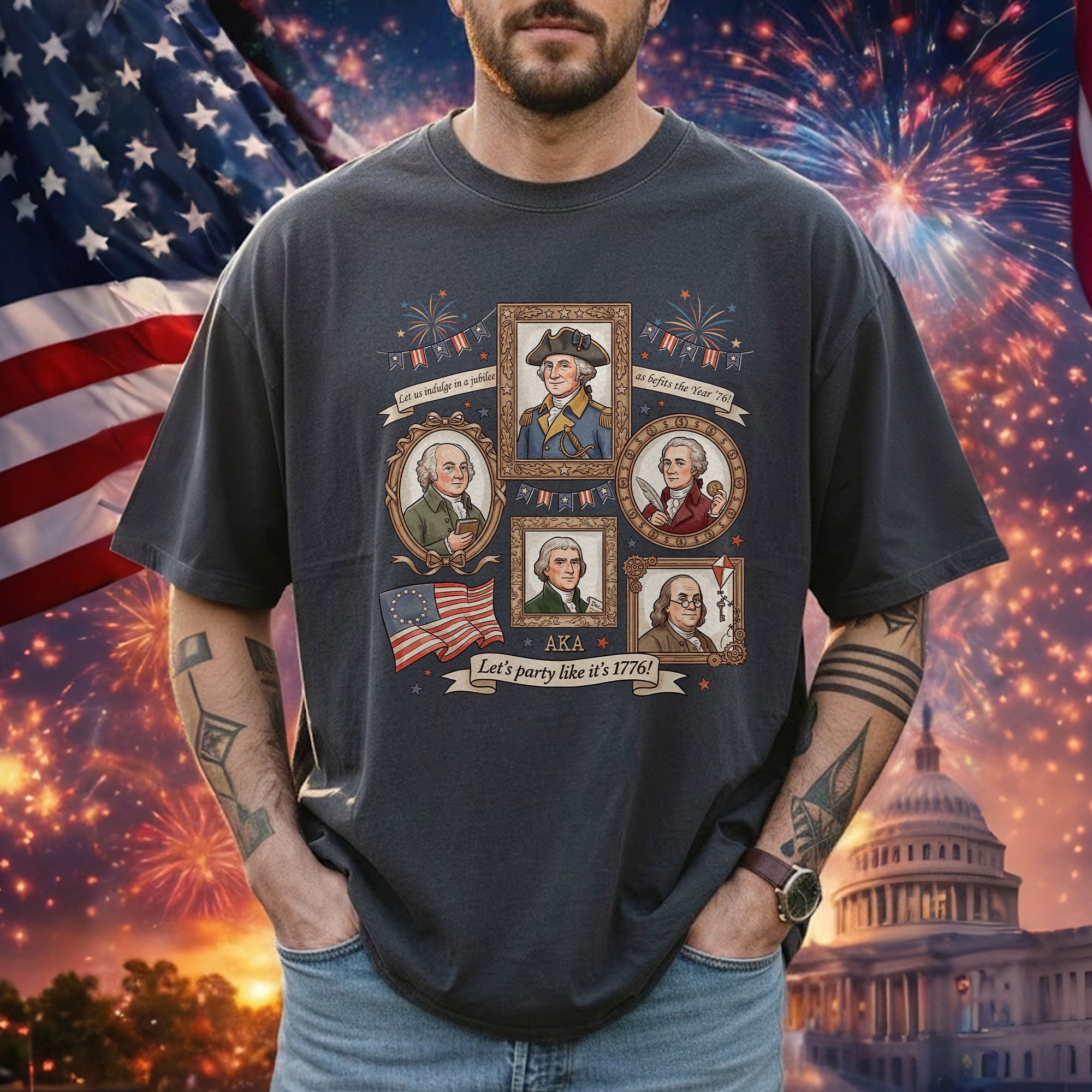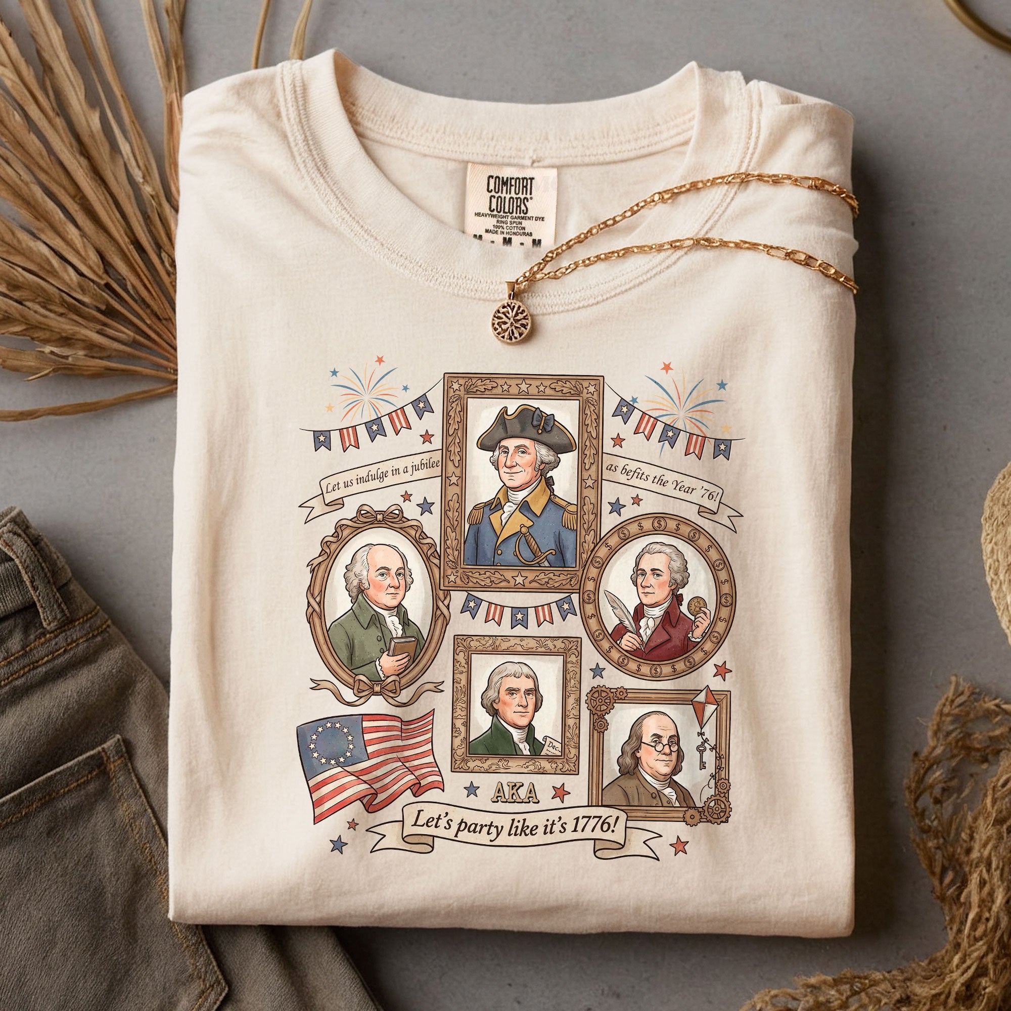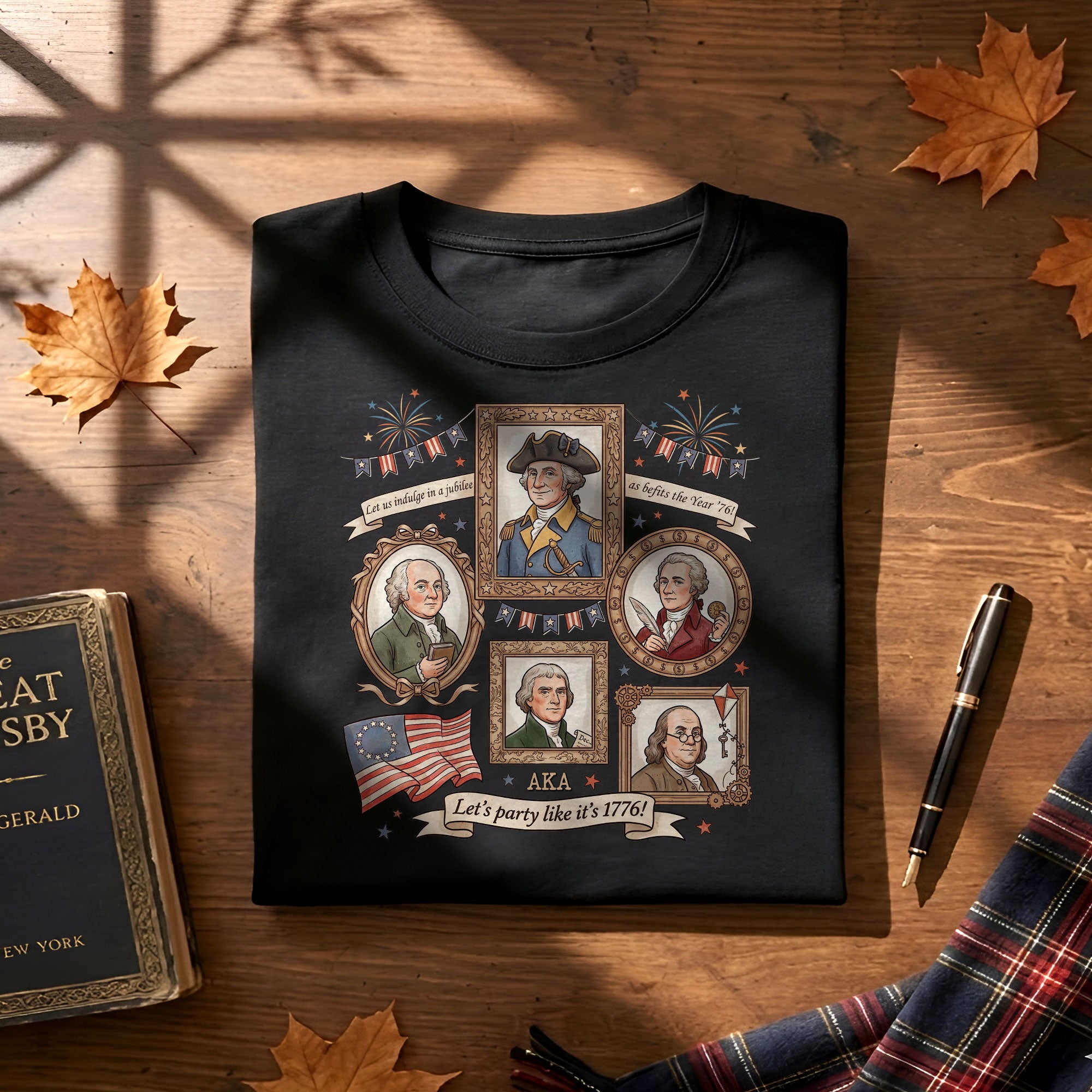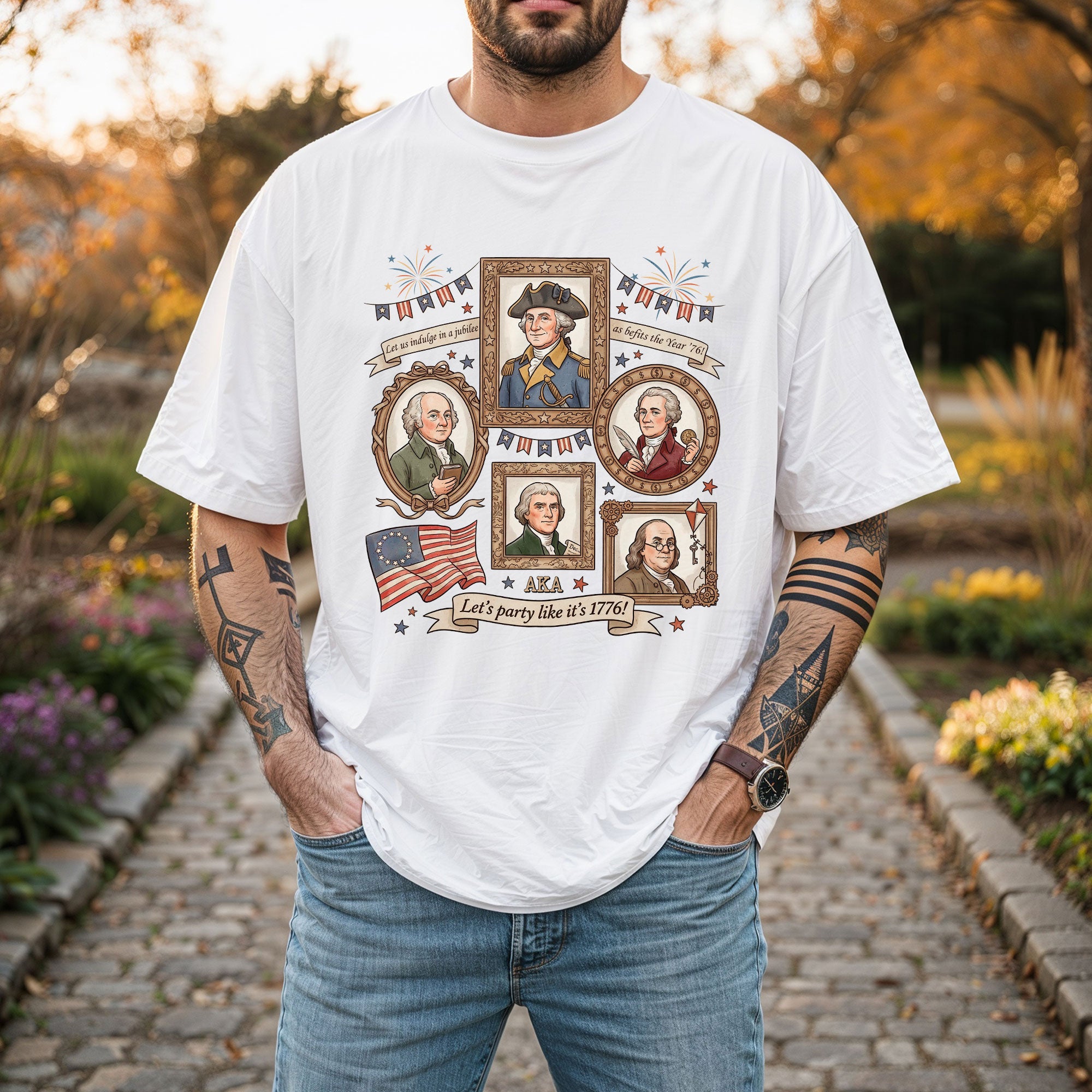 A vintage-style Founding Fathers 1776 T-shirt celebrating American history and patriotic spirit. Perfect for Independence Day, history lovers, and anyone who wants to “Party Like It’s 1776.”