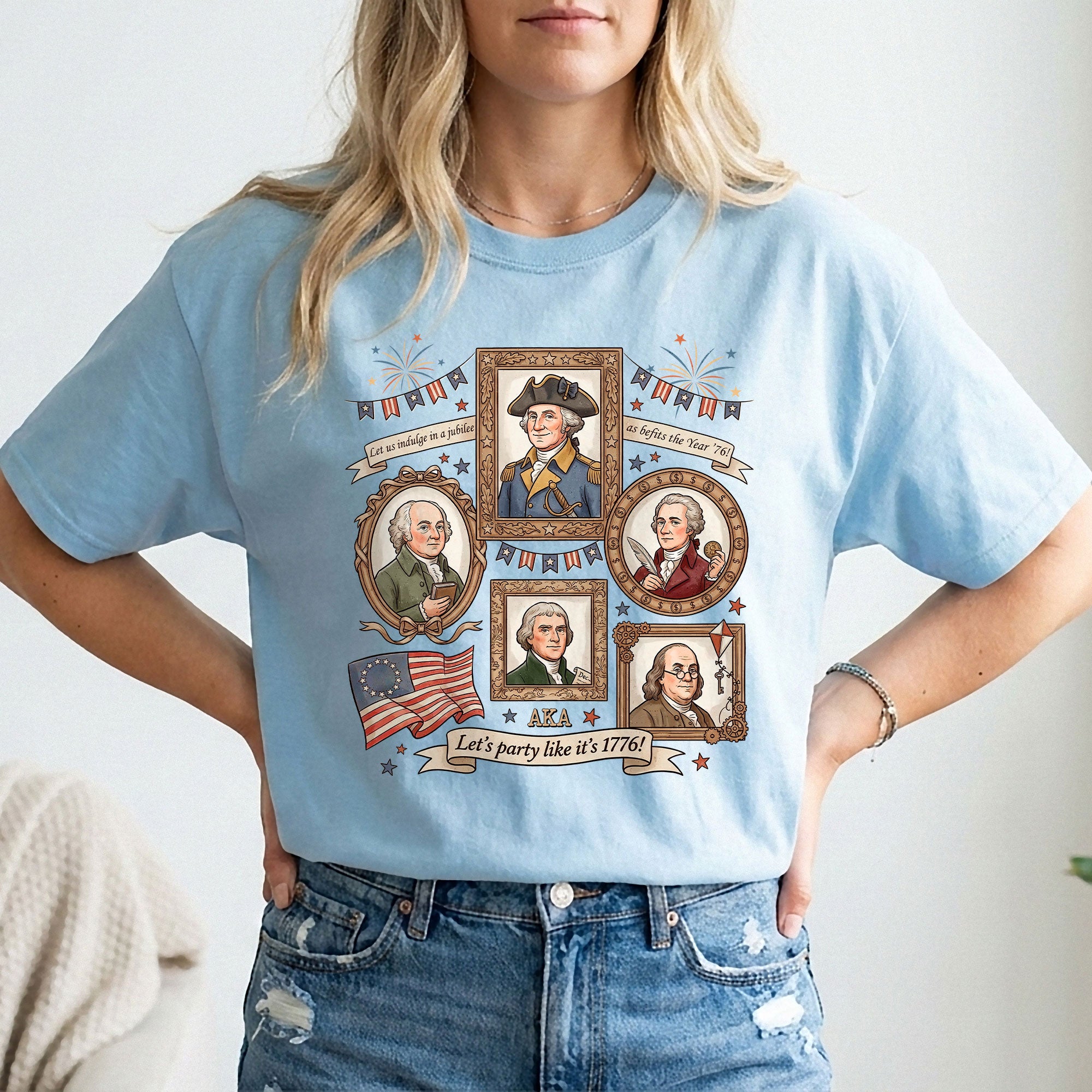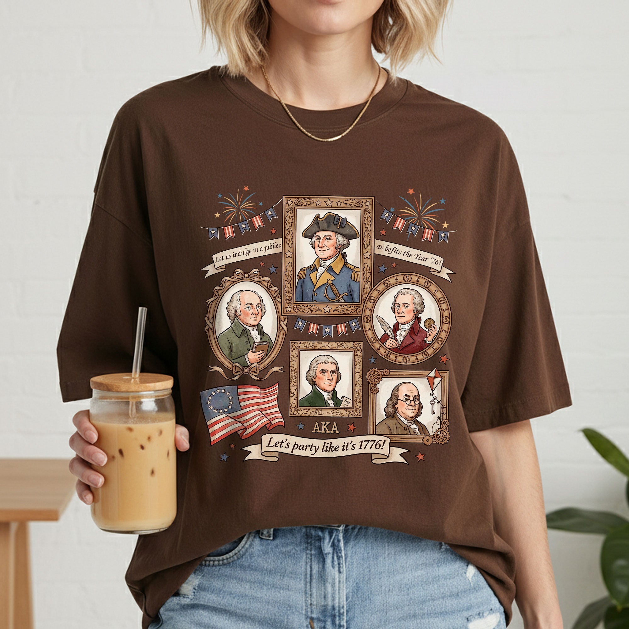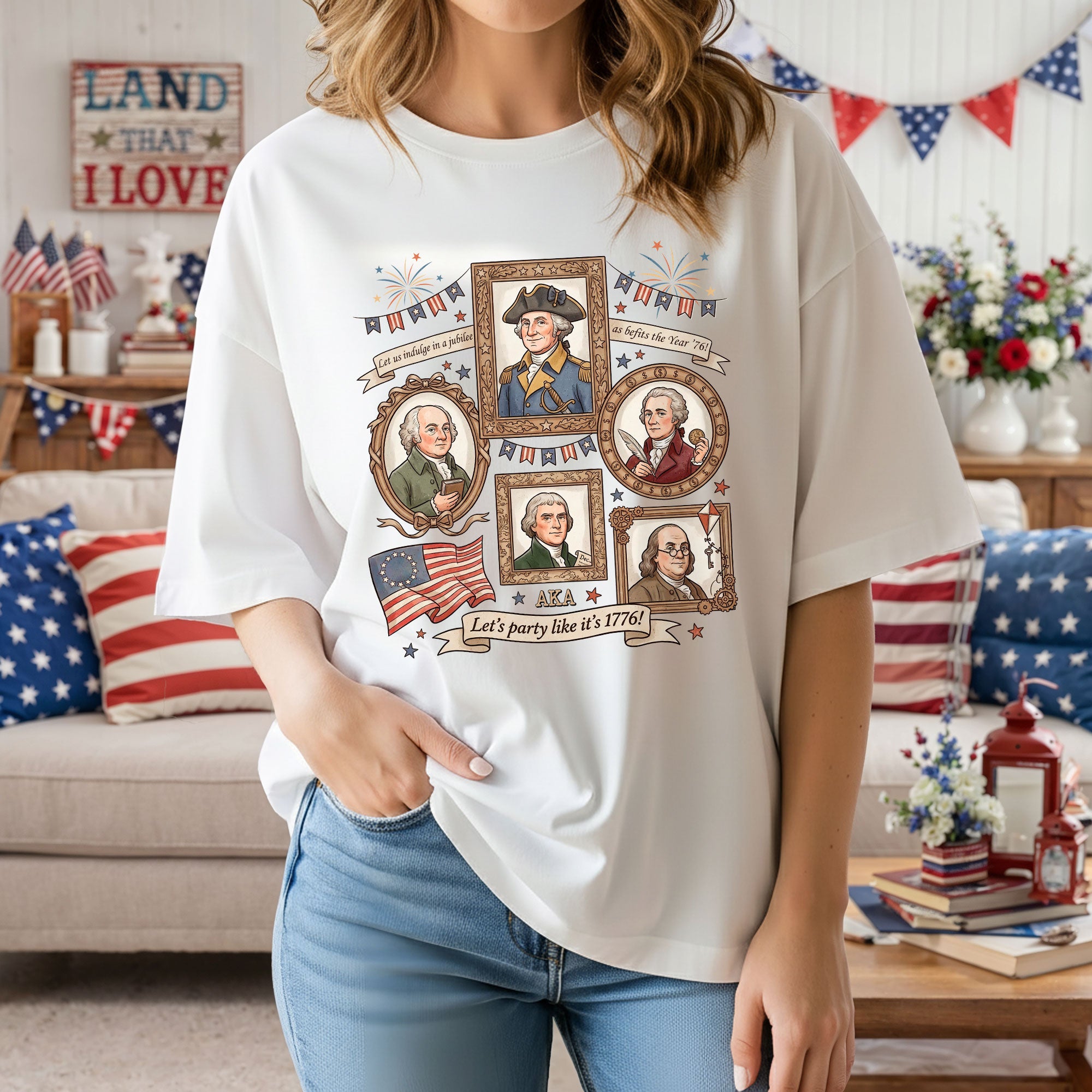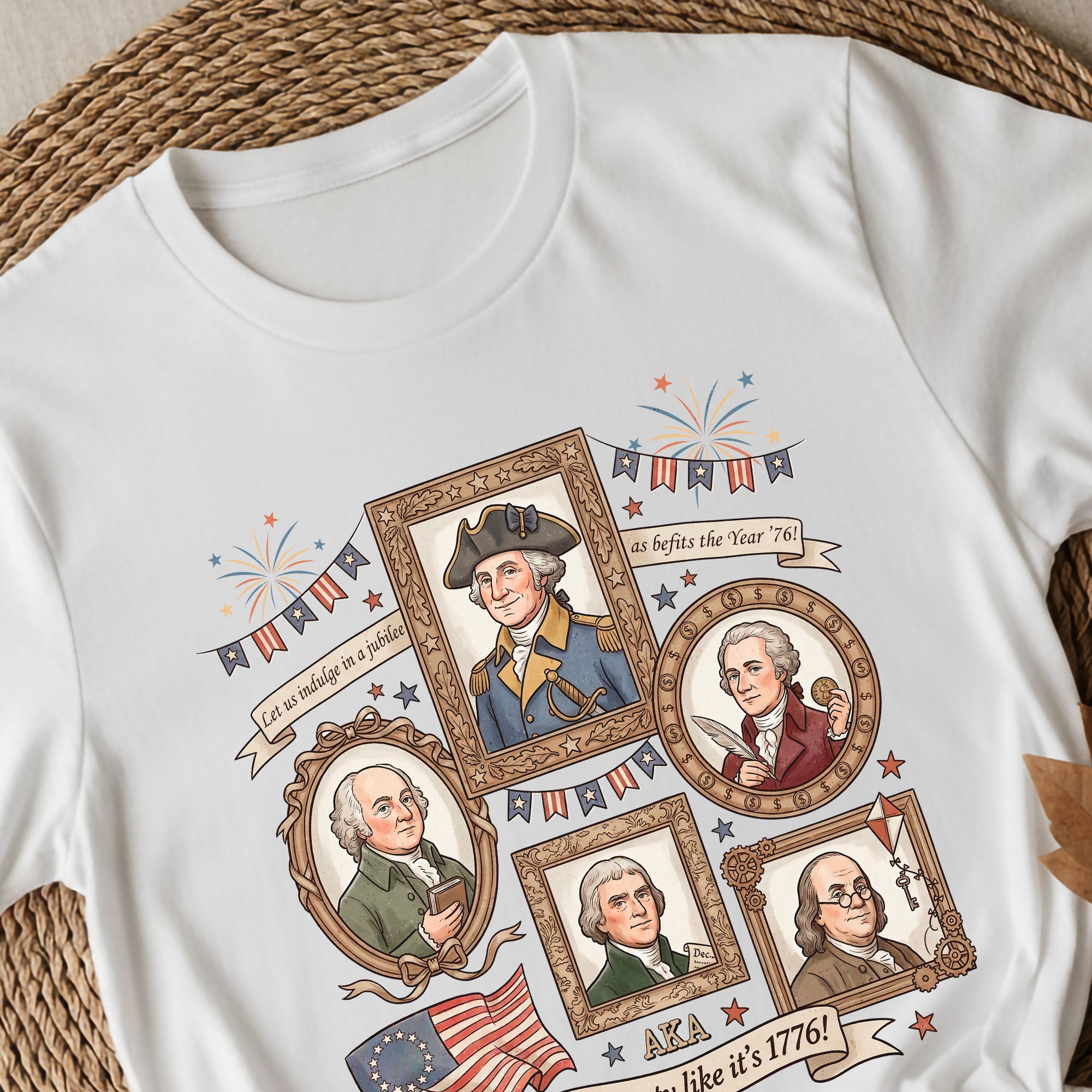 A vintage-style Founding Fathers 1776 T-shirt celebrating American history and patriotic spirit. Perfect for Independence Day, history lovers, and anyone who wants to “Party Like It’s 1776.”