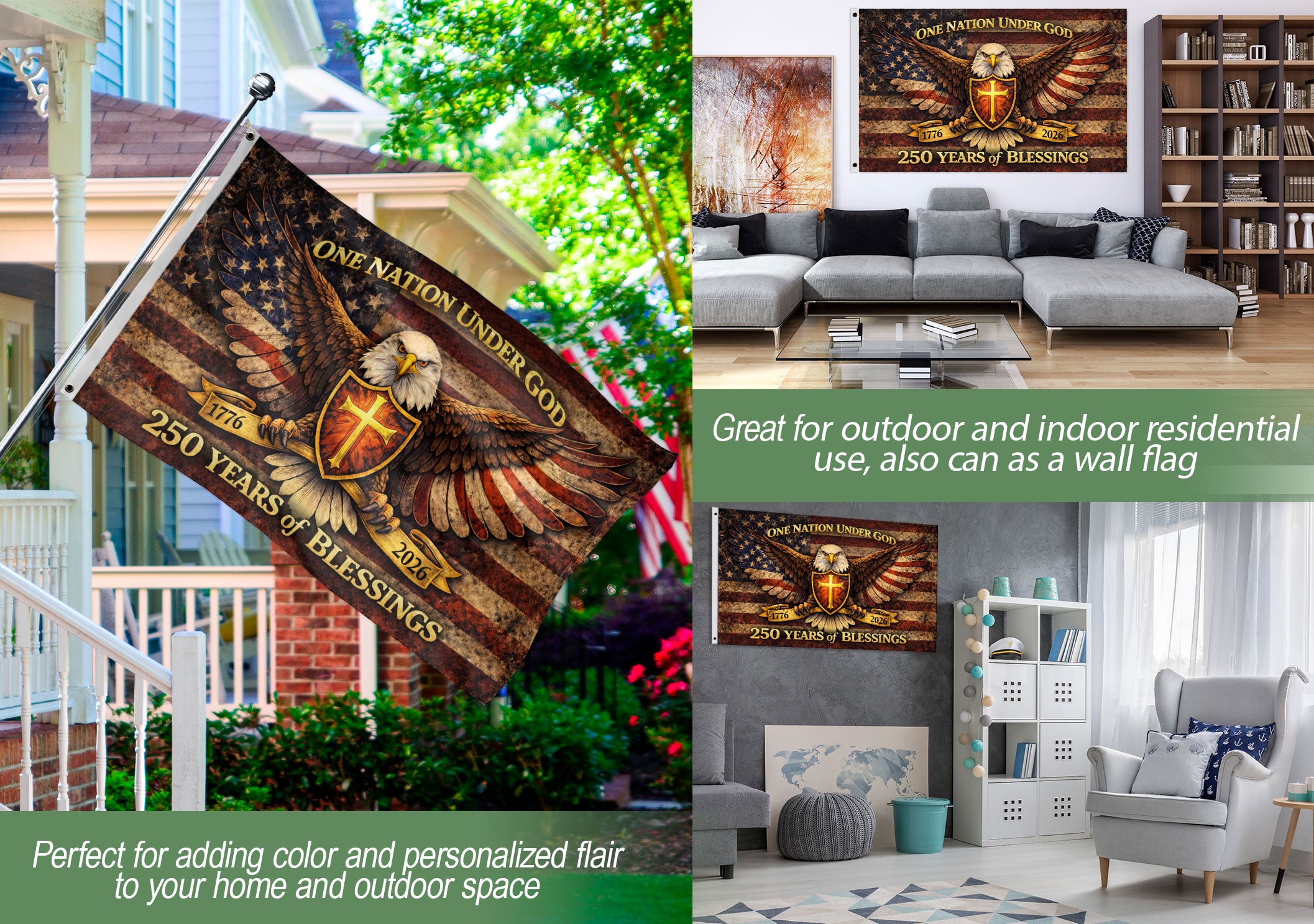 Celebrate 250 years of American independence with this striking double-sided eagle flag banner. Featuring the iconic eagle design, ‘One Nation Under God’ inscription, and the historic span from 1776 to 2026, this flag honors the nation’s enduring heritage, unity, and faith. Crafted for durability, it’s perfect for displaying at patriotic events, home decorations, Fourth of July celebrations, veterans’ gatherings, or historical commemorations. The double-sided printing ensures bold visibility from both sides, making it ideal for parades, outdoor poles, or indoor wall hangings. Show your pride in America’s journey with this high-quality commemorative banner.