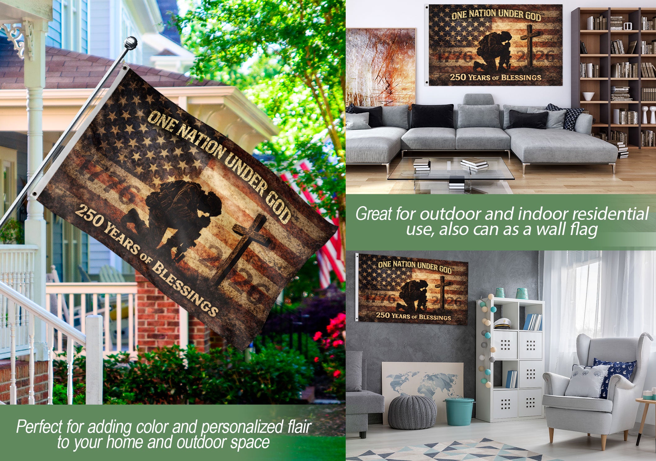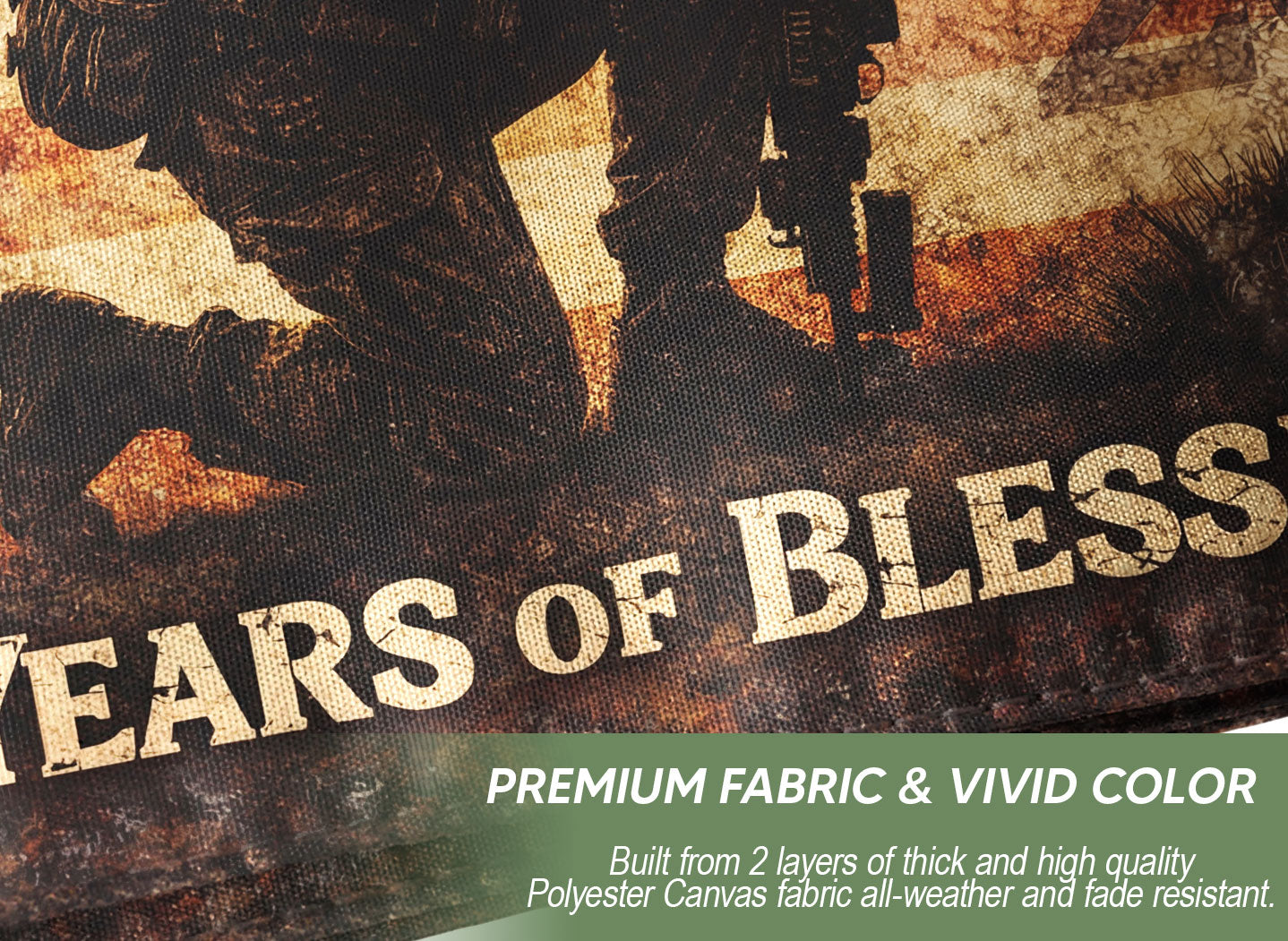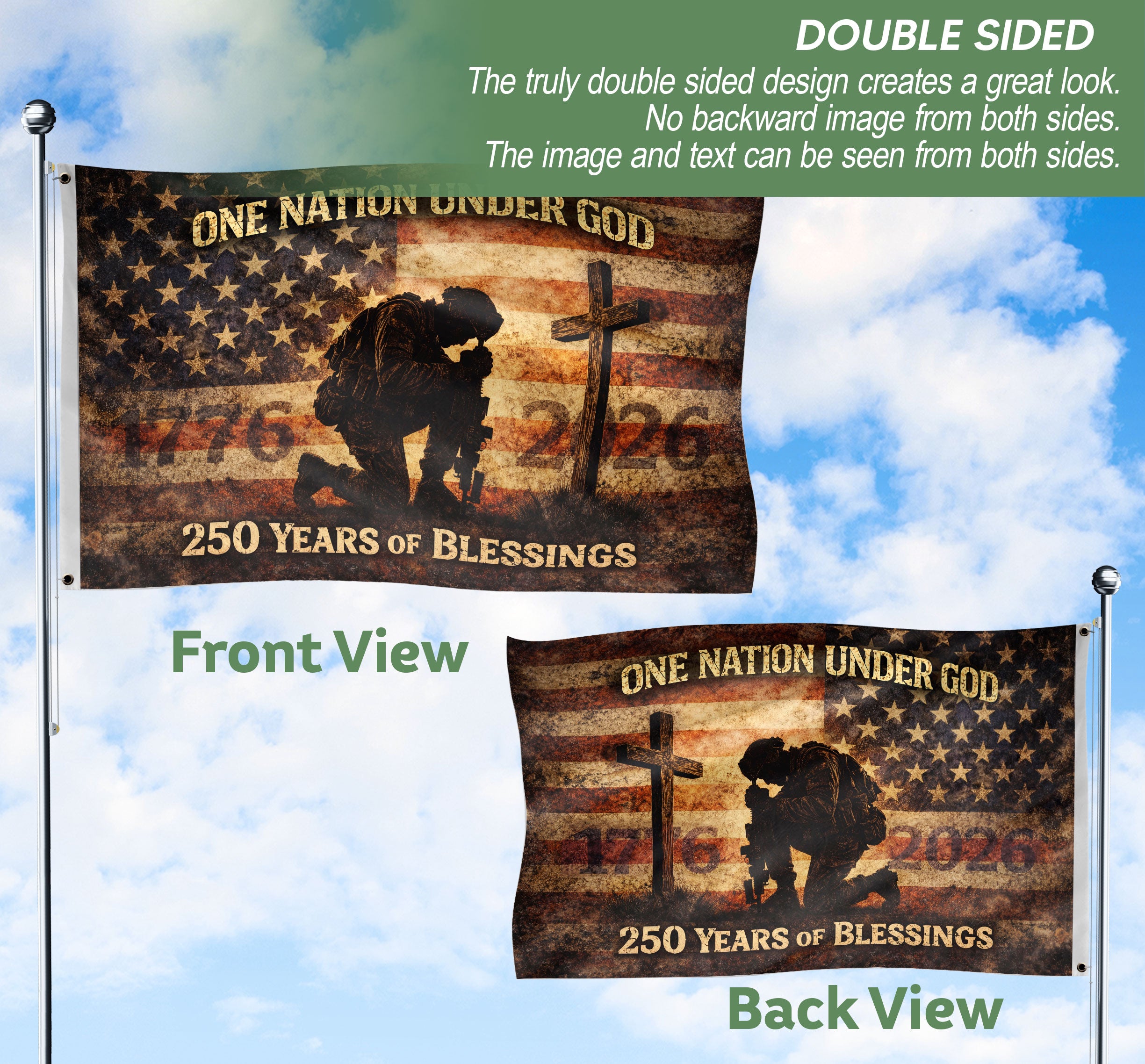 Celebrate 250 years of American independence with this commemorative soldier flag spanning 1776-2026. This double-sided outdoor banner honors the revolutionary war heritage and modern military service, featuring patriotic soldier imagery blended with the iconic American flag design. Crafted from durable, weather-resistant polyester fabric, it withstands wind, rain, and sun for long-lasting display. Perfect for patriotic events, Fourth of July celebrations, veterans memorials, home porches, flagpoles, or parades. The vibrant print on both sides ensures clear visibility from any angle, symbolizing generations of courage, strength, and devotion to liberty. Easy to hang with reinforced grommets. Measures standard flag size for versatile use. Proudly display this unique piece of military history and American pride.