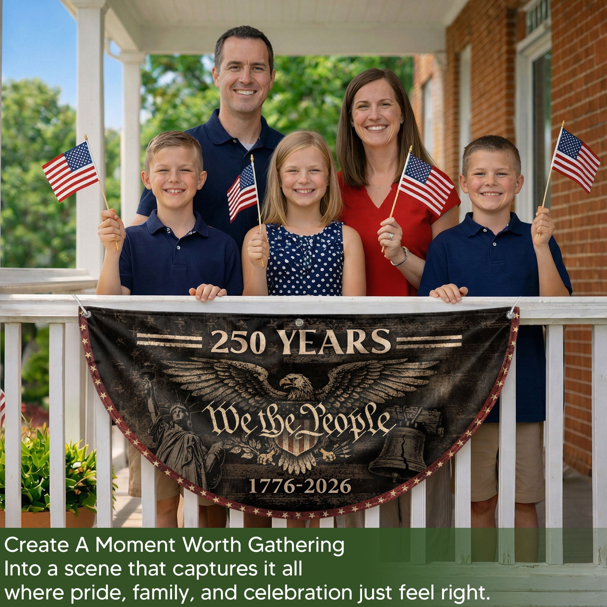 Celebrate America’s 250th anniversary with this durable fence flag featuring a vintage We The People design, majestic eagle, and 1776-2026 timeline. Crafted from high-quality, weather-resistant polyester fabric, this patriotic banner withstands outdoor elements for long-lasting display. Perfect for fences, gardens, porches, patios, or holiday decorations. Measures standard fence size for easy attachment with grommets or clips. Bring timeless American pride and historical significance to your home or event space. Ideal for Independence Day, Memorial Day, Fourth of July, or everyday patriotic expression.
