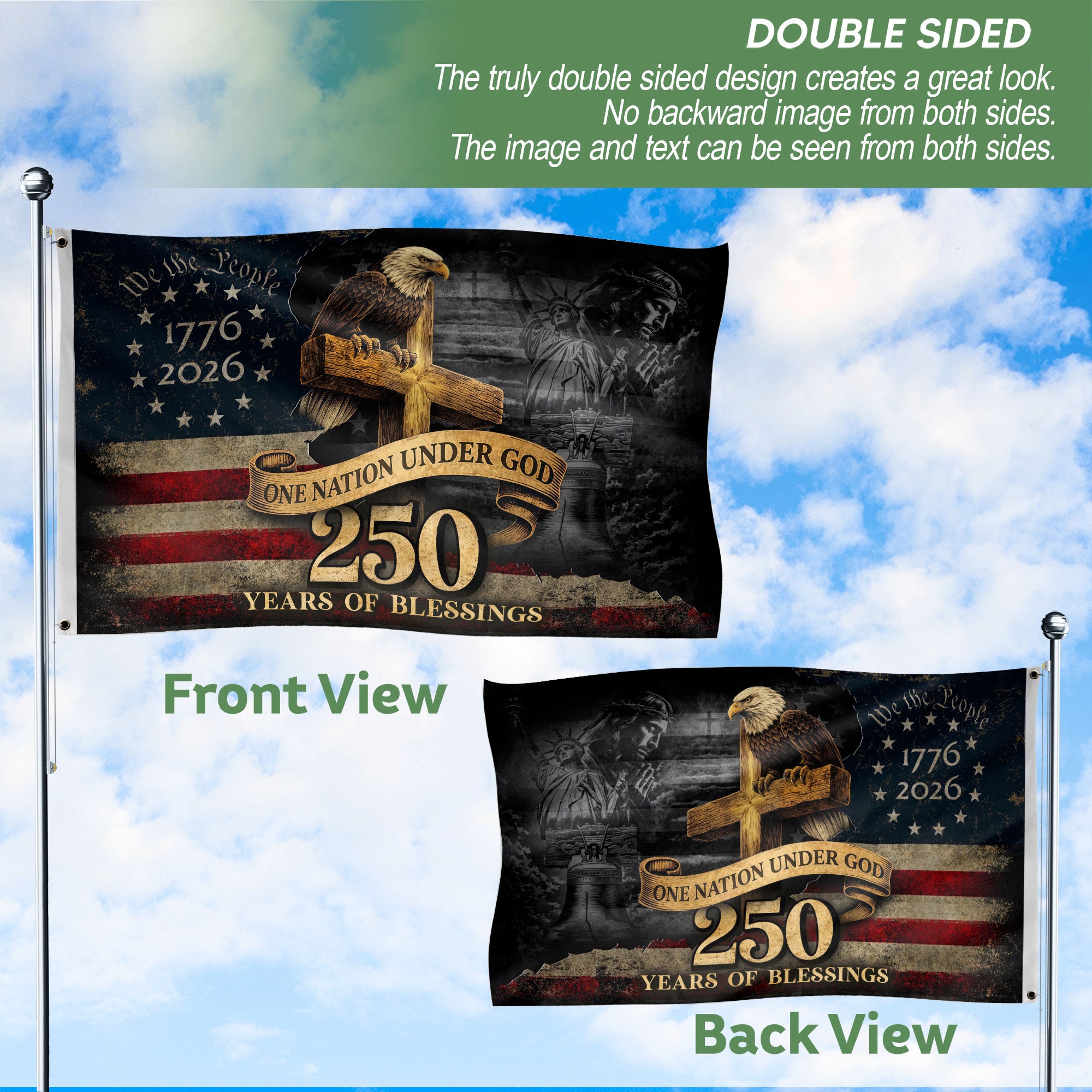 Celebrate 250 years of American liberty and Christian faith with the 250 Years of Blessings American Flag. This patriotic flag honors the historic milestone from 1776 to 2026, blending national pride with spiritual devotion. Featuring a striking design that incorporates the iconic stars and stripes with meaningful Christian blessings, it’s perfect for displaying at home, in your yard, or during patriotic events like the 4th of July, Memorial Day, or Independence Day celebrations. Crafted from durable, weather-resistant polyester fabric, this double-sided flag ensures vibrant colors and clear graphics that withstand wind and outdoor elements. The high-quality stitching and reinforced grommets make it easy to hang on flagpoles, porches, or walls. Ideal for patriots, Christians, veterans, and history enthusiasts who value unity, freedom, and divine providence. Show your support for America’s semiquincentennial with this unique Christian patriotic flag that inspires reflection on our nation’s enduring blessings.