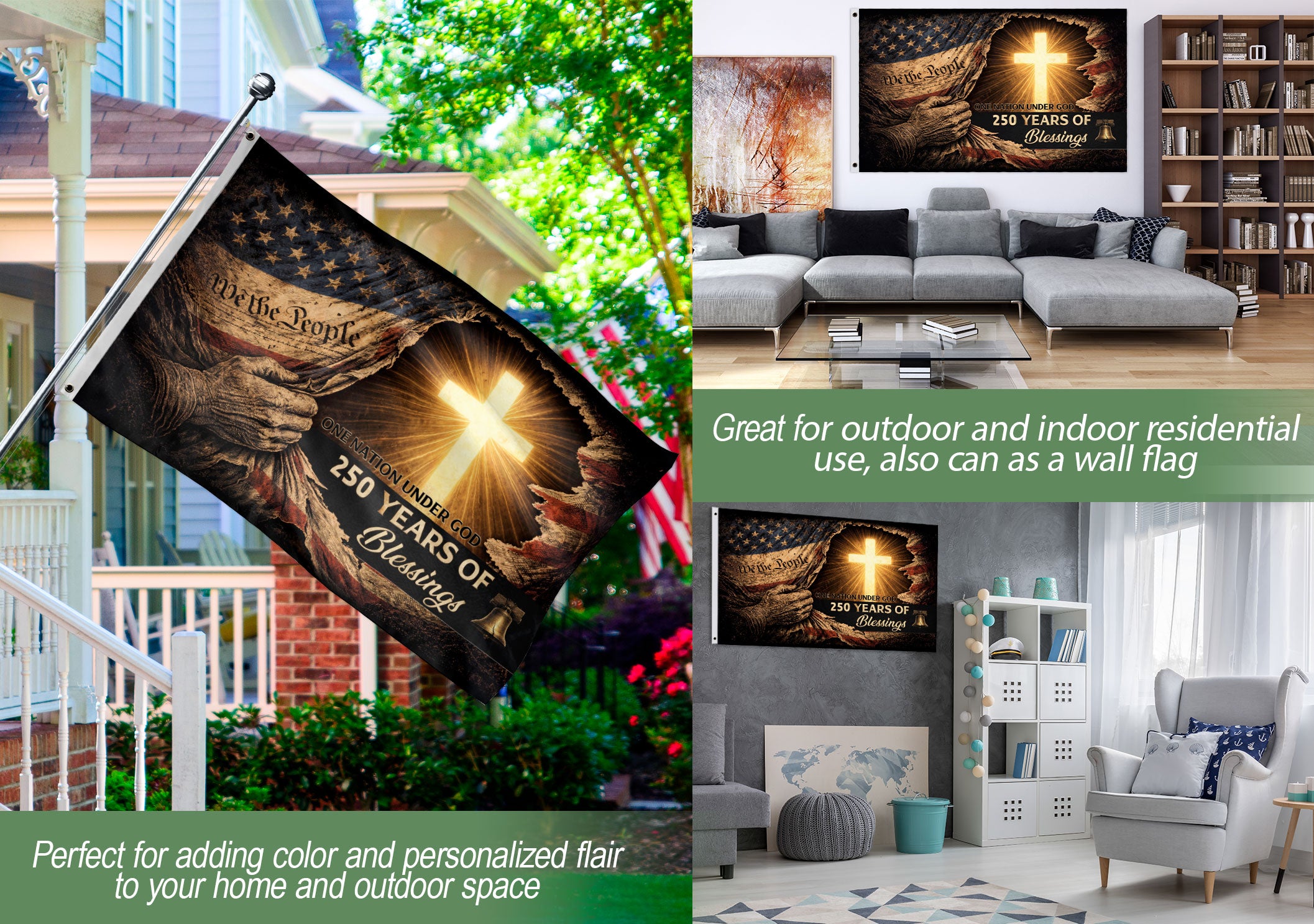 Celebrate 250 years of American freedom and faith with this commemorative 250 Years of Blessings Flag. Featuring a powerful Christian American design with ‘One Nation Under God’ messaging, this patriot US flag banner honors our nation’s heritage, gratitude, and enduring spirit guided by divine providence. Perfect for displaying at home, events, or patriotic gatherings, it serves as a meaningful tribute to the principles that have shaped the USA for two and a half centuries. Crafted for durability and vibrant colors, this flag combines religious devotion with national pride, making it an ideal symbol for Christians, veterans, and lovers of American history.