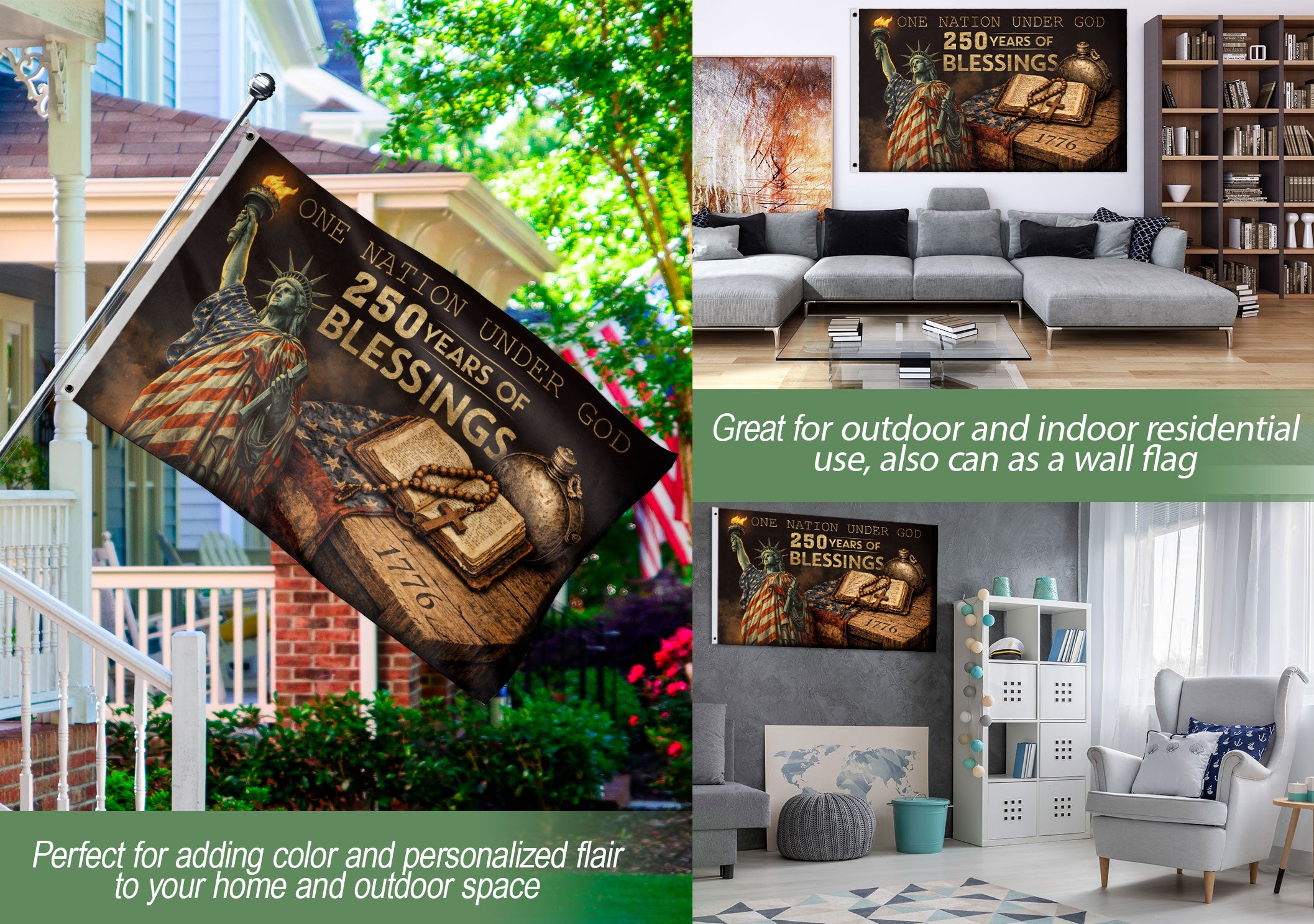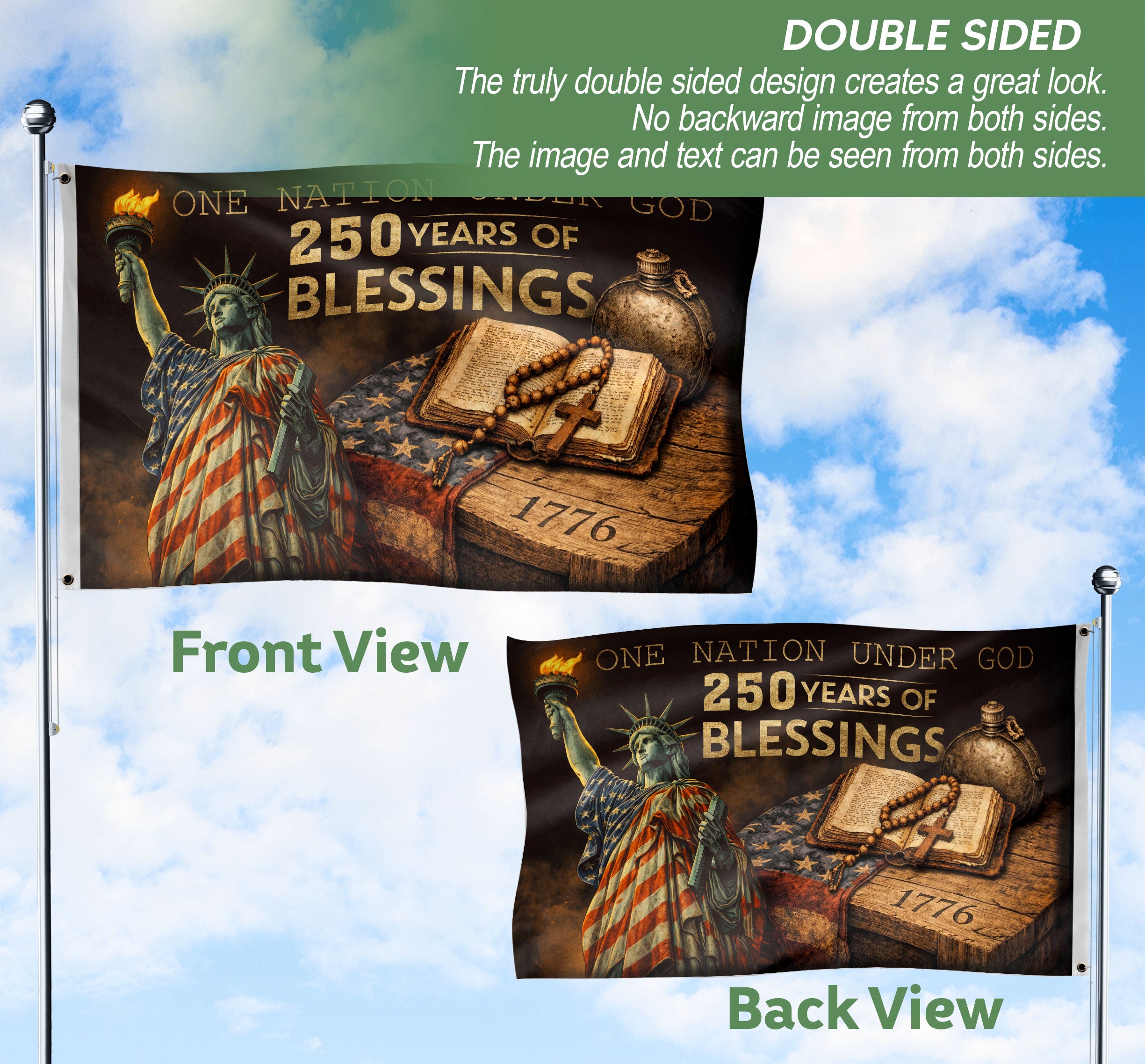 Celebrate 250 years of American independence from 1776 to 2026 with this patriotic Christian cross flag. Featuring the iconic Statue of Liberty, an open Bible topped with a prominent cross, prayer beads, and the inspiring message ‘One Nation Under God – 250 Years of Blessings,’ this flag honors the nation’s spiritual heritage, faith in Christ, and gratitude for divine providence. Crafted from high-quality, weather-resistant polyester fabric, it withstands wind, rain, and sun exposure for reliable outdoor performance. Double-stitched edges and reinforced grommets provide durability and secure mounting on poles or brackets. Perfect for gardens, yards, porches, Fourth of July celebrations, anniversaries, church gatherings, or patriotic events. Ideal for homeowners, veterans, churches, and anyone proud of America’s Christian roots. Standard flag size ensures easy display and long-lasting use as a meaningful outdoor banner.