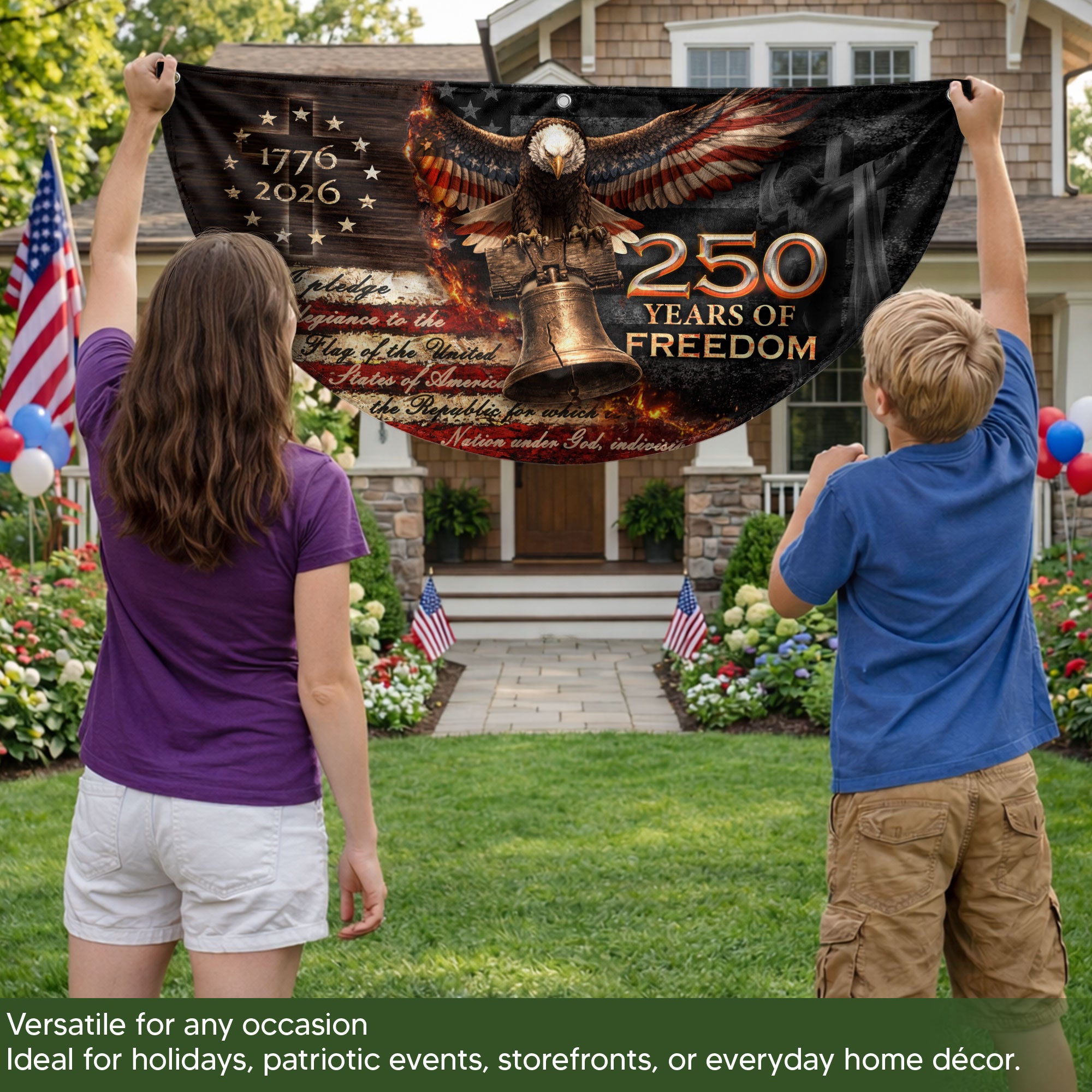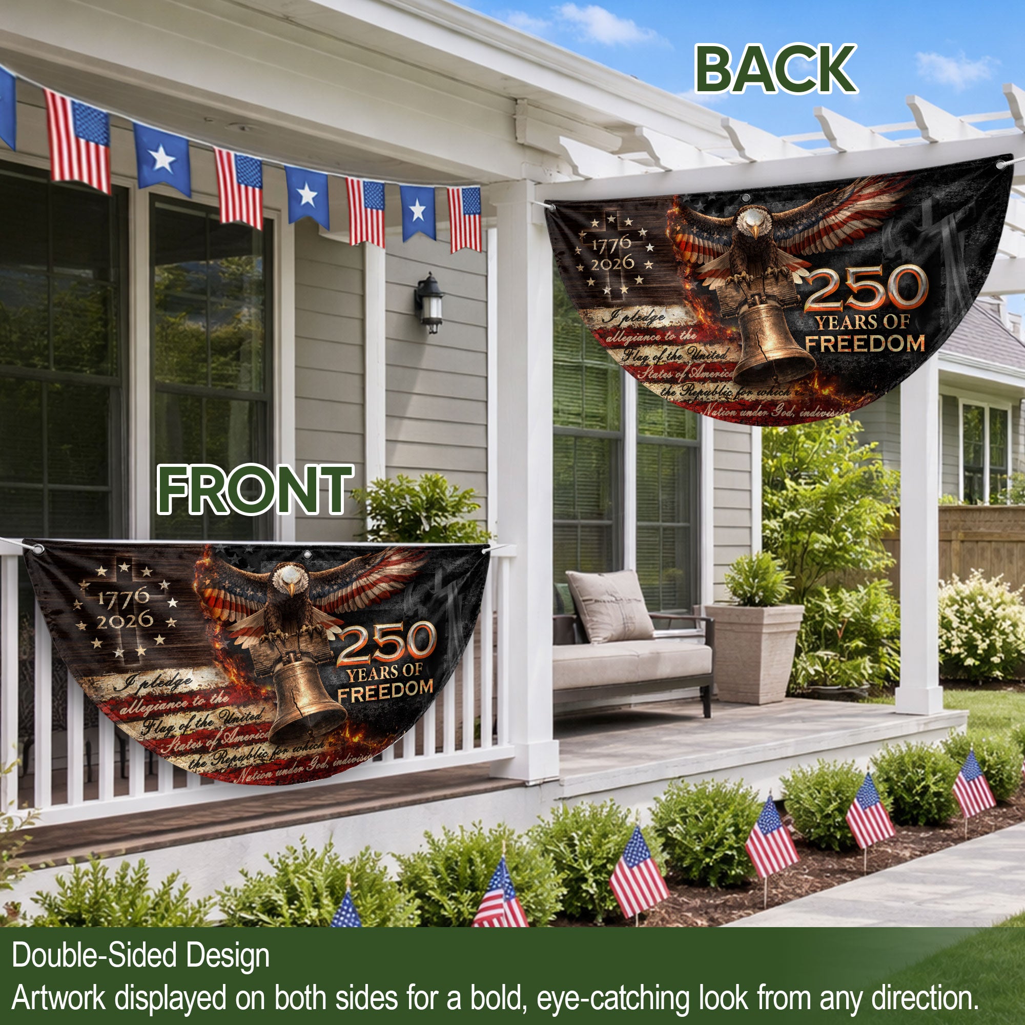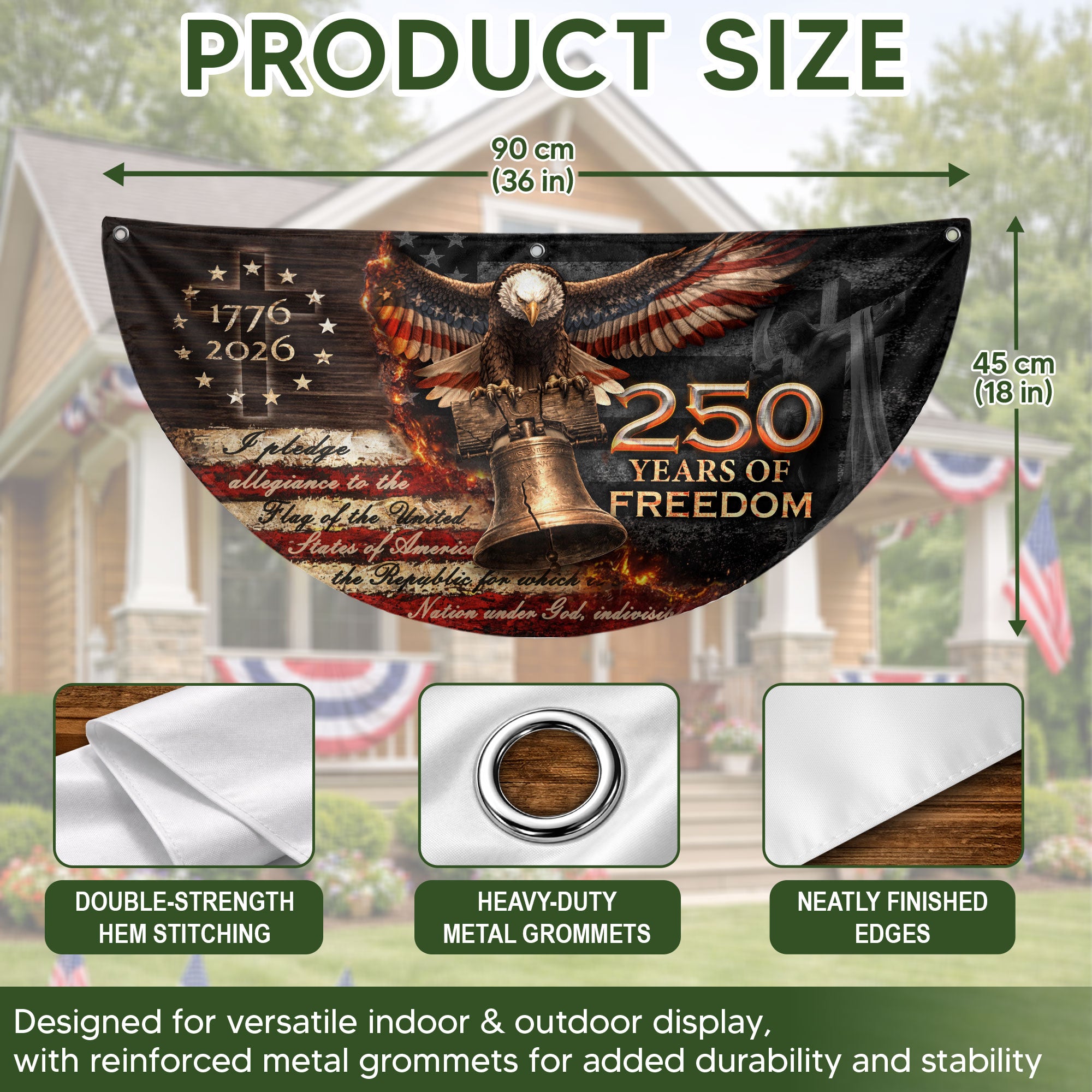 Celebrate 250 years of American freedom with this 1776-2026 fence flag banner. Featuring a powerful Christian cross and the iconic Liberty Bell, this double-sided design honors faith, patriotism, and the enduring spirit of liberty. Perfect for displaying on fences, porches, or gardens to showcase your devotion to heritage and USA pride. Crafted for durability, the high-quality printed fabric withstands outdoor conditions while vividly capturing the essence of American history and Christian values. Ideal for Independence Day, patriotic holidays, or everyday display of national commitment.