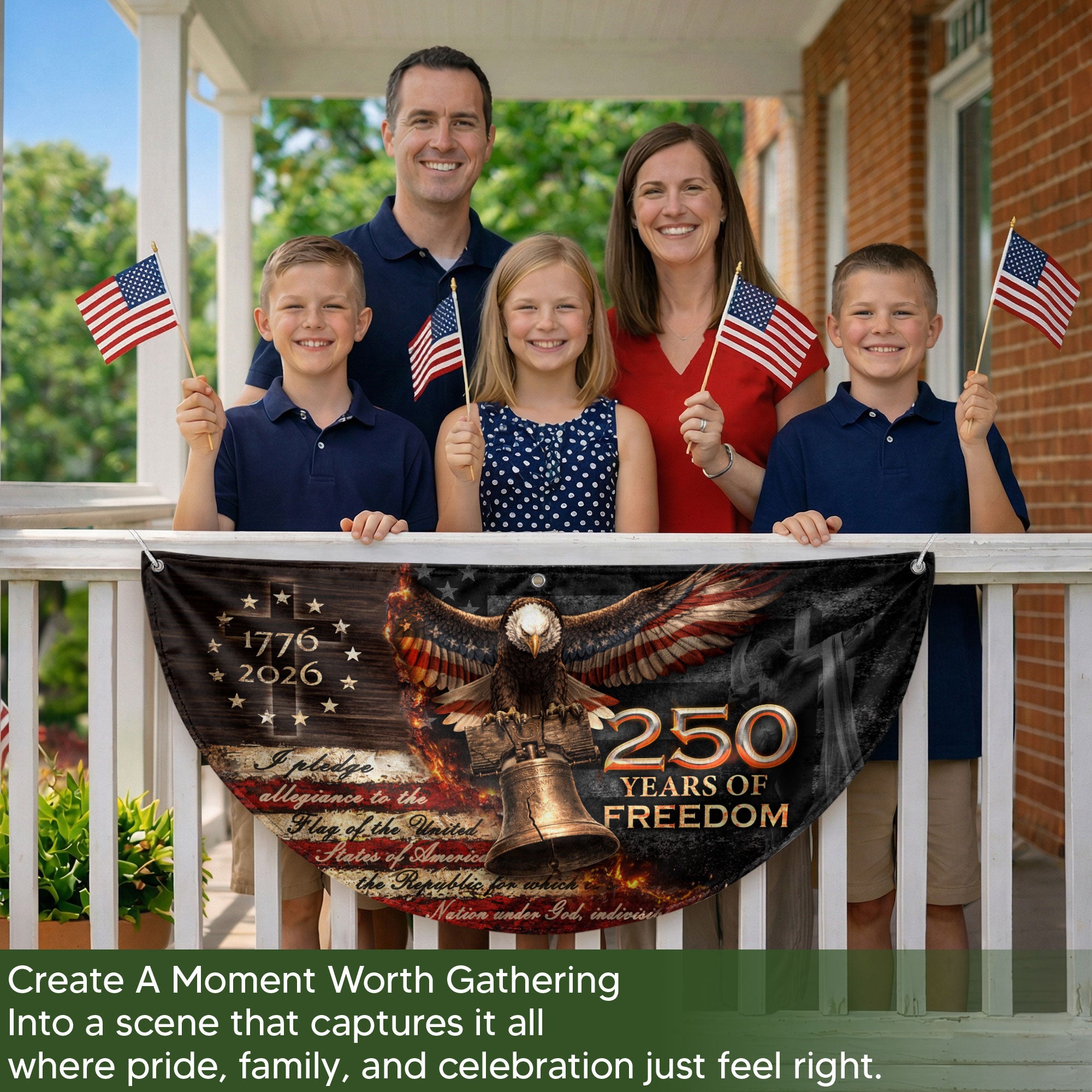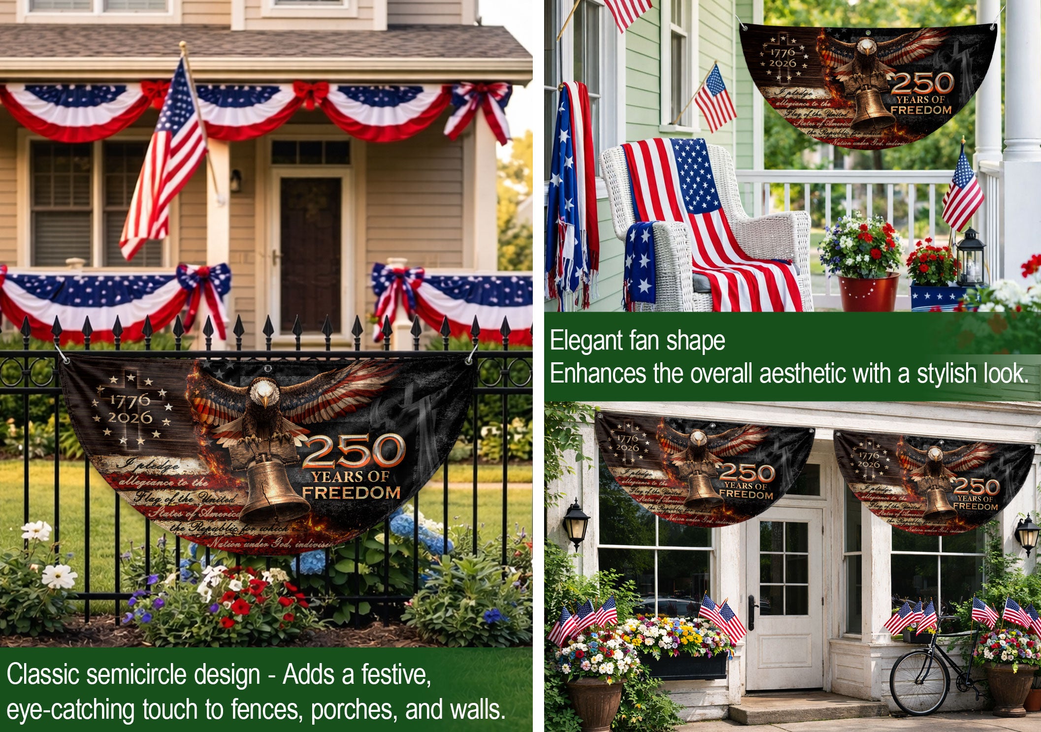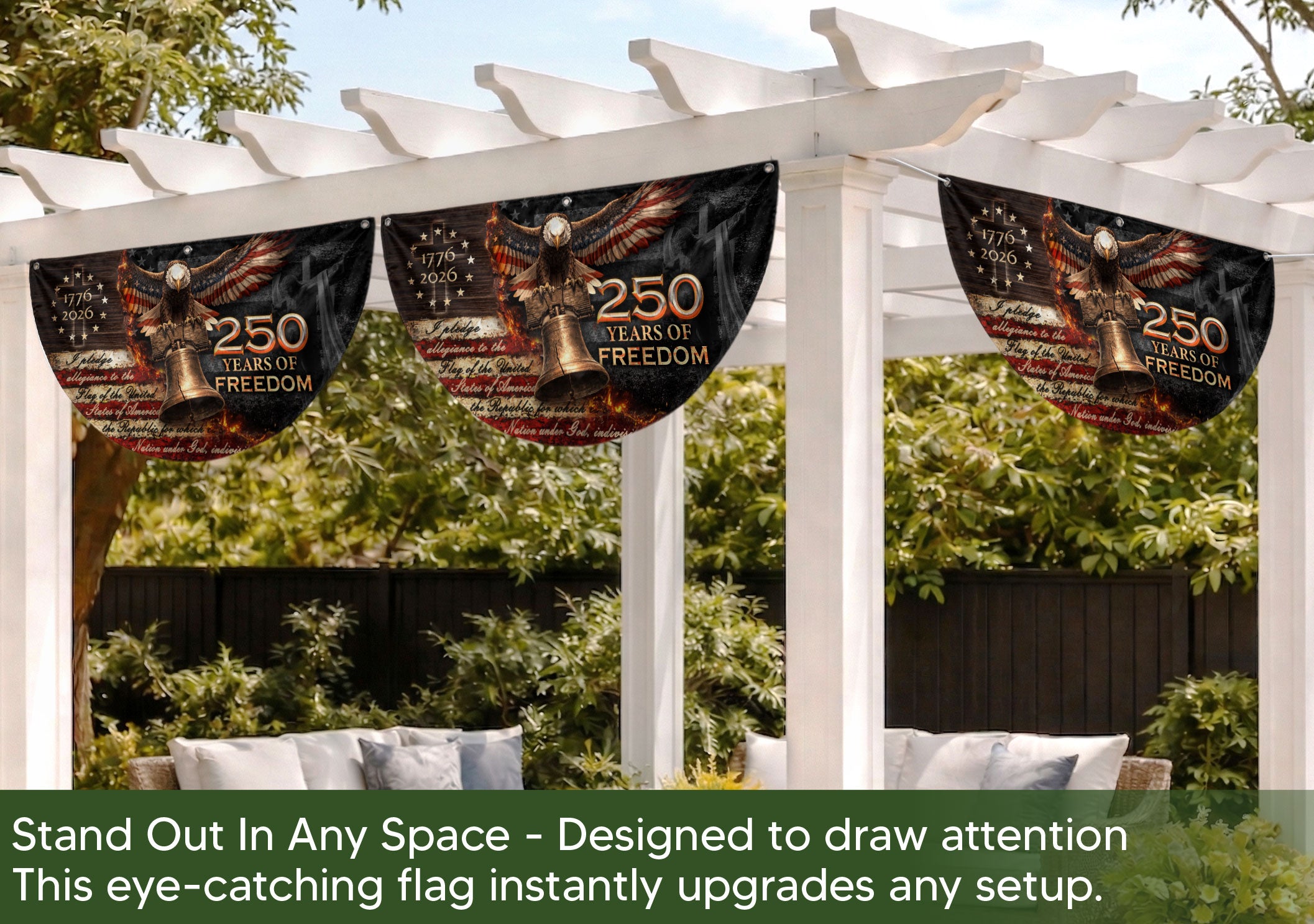 Celebrate 250 years of American freedom with this 1776-2026 fence flag banner. Featuring a powerful Christian cross and the iconic Liberty Bell, this double-sided design honors faith, patriotism, and the enduring spirit of liberty. Perfect for displaying on fences, porches, or gardens to showcase your devotion to heritage and USA pride. Crafted for durability, the high-quality printed fabric withstands outdoor conditions while vividly capturing the essence of American history and Christian values. Ideal for Independence Day, patriotic holidays, or everyday display of national commitment.