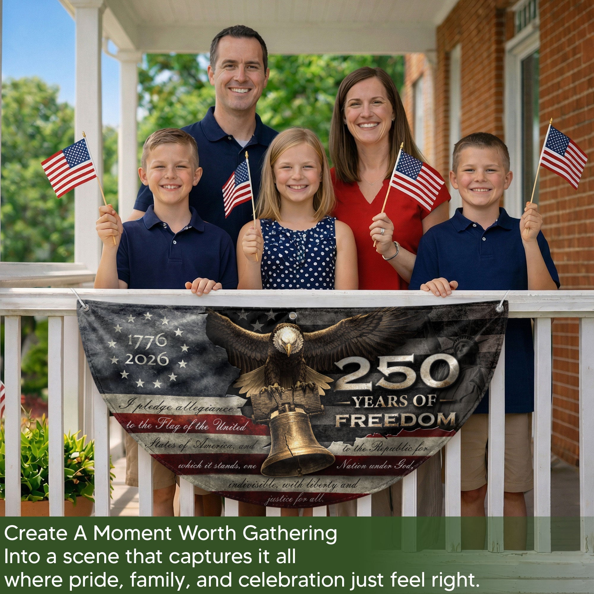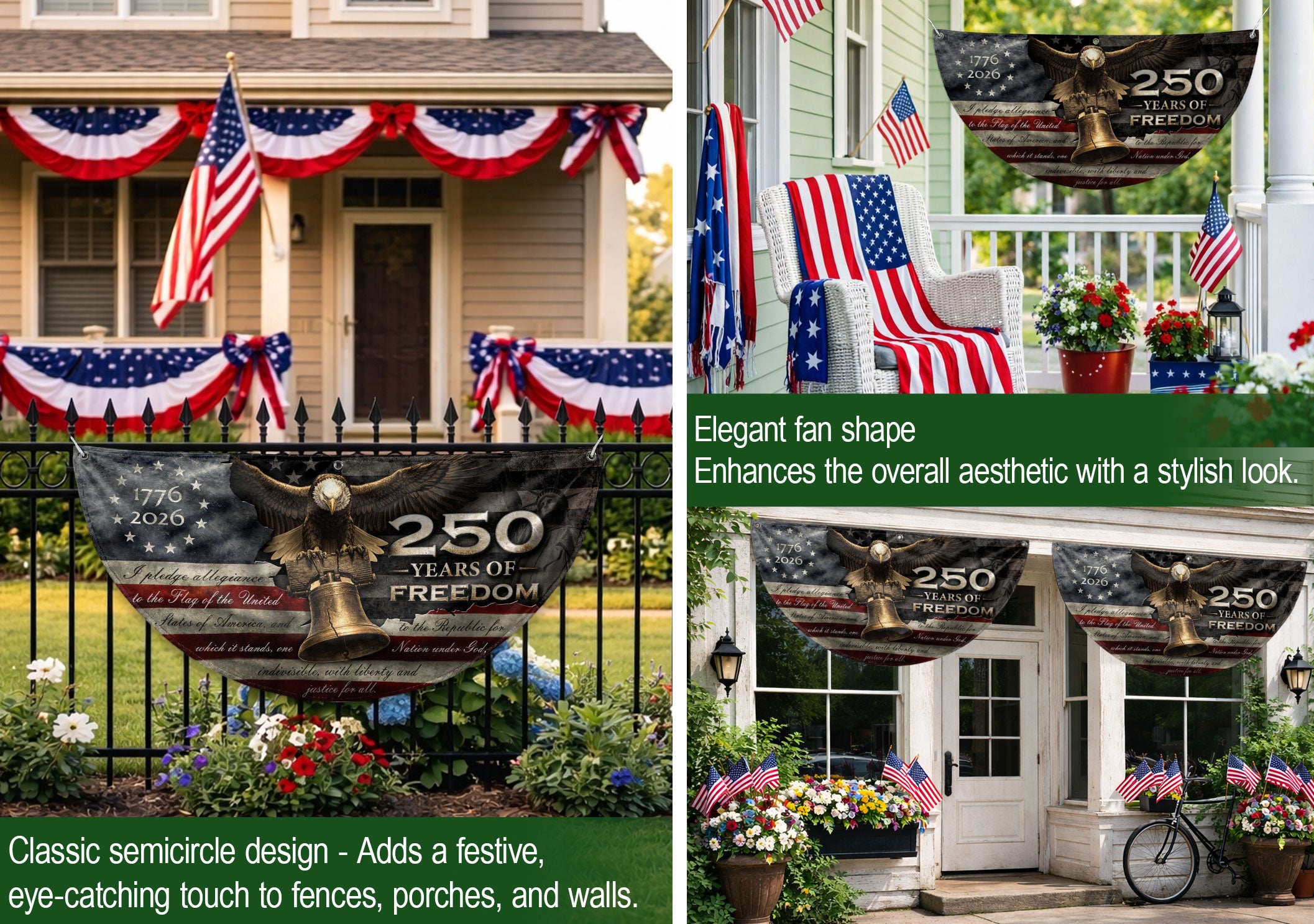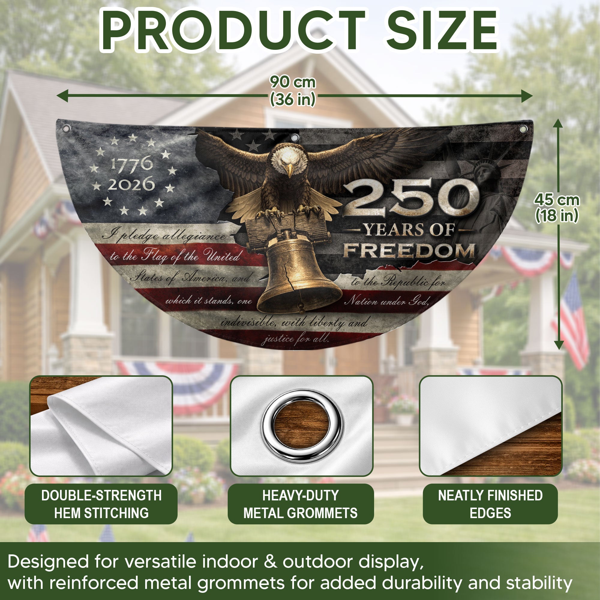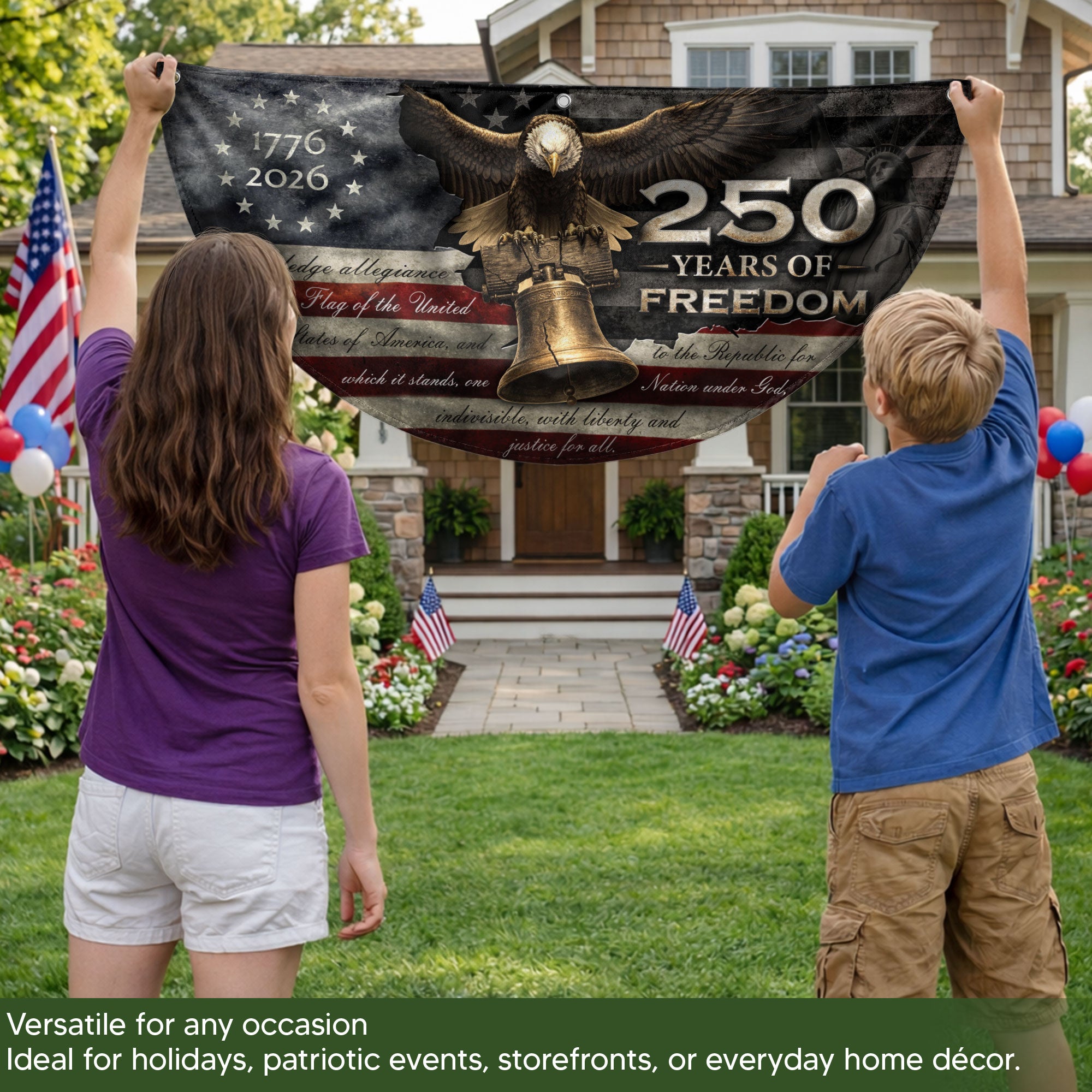 Celebrate America’s 250th anniversary with this 250 Years of Freedom Fence Flag, spanning 1776-2026. This patriotic banner showcases a majestic Bald Eagle perched atop the iconic Liberty Bell, framed by the stars and stripes of the American flag and the powerful ‘We The People’ preamble from the Constitution. Perfect for fence display, porch decor, or outdoor patriotic events, this durable banner honors the nation’s founding principles and historic milestone. Crafted with high-quality materials for vibrant colors and weather resistance, it’s an essential piece for patriots, history enthusiasts, and Fourth of July celebrations.