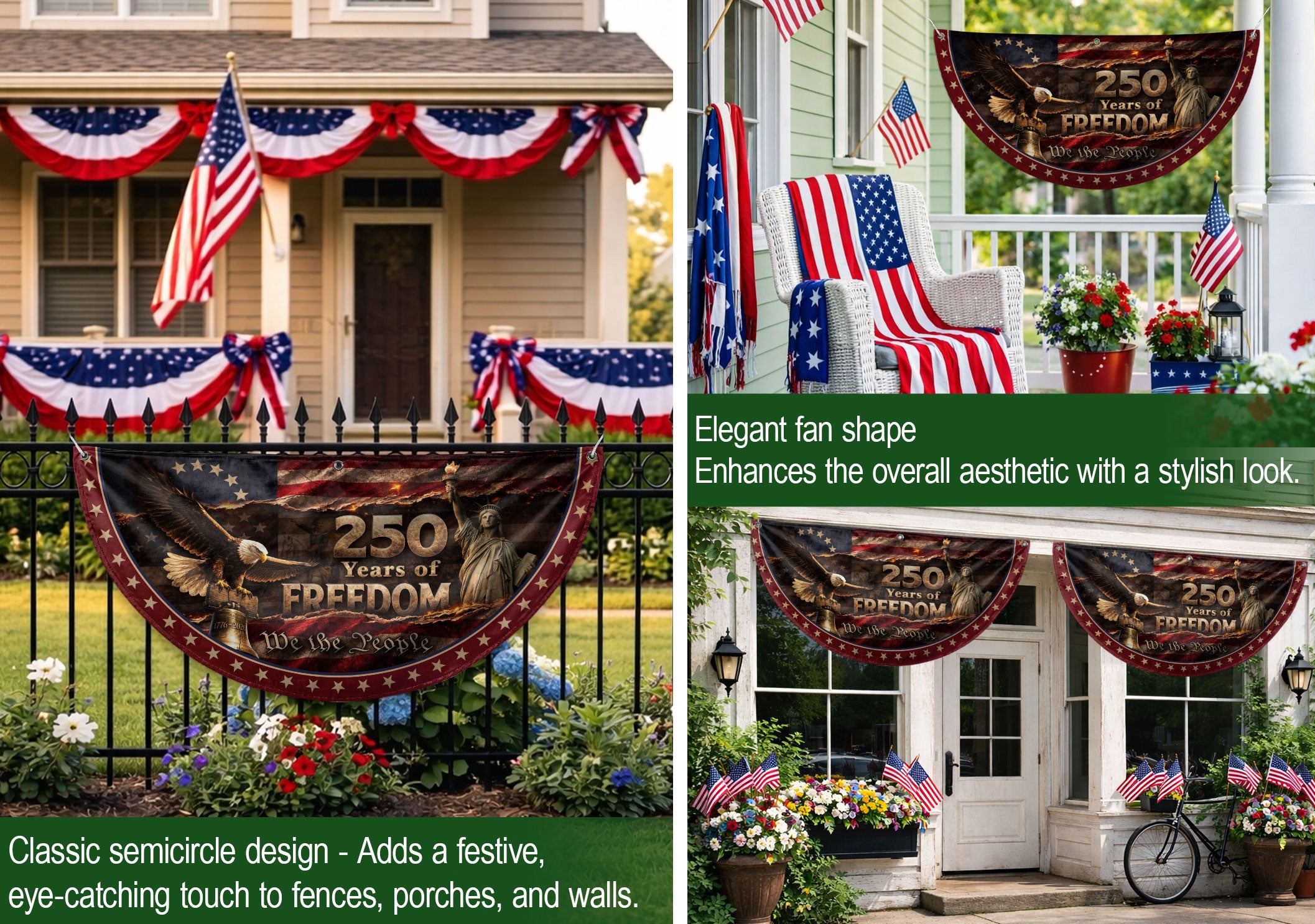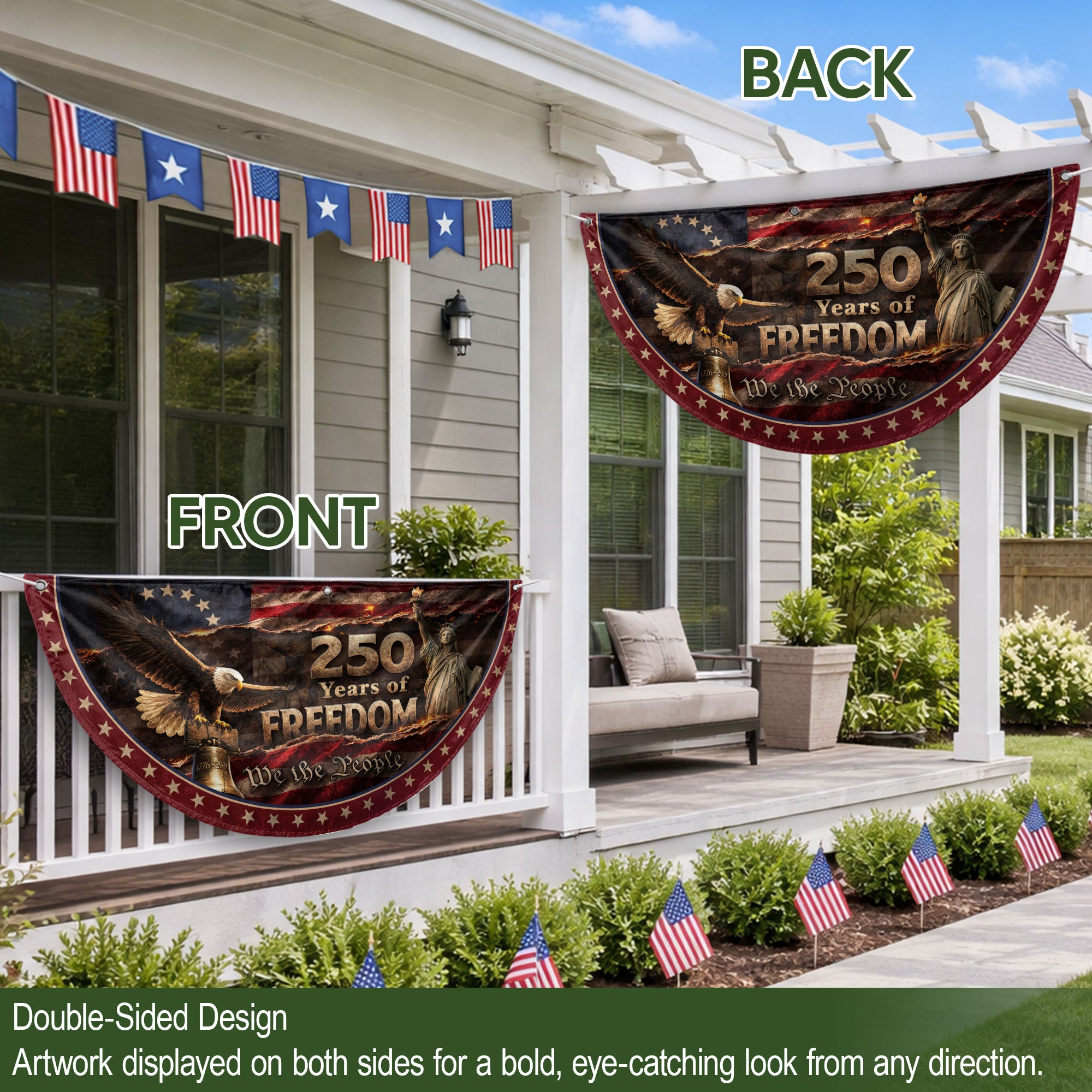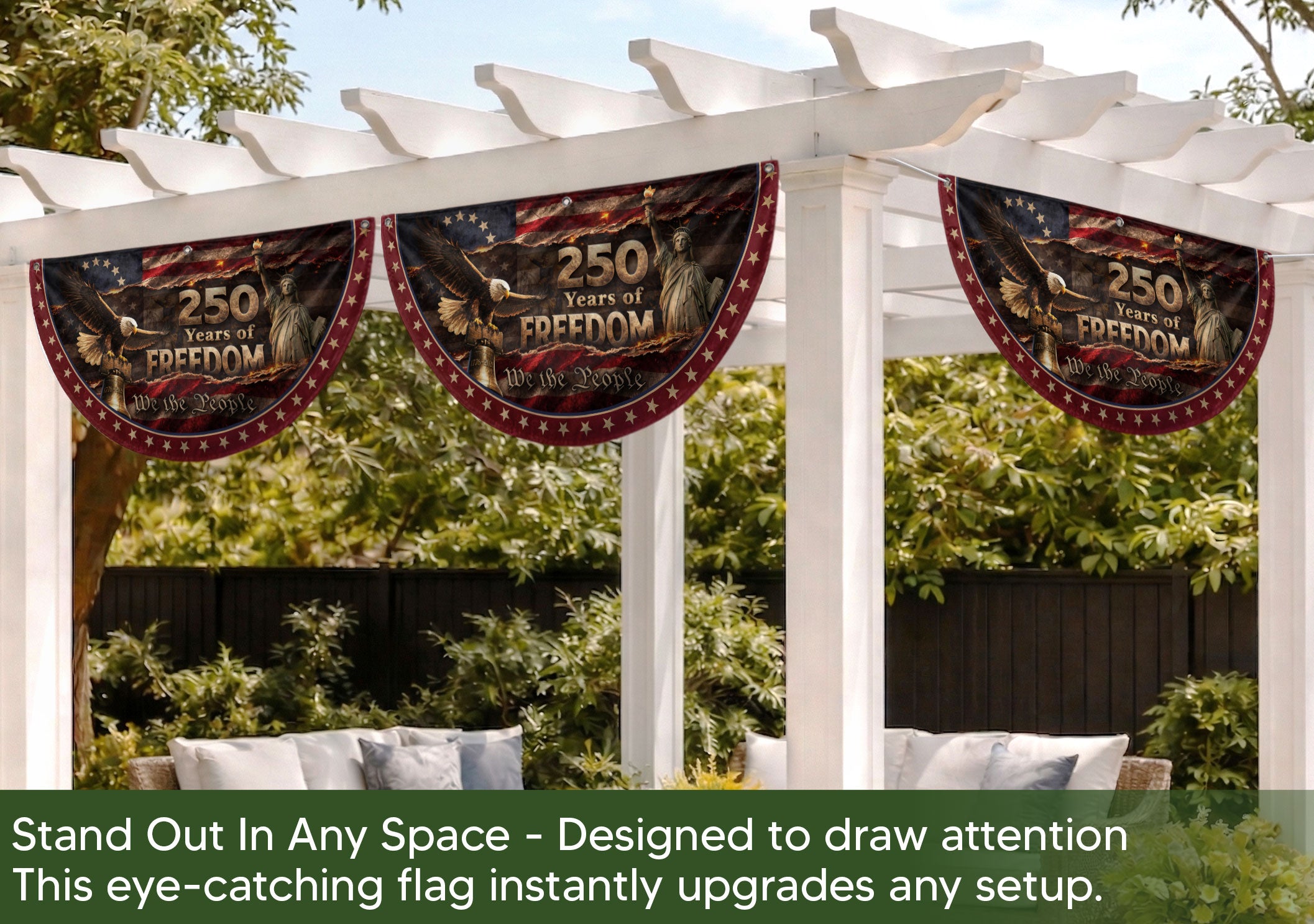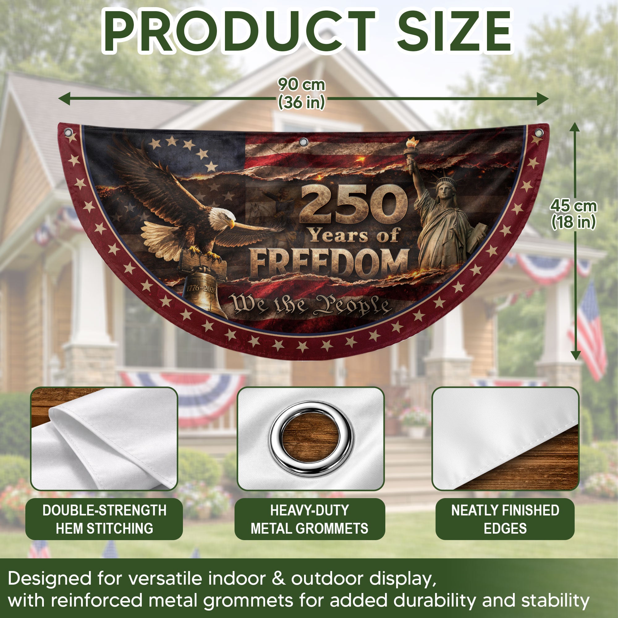 Celebrate 250 years of American freedom with this premium fence flag. Featuring the iconic Statue of Liberty, a majestic bald eagle, and the historic Liberty Bell against a vintage flag backdrop, this flag proudly displays ‘We The People.’ Crafted for durability, it’s designed for outdoor display on fences, porches, or gardens. Made from high-quality, weather-resistant polyester fabric with double-sided printing for vibrant colors that withstand wind, rain, and sun. Perfect for patriots showing national pride during the 250th anniversary, Independence Day, or everyday display. Easy to attach with included hardware. Symbolizes liberty, unity, and American heritage.