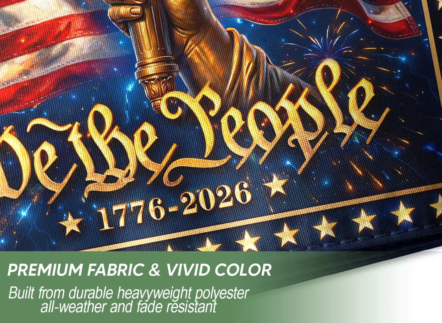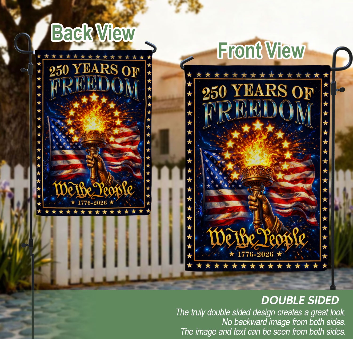 Celebrate America’s 250th anniversary with this striking 250 Years of Freedom house flag. Featuring a blazing torch, iconic American flag elements, and the powerful ‘We The People’ design, this patriotic banner symbolizes unity, independence, and national pride from 1776 to 2026. Perfect for displaying on your front porch, garage, or home exterior to honor historical milestones, holidays like the 4th of July, or everyday patriotism. Crafted from durable, weather-resistant polyester fabric with vibrant, fade-resistant colors that withstand sun, wind, and rain. Double-sided printing ensures bold visibility from both sides. Easy to hang with a standard house flag pole sleeve or grommets. Measures standard house flag size for optimal display. Ideal for history enthusiasts, veterans, and anyone proud of American heritage. Make a powerful statement about freedom and the enduring spirit of the USA.
