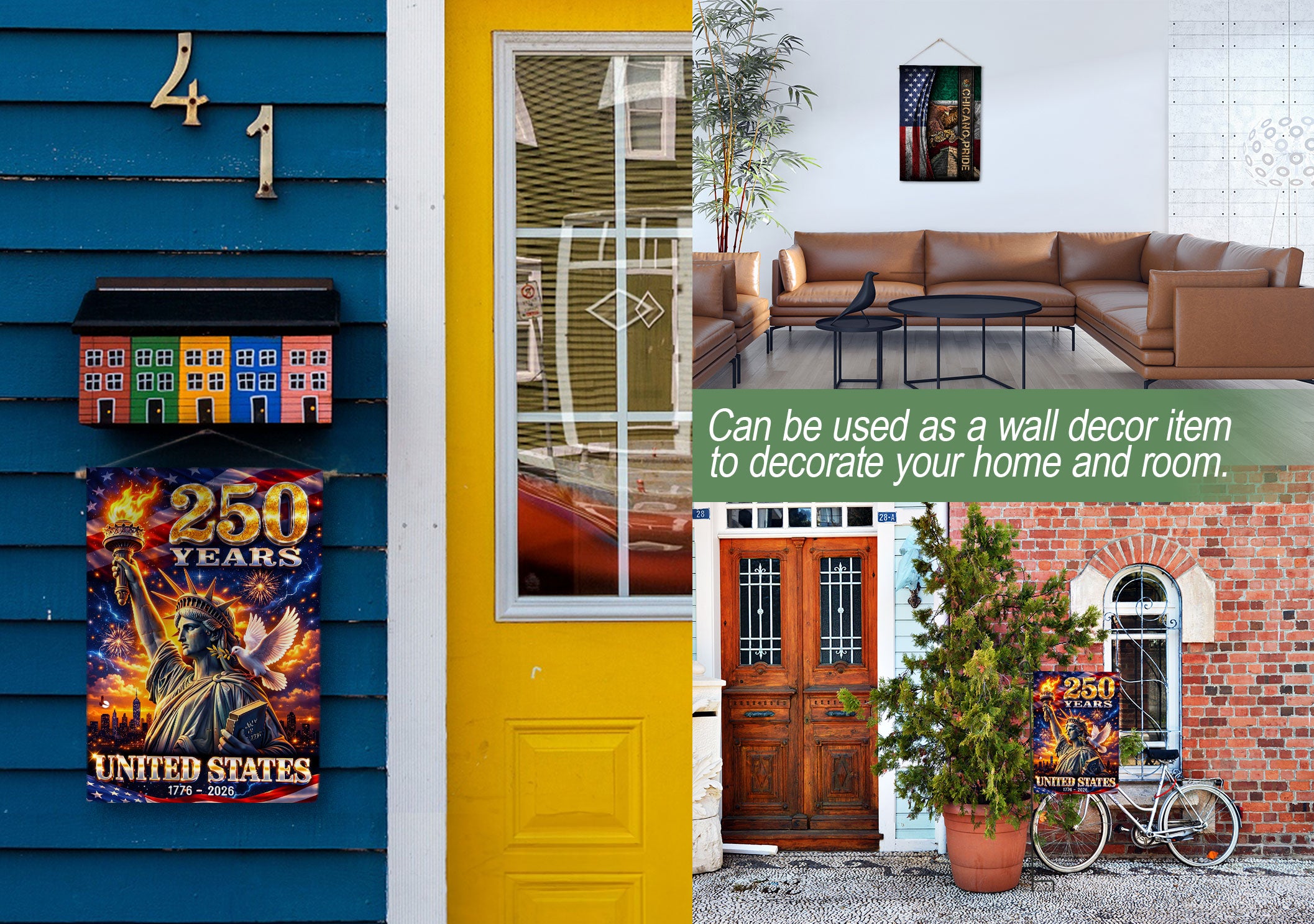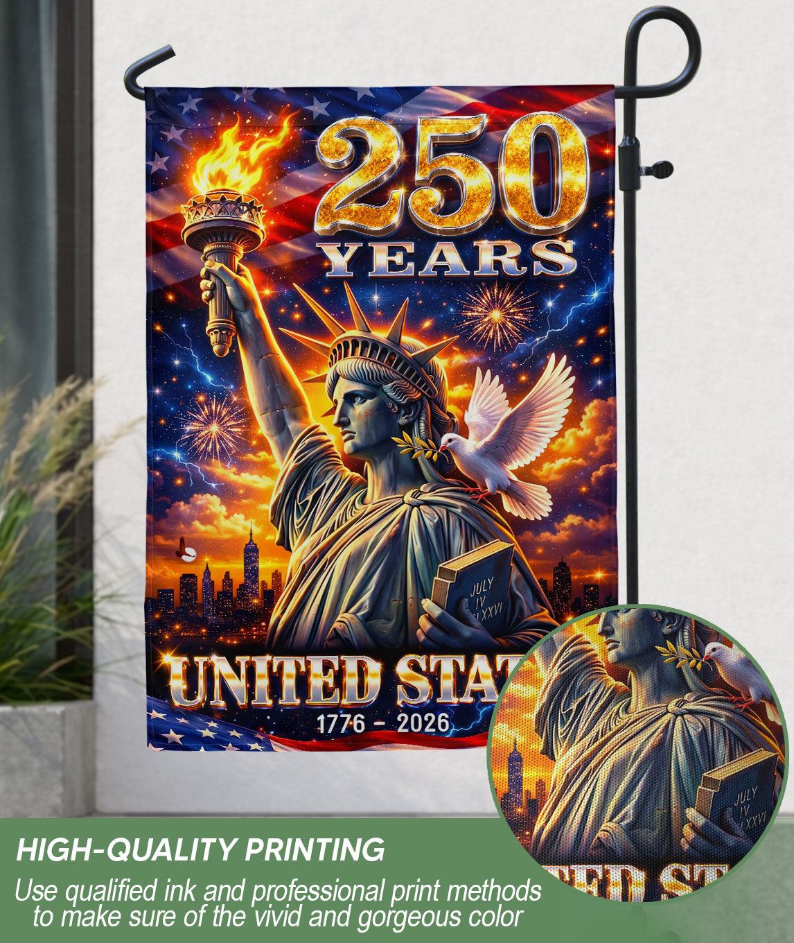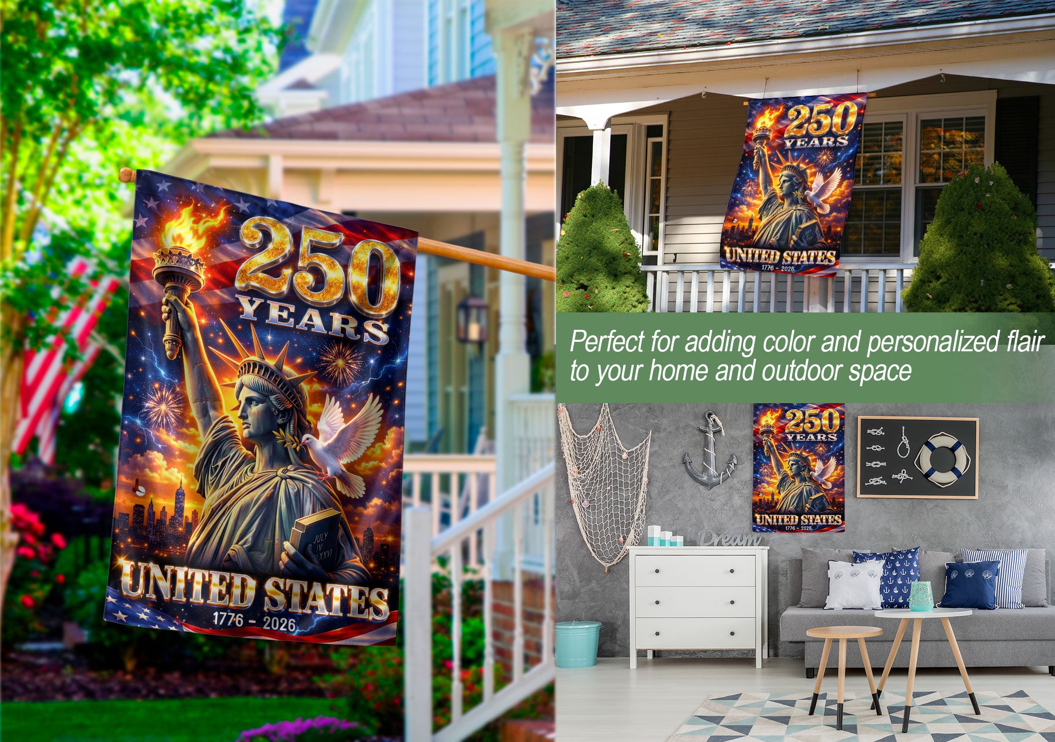 Celebrate 250 years of American independence with this striking house flag featuring the iconic Statue of Liberty holding a glowing torch, surrounded by bold patriotic elements. Perfect for displaying on your porch, garage, or garden during the 1776-2026 anniversary celebrations, Fourth of July events, or as an everyday symbol of hope, unity, and freedom. Crafted from durable, weather-resistant polyester fabric with vibrant double-sided printing that withstands wind, rain, and sun. Double-stitched edges and premium brass grommets ensure easy hanging on flag poles or brackets. Measures standard house flag size for maximum visual impact. Ideal for patriots, history enthusiasts, and homeowners wanting to showcase national pride.