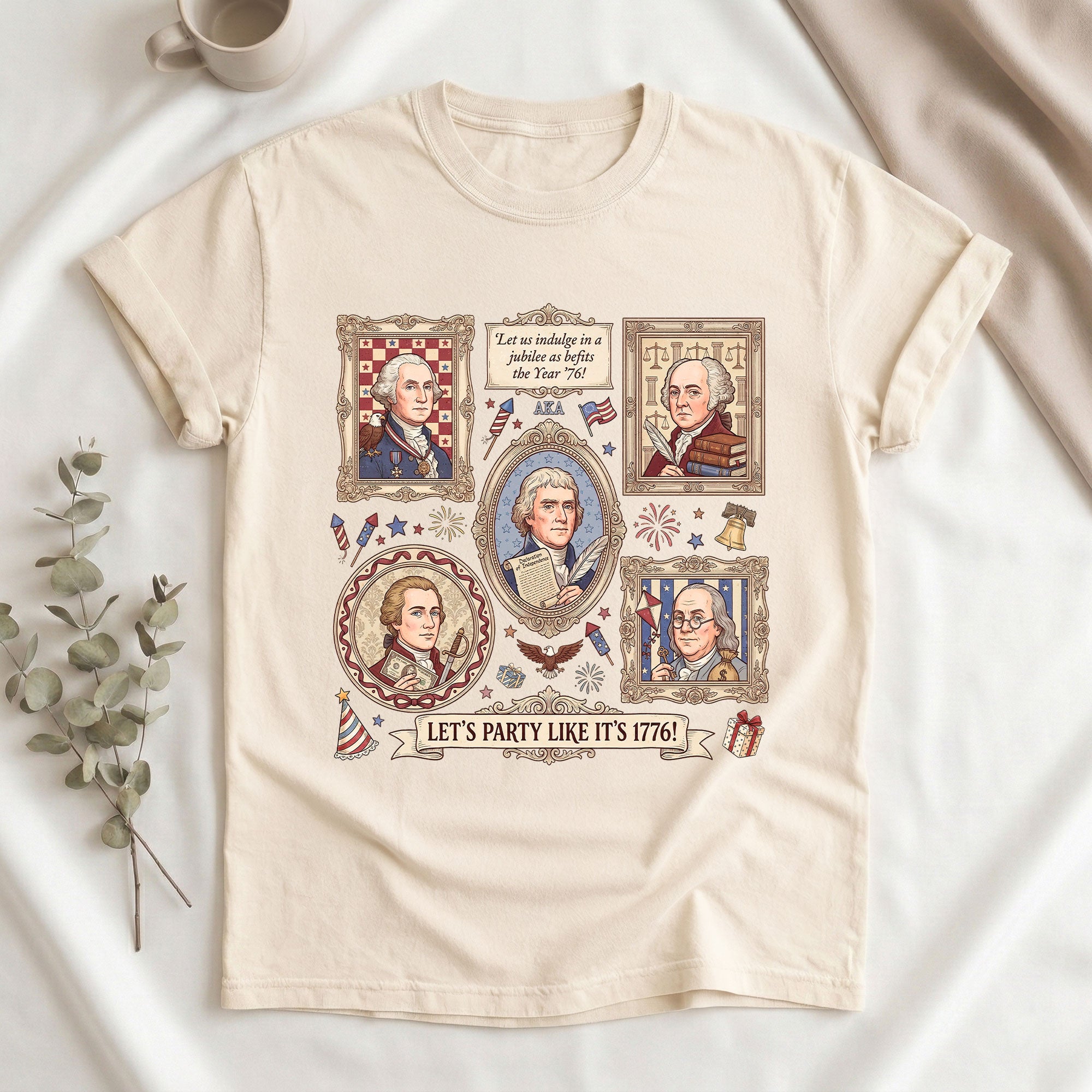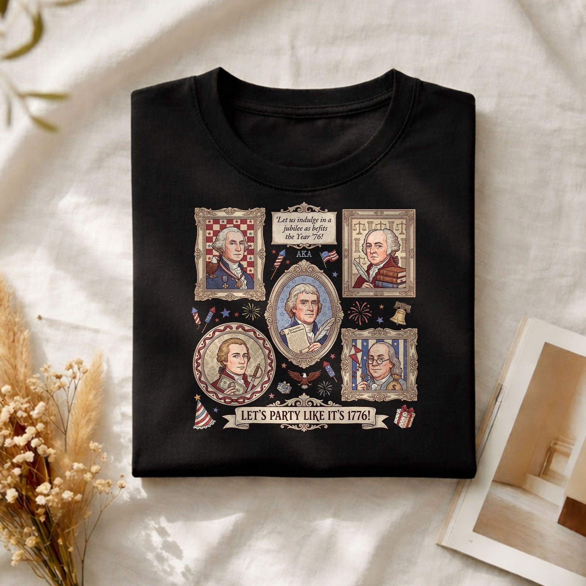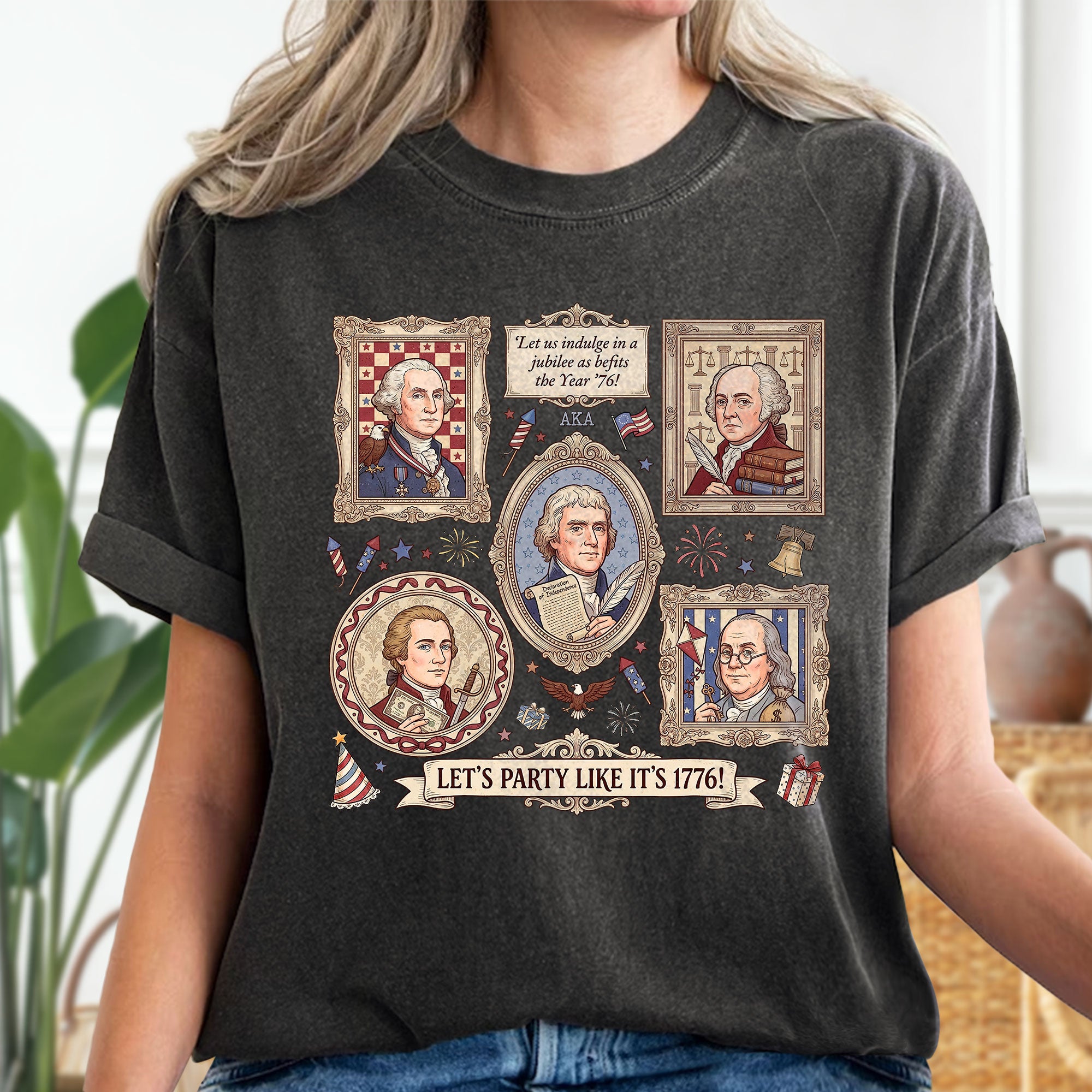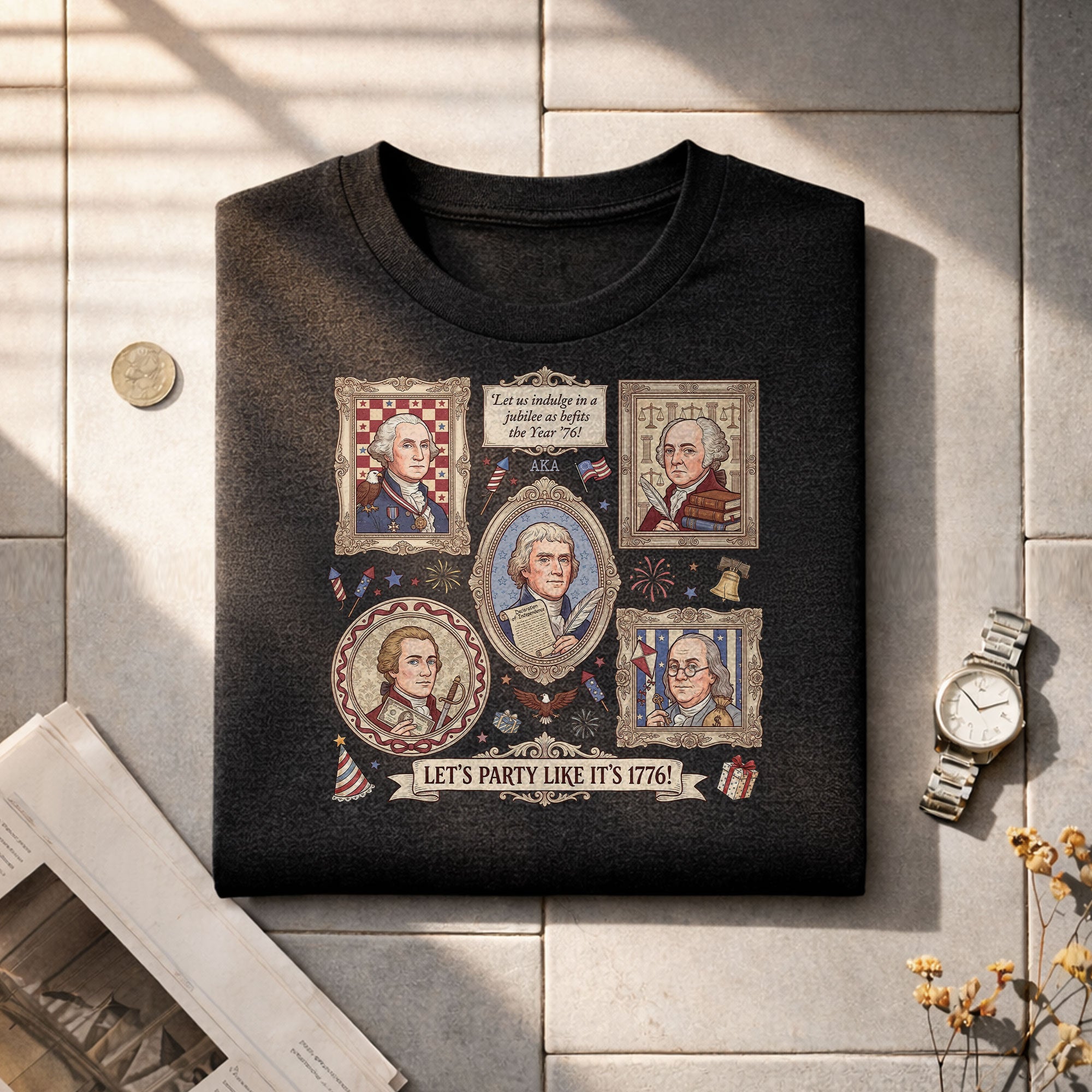 Vintage Founding Fathers 1776 T-shirt featuring classic American history artwork and the phrase “Let’s Party Like It’s 1776.” Perfect for Independence Day, patriotic celebrations, and history lovers.