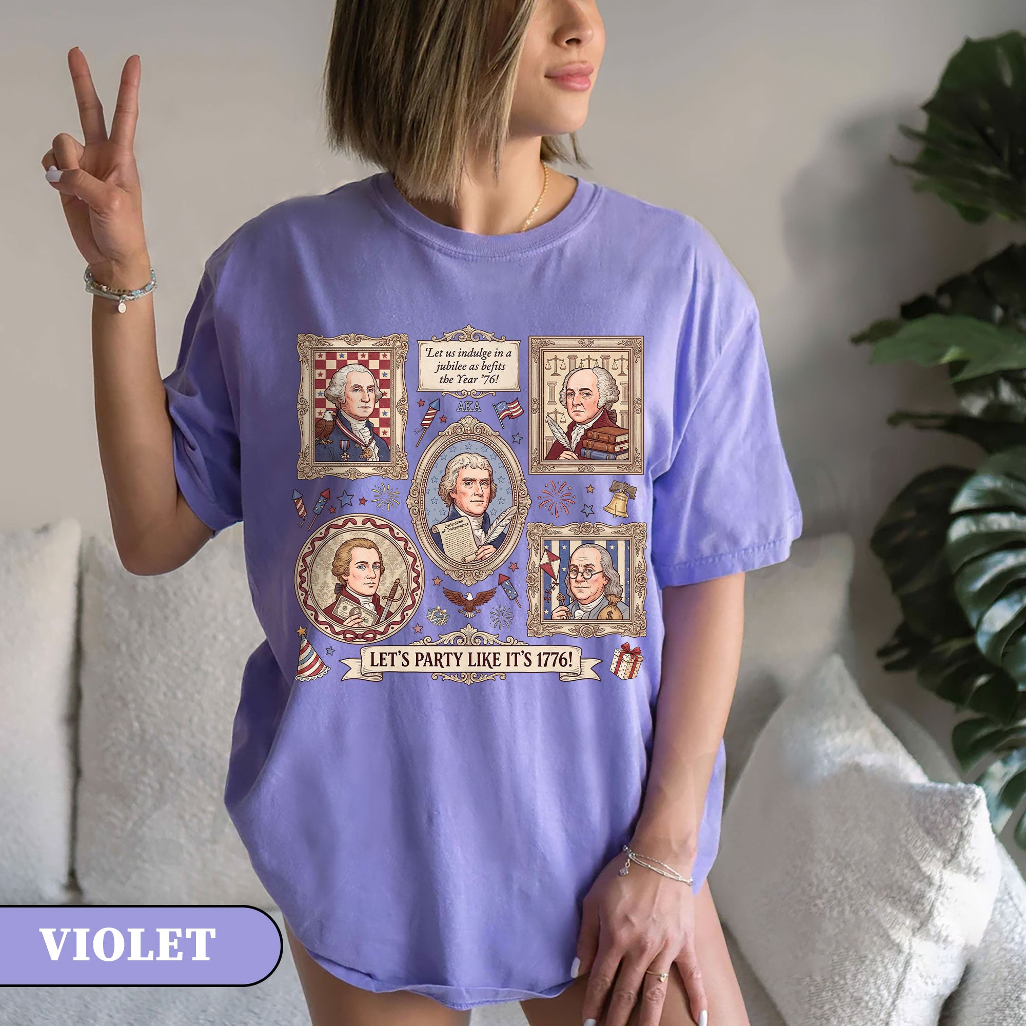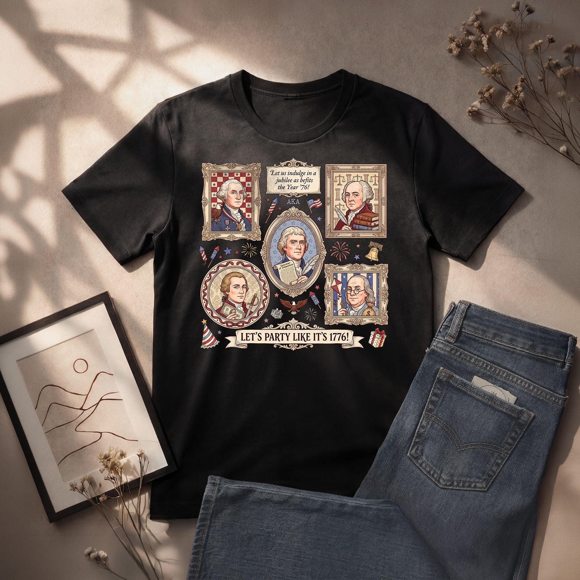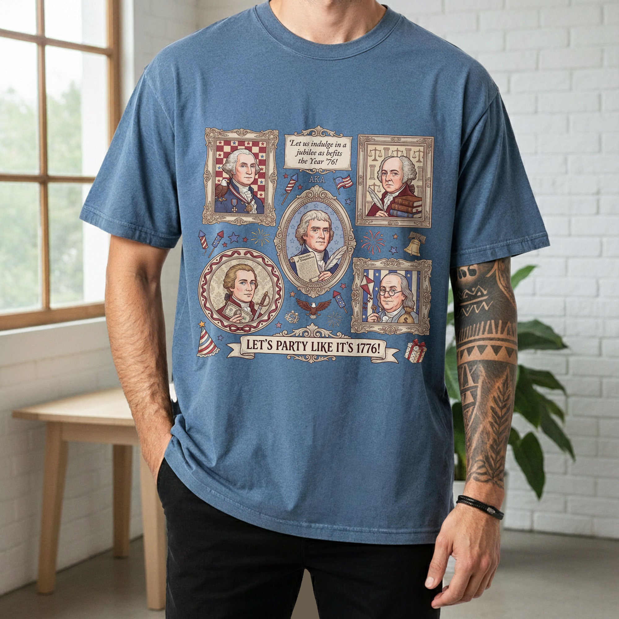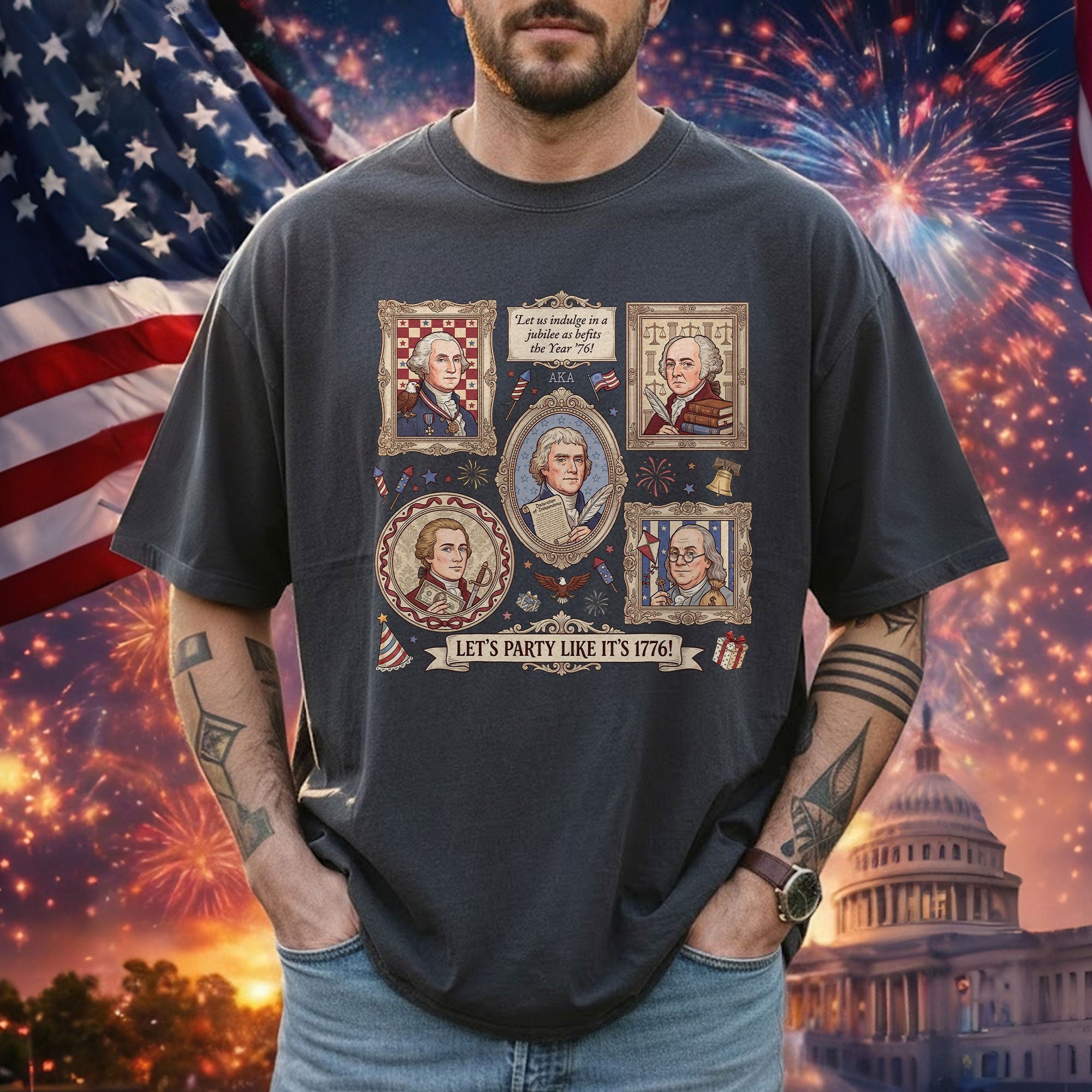 Vintage Founding Fathers 1776 T-shirt featuring classic American history artwork and the phrase “Let’s Party Like It’s 1776.” Perfect for Independence Day, patriotic celebrations, and history lovers.
