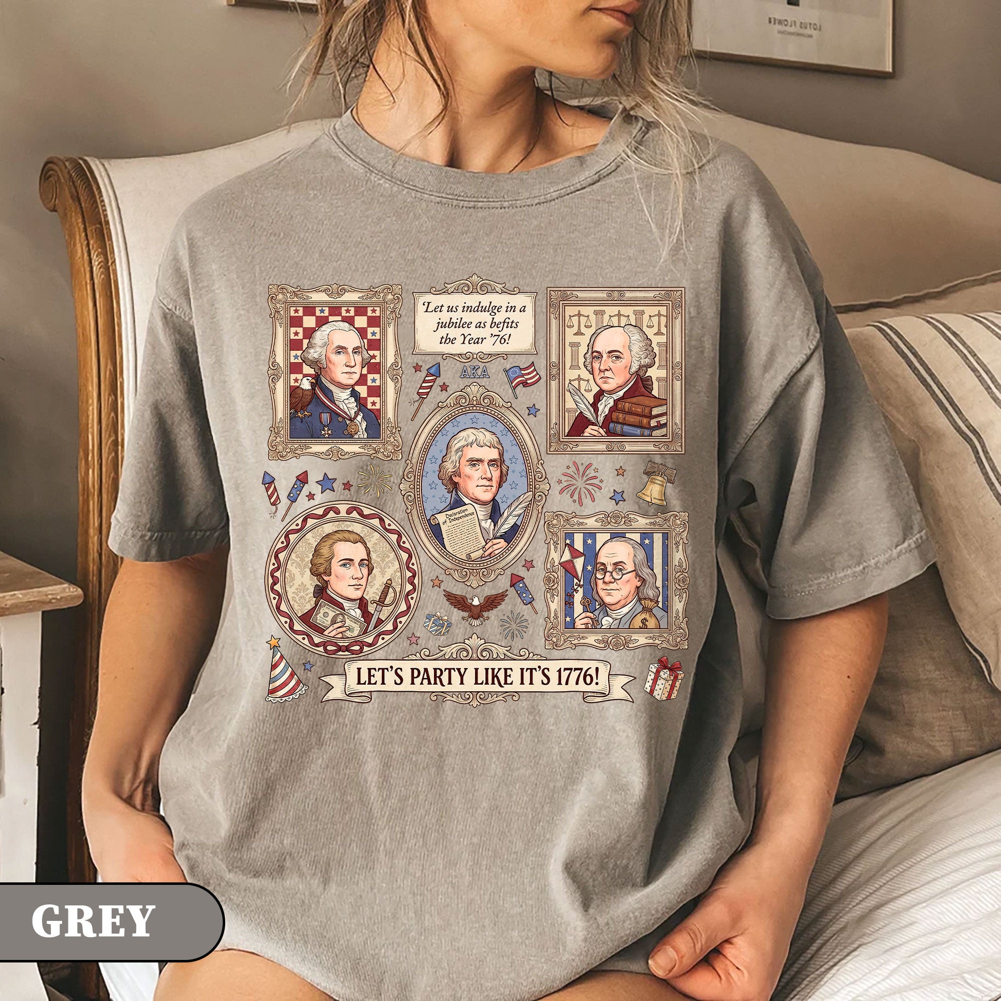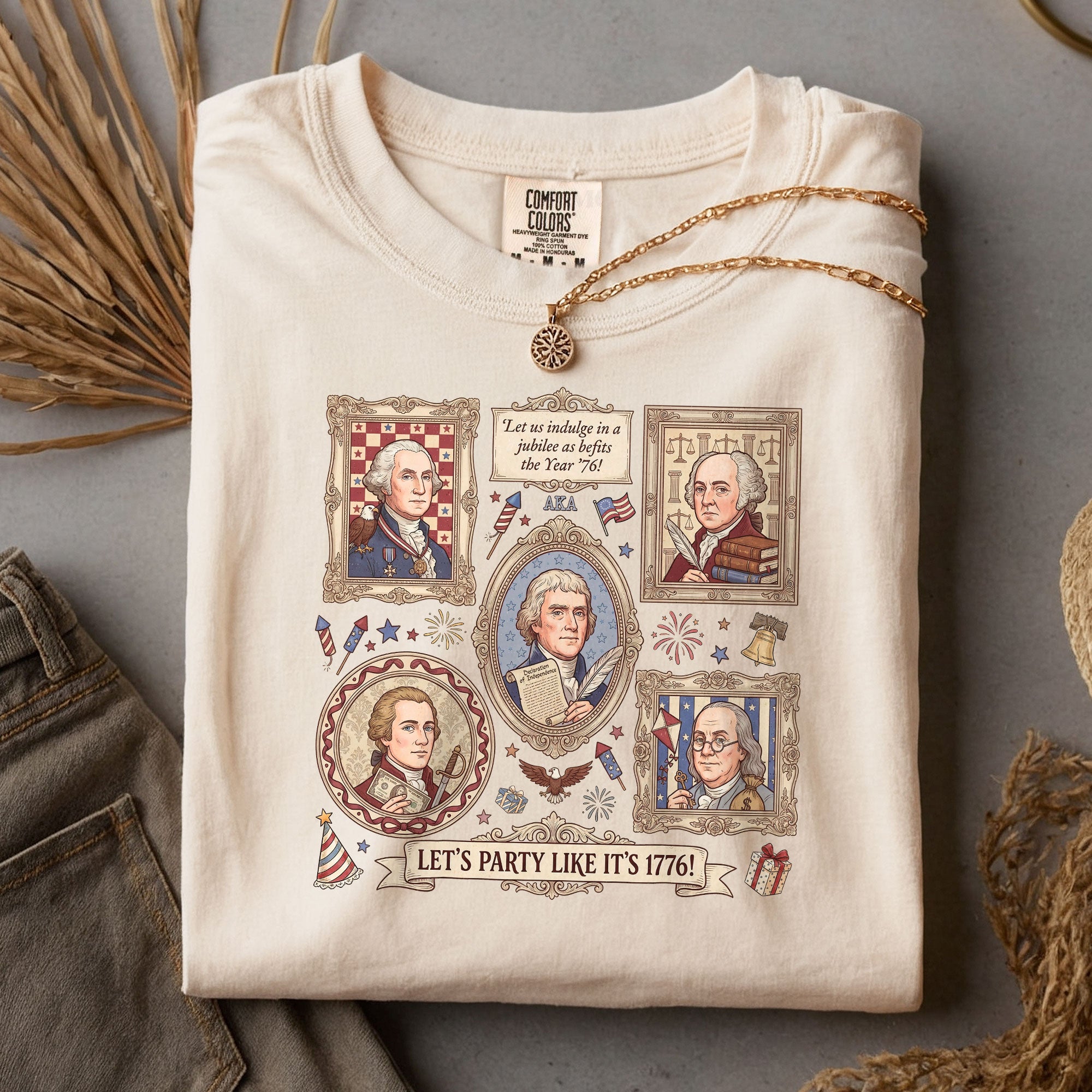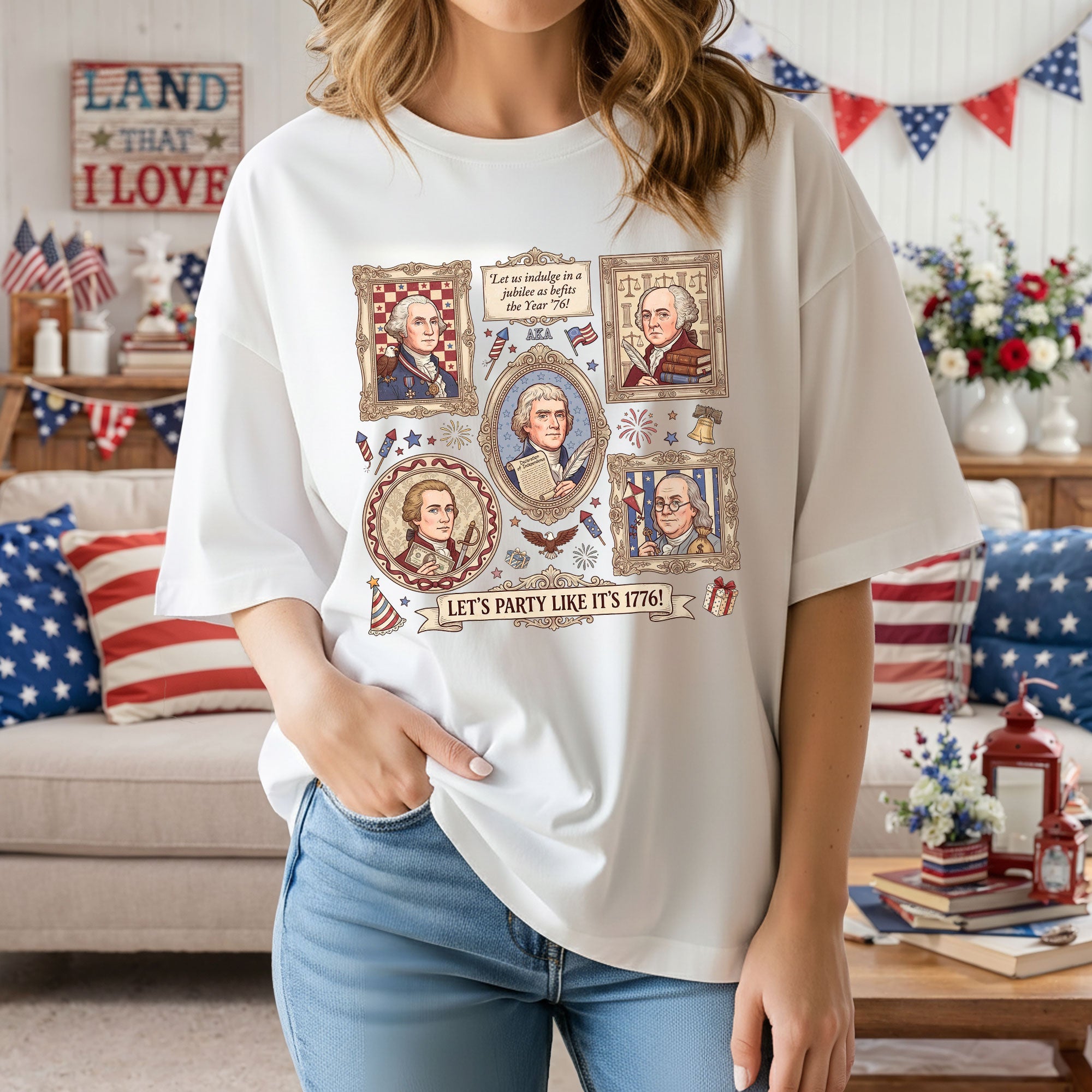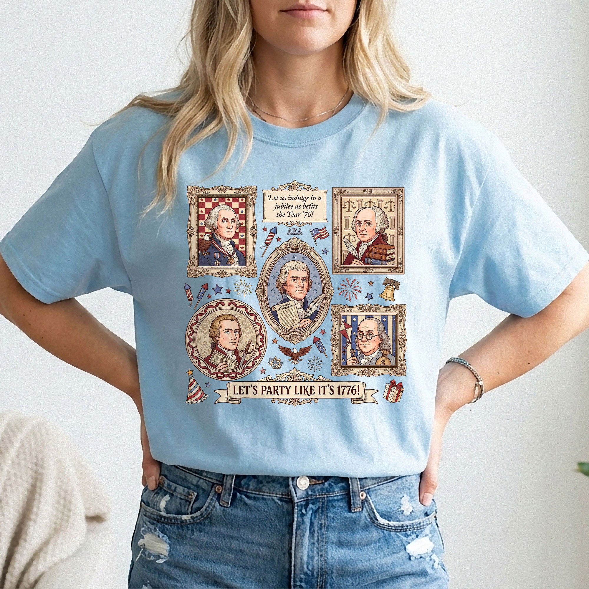 Vintage Founding Fathers 1776 T-shirt featuring classic American history artwork and the phrase “Let’s Party Like It’s 1776.” Perfect for Independence Day, patriotic celebrations, and history lovers.