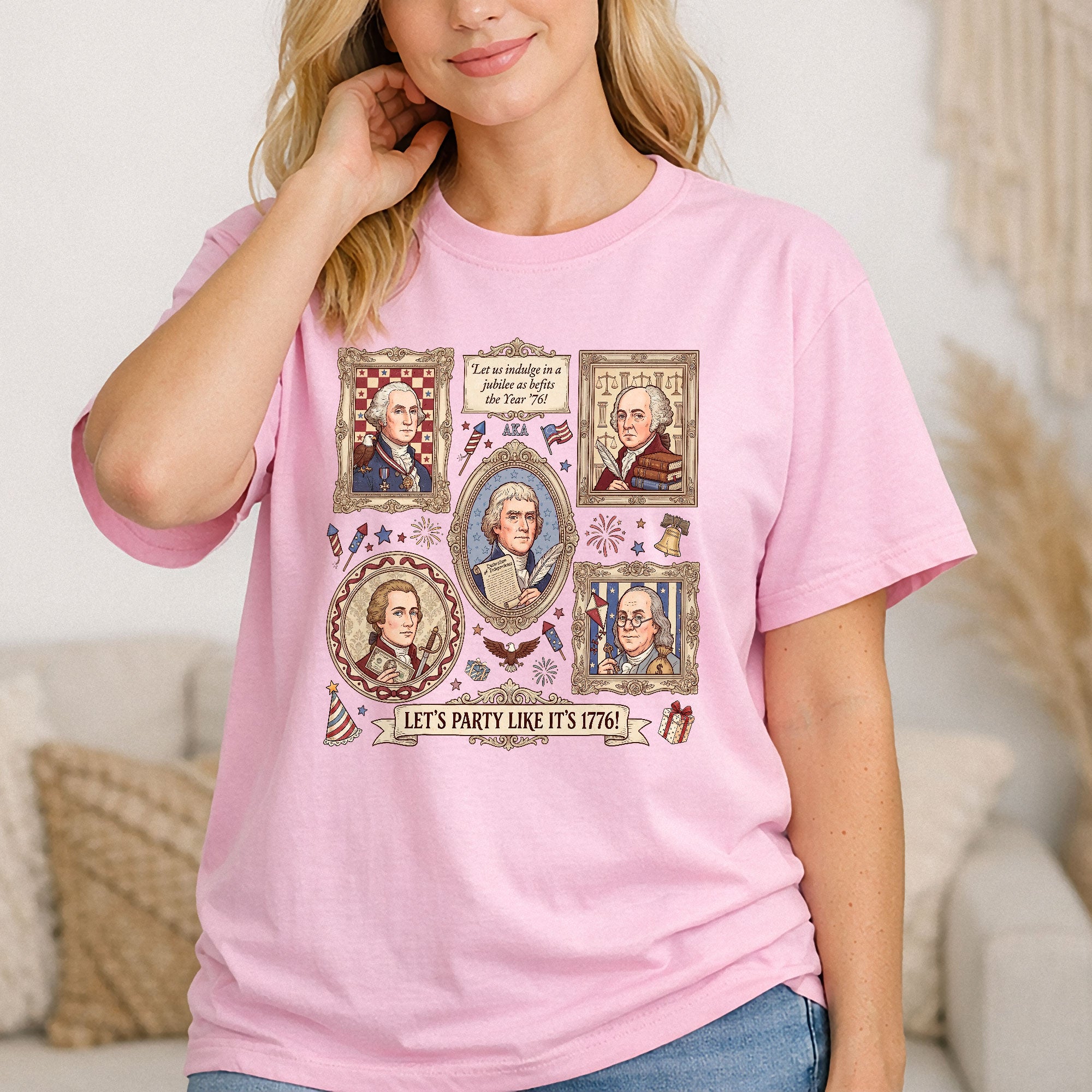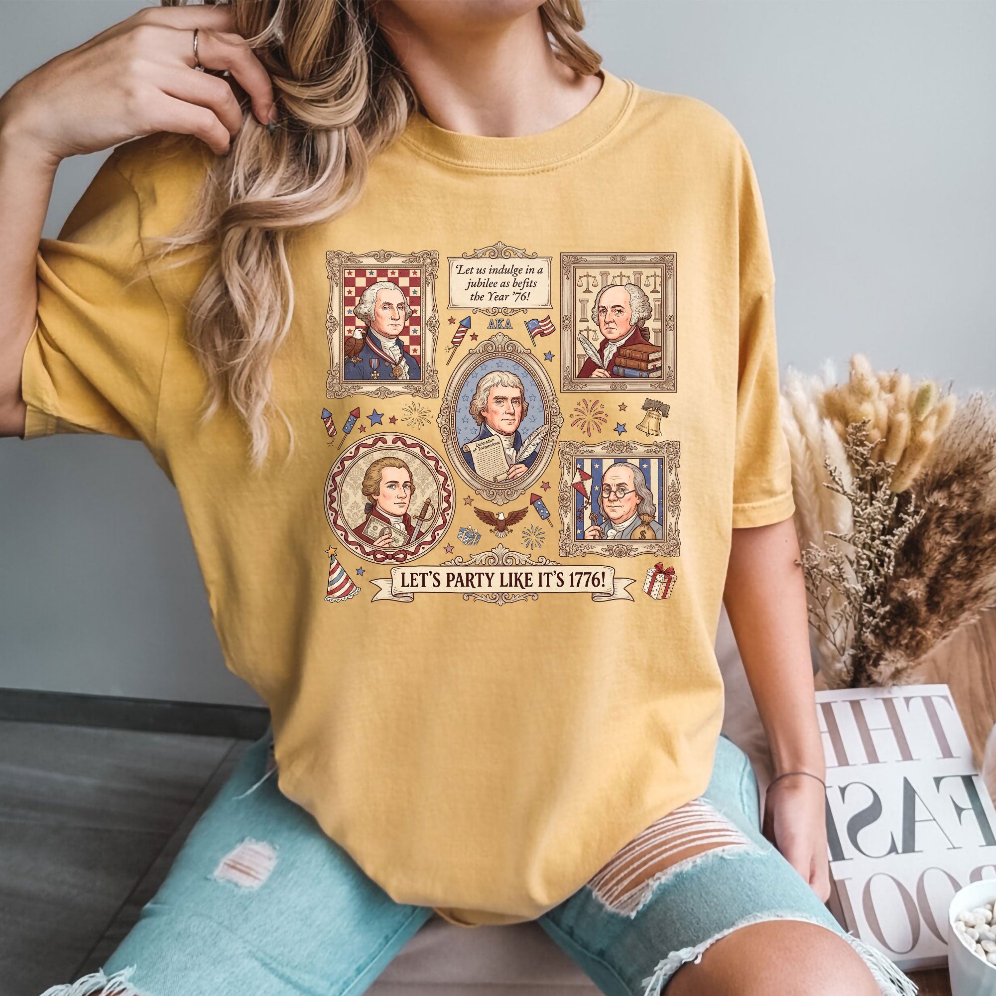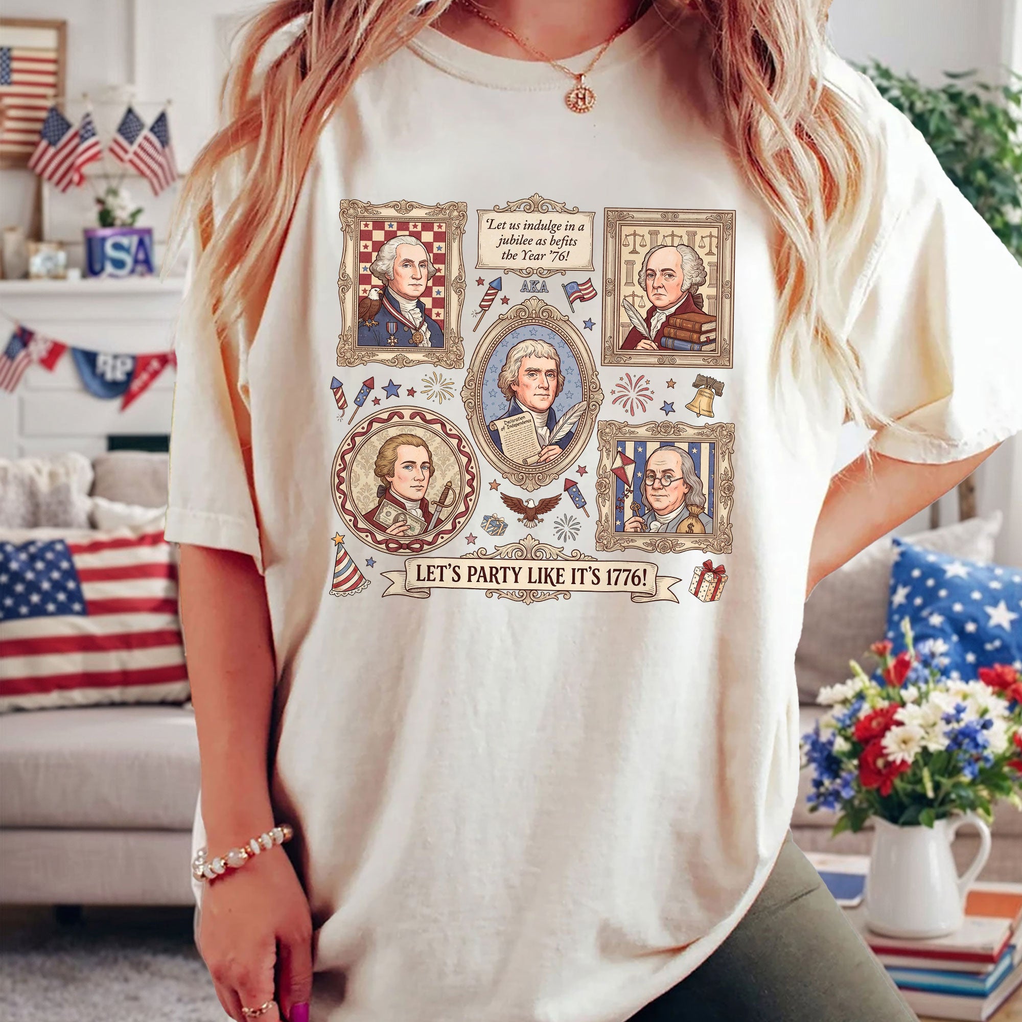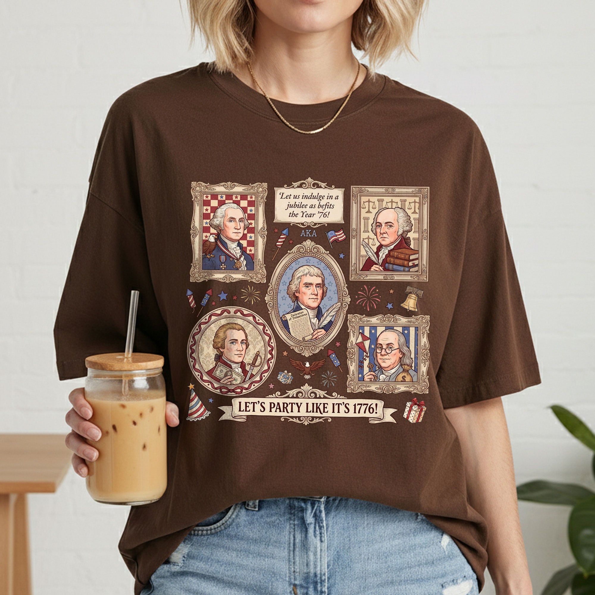Vintage Founding Fathers 1776 T-shirt featuring classic American history artwork and the phrase “Let’s Party Like It’s 1776.” Perfect for Independence Day, patriotic celebrations, and history lovers.