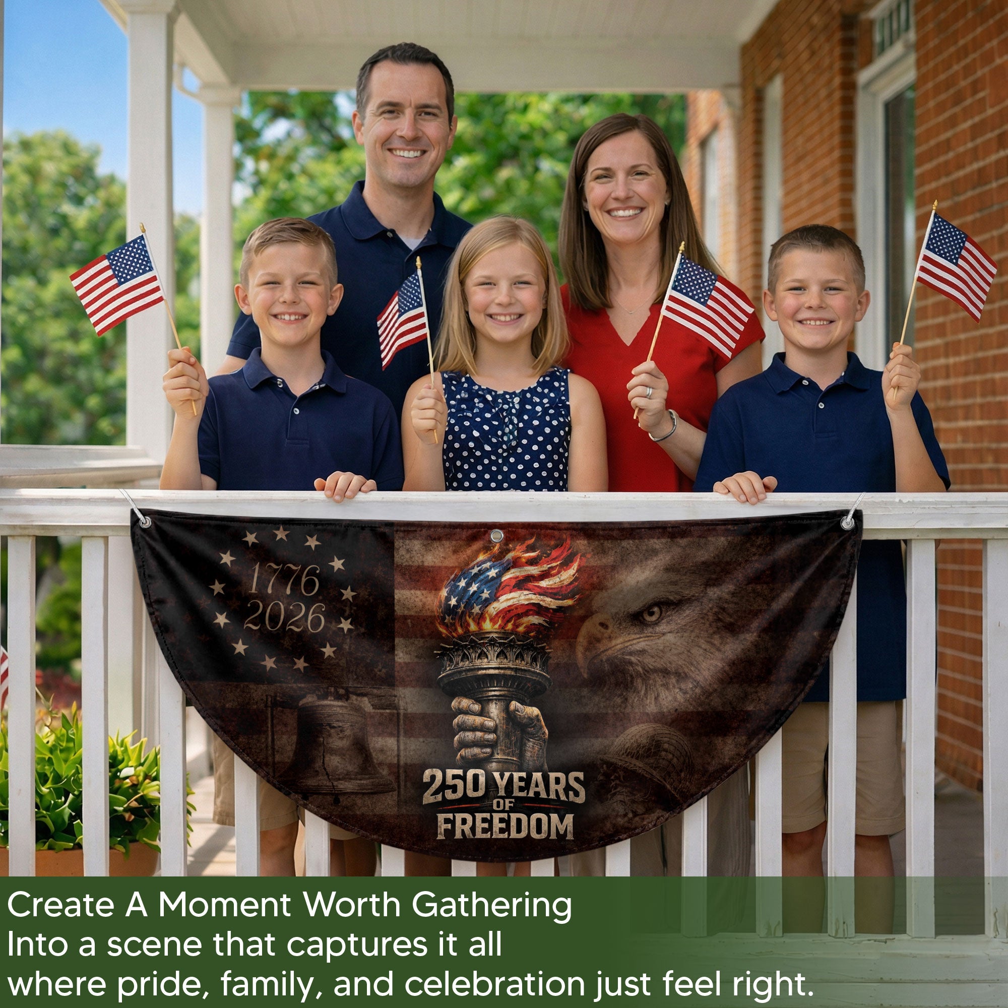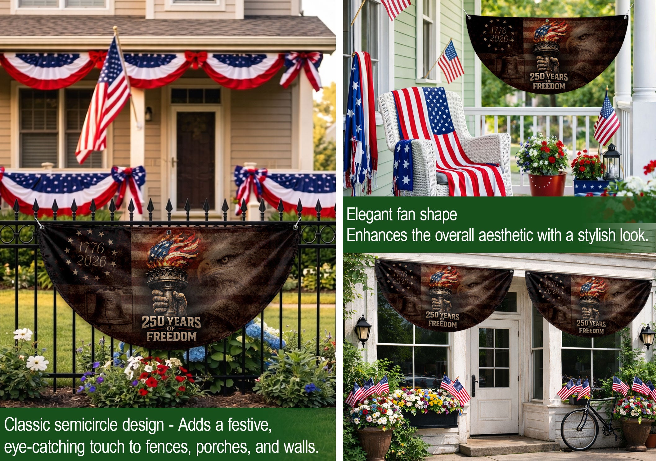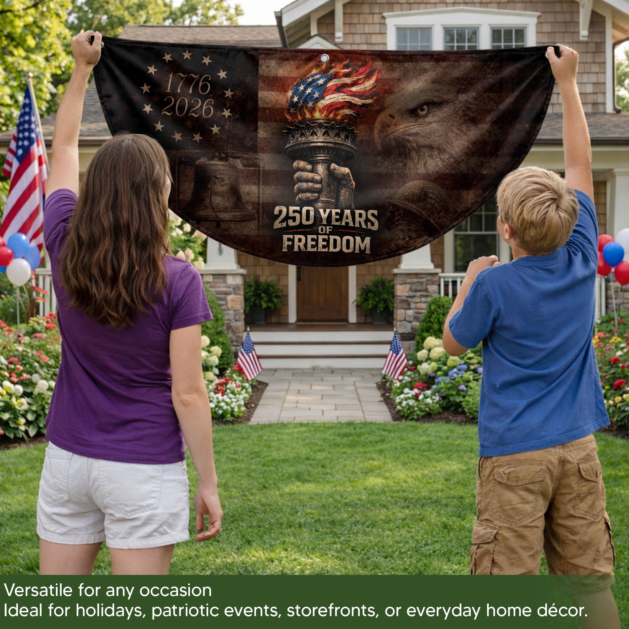 Celebrate America’s 250th anniversary with this striking Freedom Flag Fence Banner featuring the iconic Liberty Torch and majestic eagle design. Perfect for patriotic displays, this durable outdoor banner honors the 1776-2026 milestone of independence and liberty. Ideal for fences, gardens, porches, or events, it showcases bold graphics that withstand weather exposure. Made from high-quality, UV-resistant polyester fabric with reinforced edges and grommets for secure hanging. Easy to install on chain-link fences, posts, or railings. A powerful symbol of national pride for homes, businesses, parades, or Fourth of July celebrations. Dimensions optimized for maximum visibility. Join the semiquincentennial festivities with this authentic tribute to enduring American freedom.