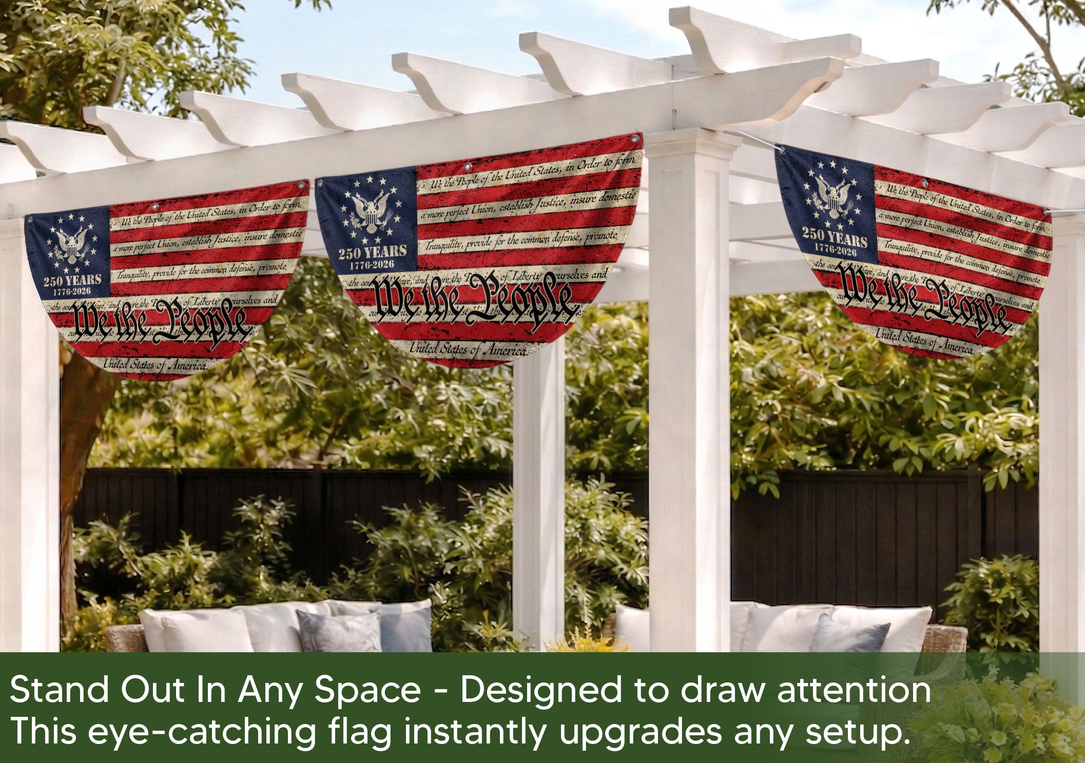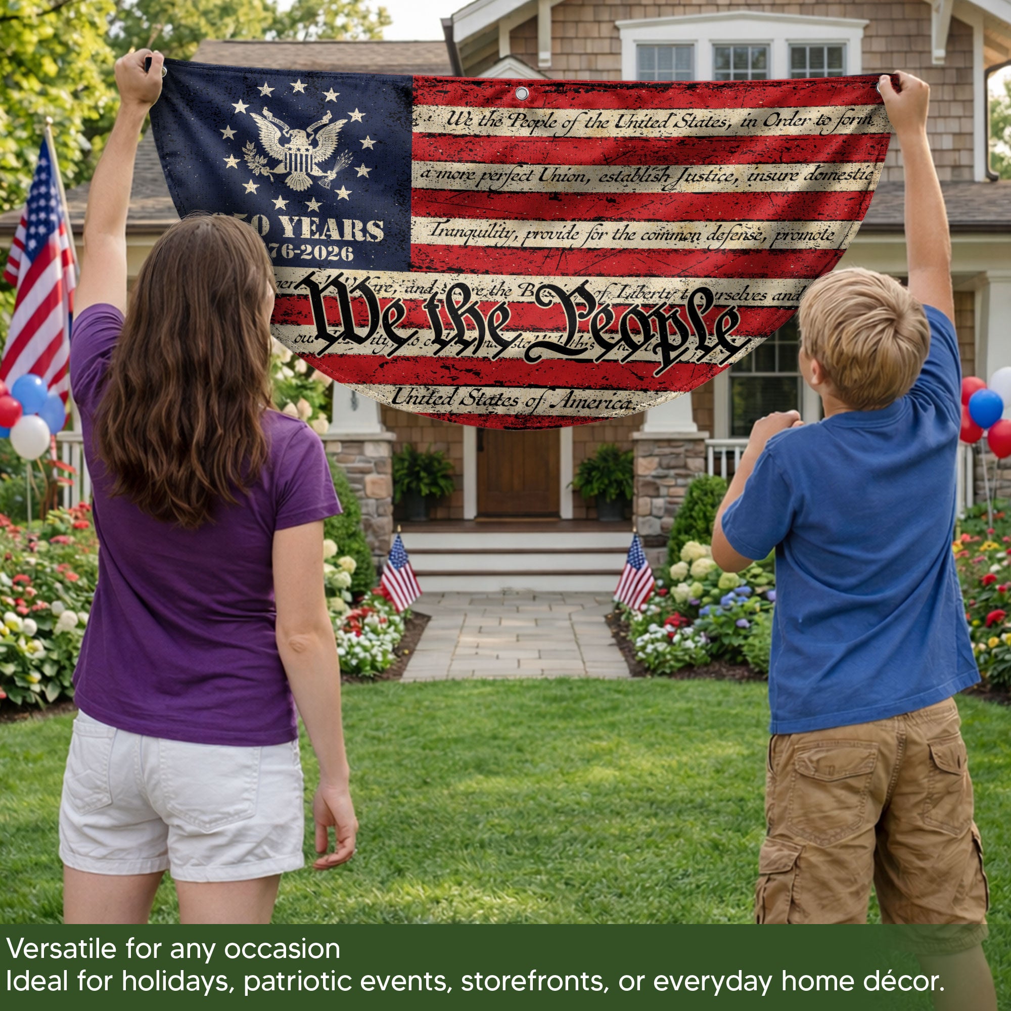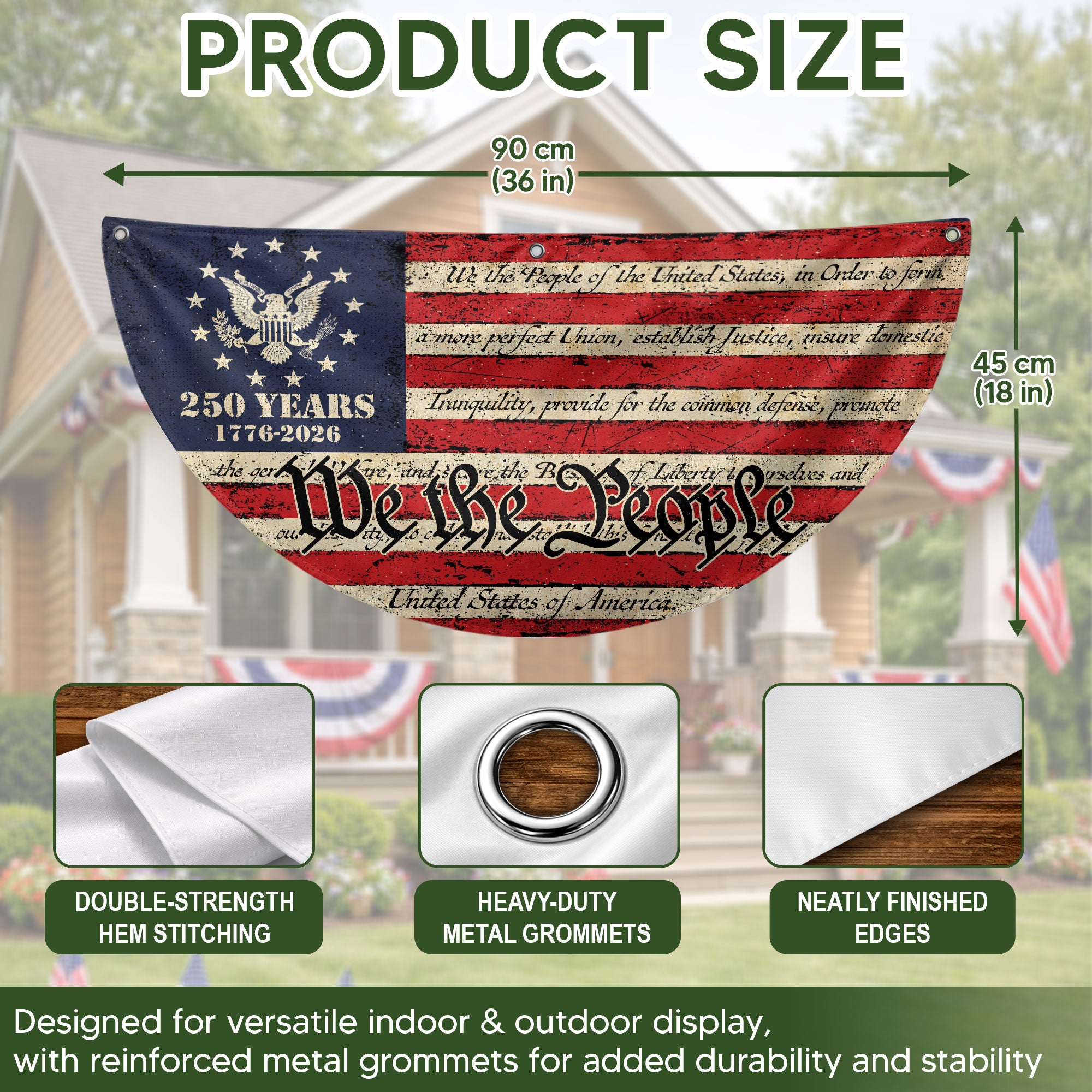 Celebrate America’s 250th anniversary in 2026 with this durable USA flag fence banner featuring the iconic ‘We the People’ inscription. Designed for fences, gardens, porches, or patriotic displays, this striking banner showcases classic red, white, and blue colors with stars and an eagle emblem. Made from high-quality, weather-resistant polyester fabric, it withstands outdoor conditions while proudly honoring the nation’s founding principles and history. Easy to hang with reinforced grommets, it’s perfect for homes, events, parades, or Fourth of July celebrations. Show your American pride with this eye-catching, large-format banner that measures ideal for maximum visibility.