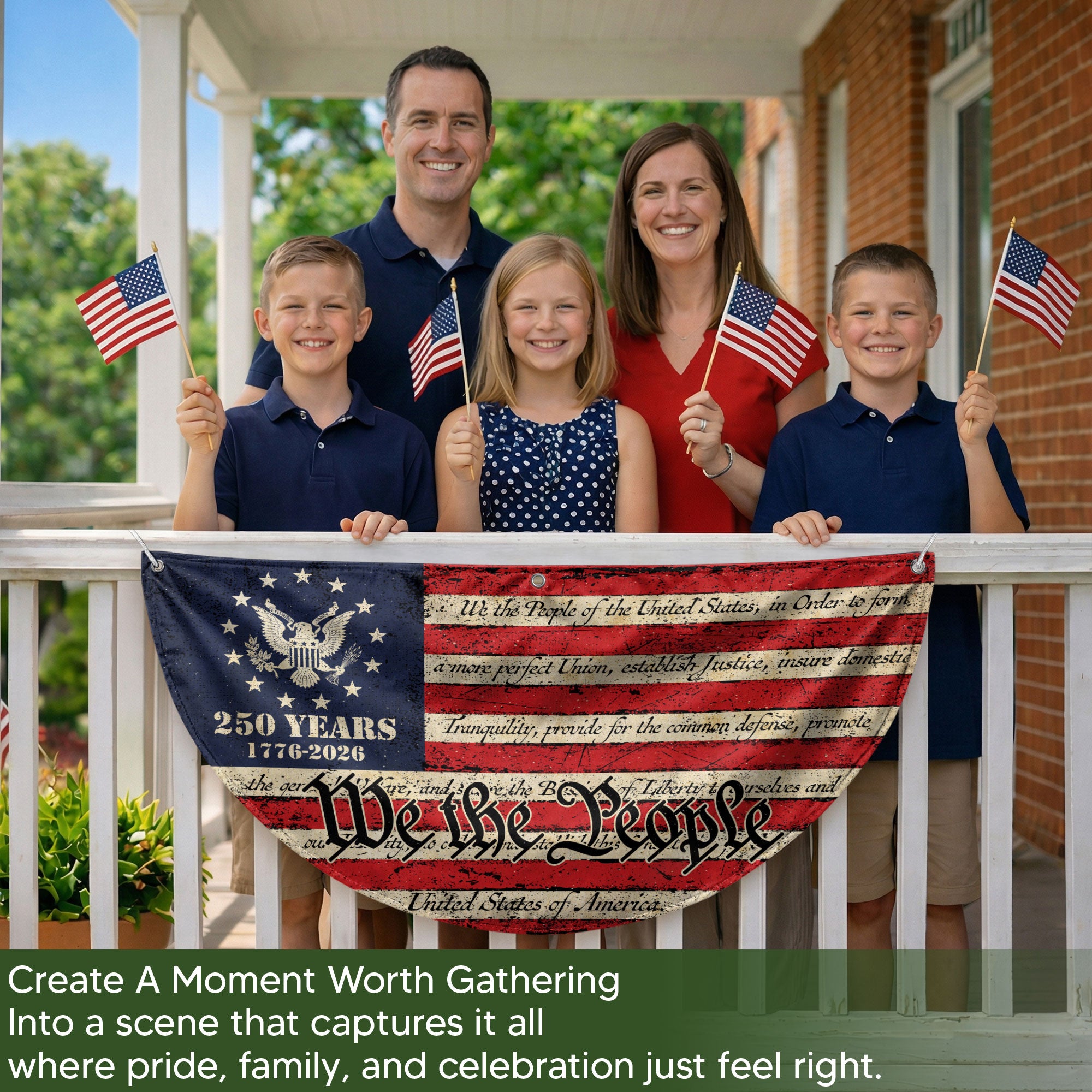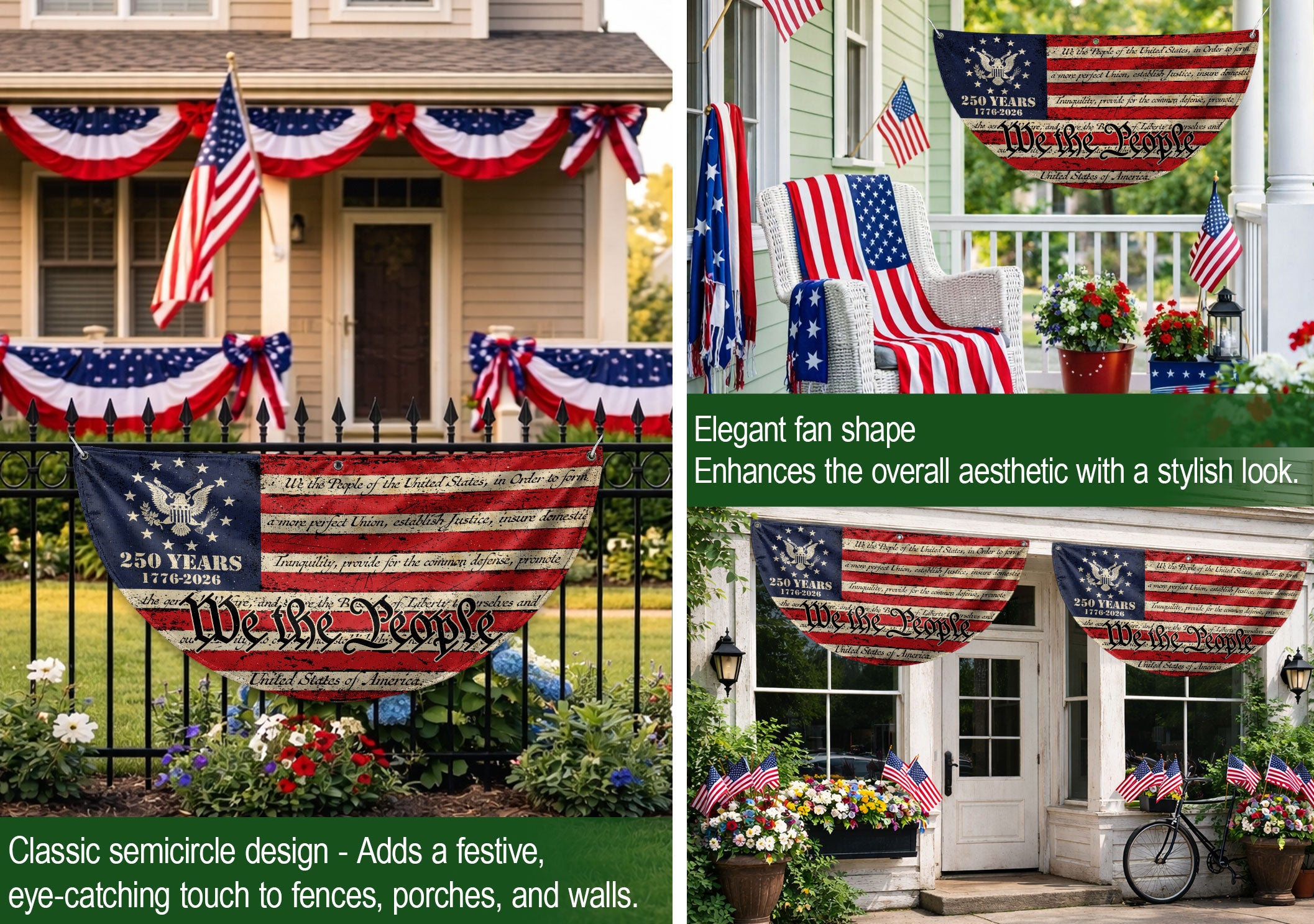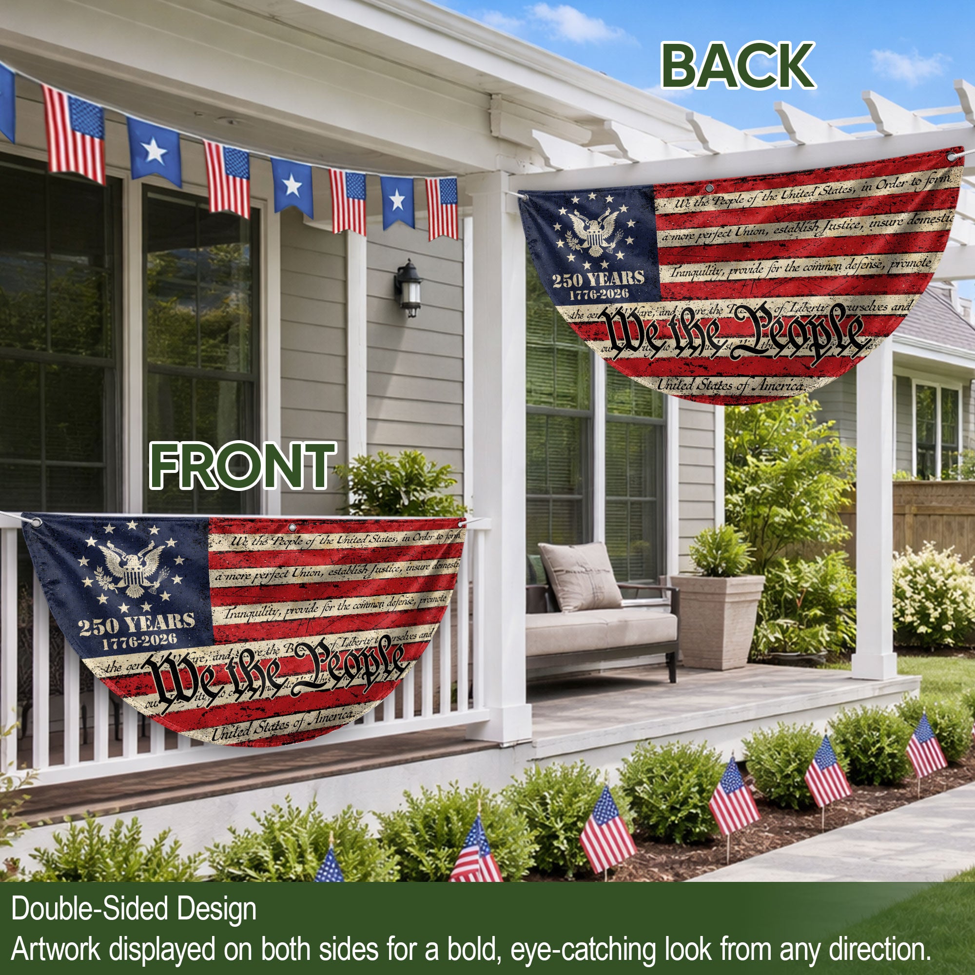 Celebrate America’s 250th anniversary in 2026 with this durable USA flag fence banner featuring the iconic ‘We the People’ inscription. Designed for fences, gardens, porches, or patriotic displays, this striking banner showcases classic red, white, and blue colors with stars and an eagle emblem. Made from high-quality, weather-resistant polyester fabric, it withstands outdoor conditions while proudly honoring the nation’s founding principles and history. Easy to hang with reinforced grommets, it’s perfect for homes, events, parades, or Fourth of July celebrations. Show your American pride with this eye-catching, large-format banner that measures ideal for maximum visibility.