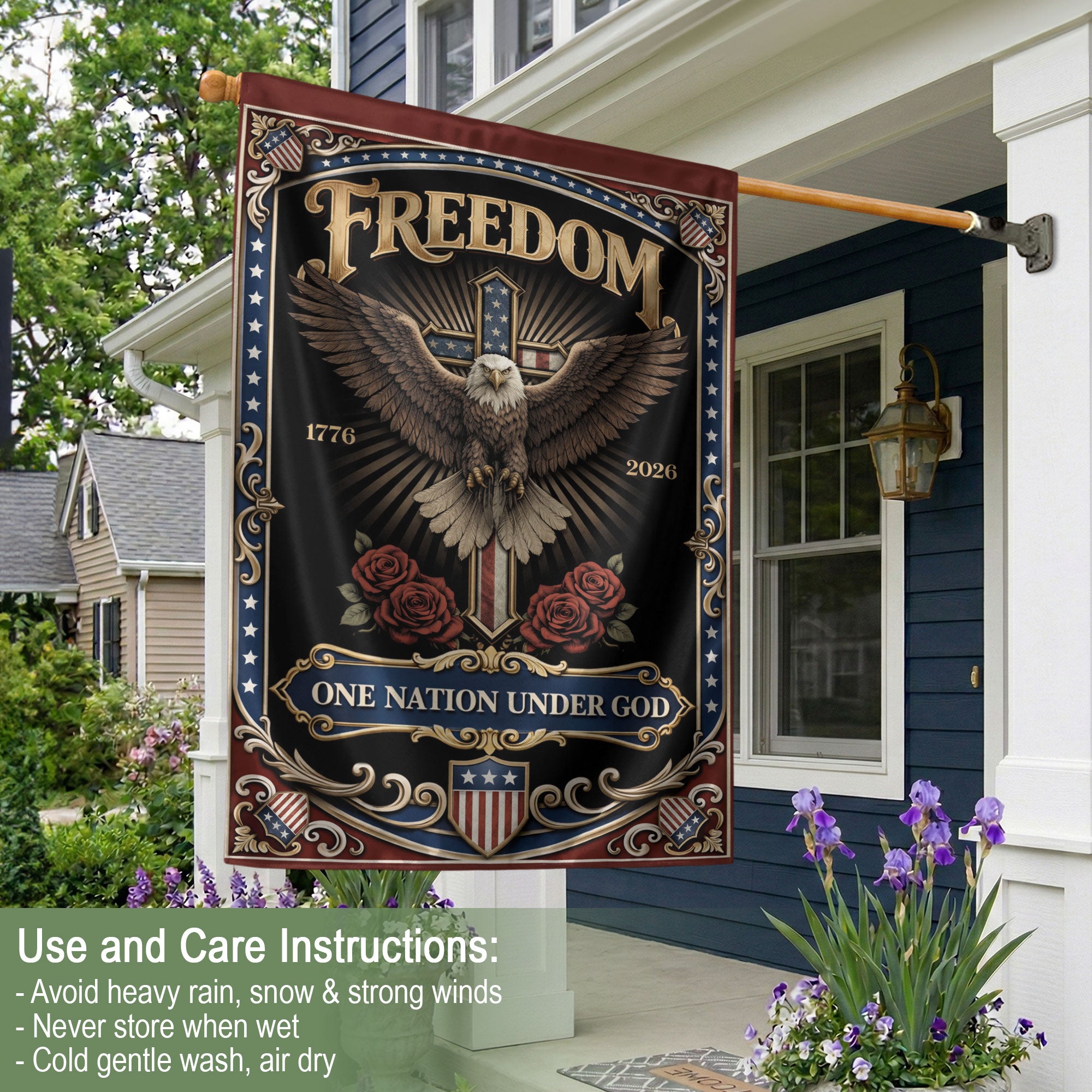 Celebrate America’s 250th anniversary with this double-sided garden flag featuring ‘One Nation Under God’ and ‘We The People’ messages. The design showcases a powerful eagle and cross in patriotic red, white, and blue colors, honoring 250 years of freedom from 1776 to 2026. Crafted for outdoor display, this durable flag embodies faith, Christian values, and American pride. Perfect for gardens, porches, or yards to inspire liberty and patriotism. Easy to hang with a standard garden flag pole (not included). Double-sided printing ensures visibility from both sides.