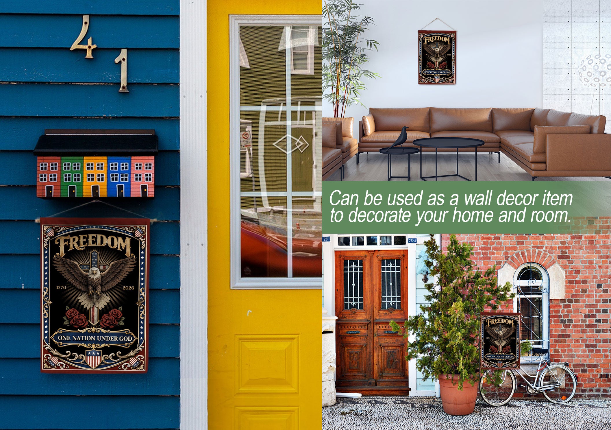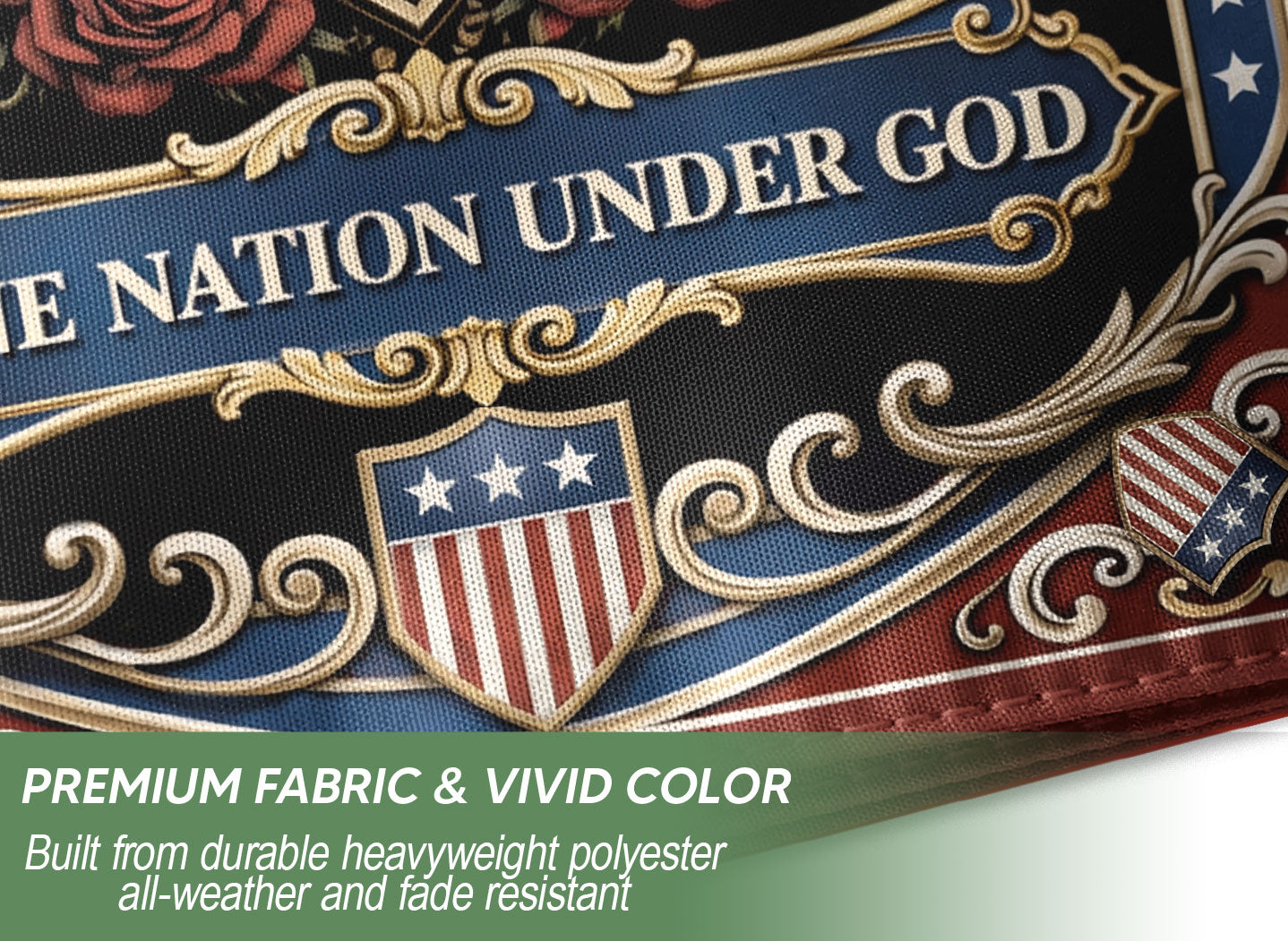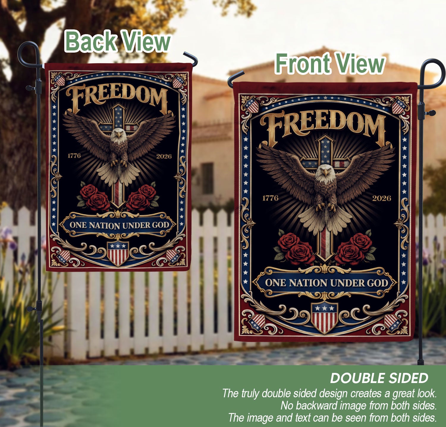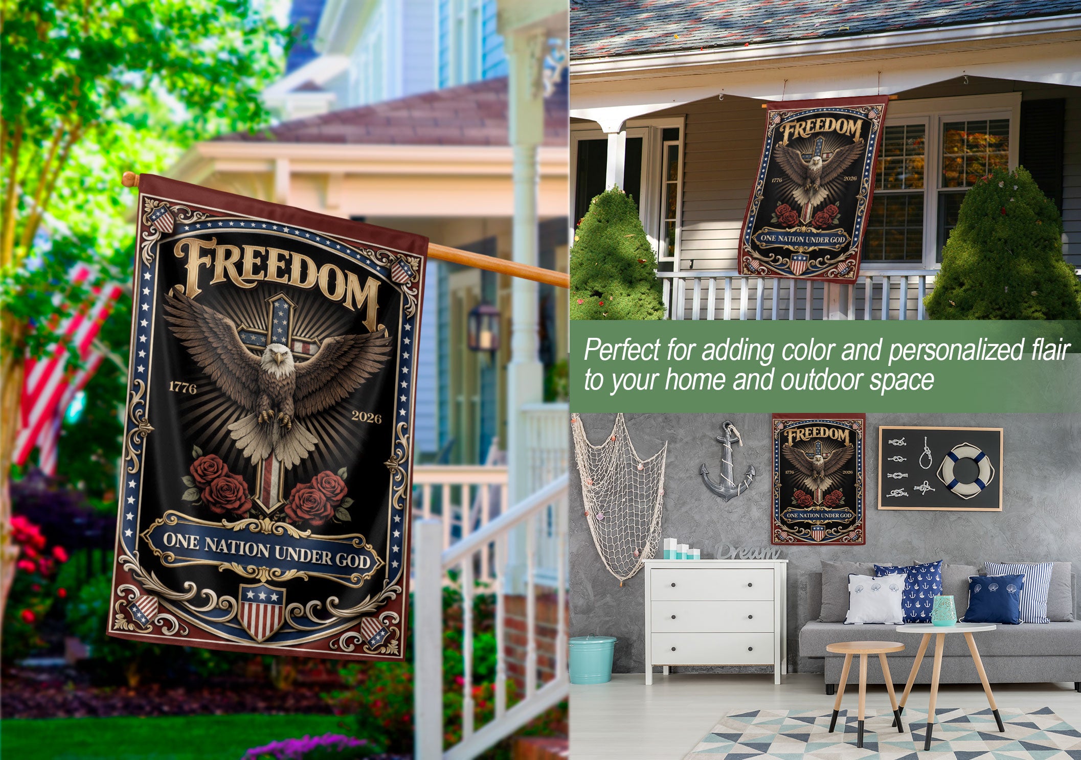 Celebrate America’s 250th anniversary with this double-sided house flag featuring ‘One Nation Under God’ and ‘We The People’ messages. The design showcases a powerful eagle and cross in patriotic red, white, and blue colors, symbolizing faith, freedom, and 250 years of liberty from 1776 to 2026. Perfect for displaying Christian values and American pride on your porch or home. Crafted for durability and vibrant outdoor use, this flag stands side by side with faith and freedom.