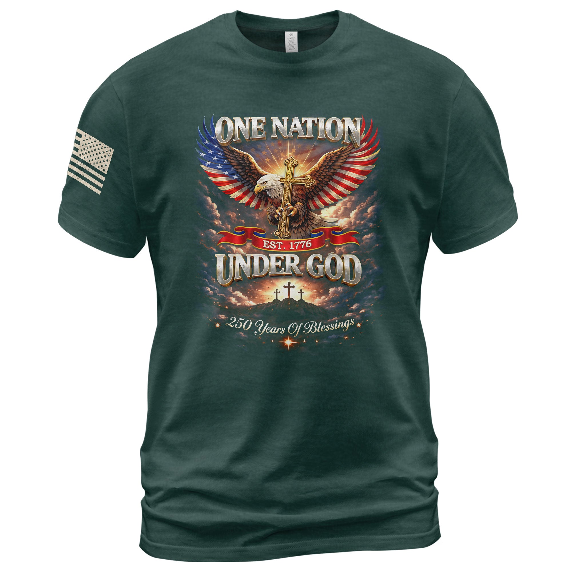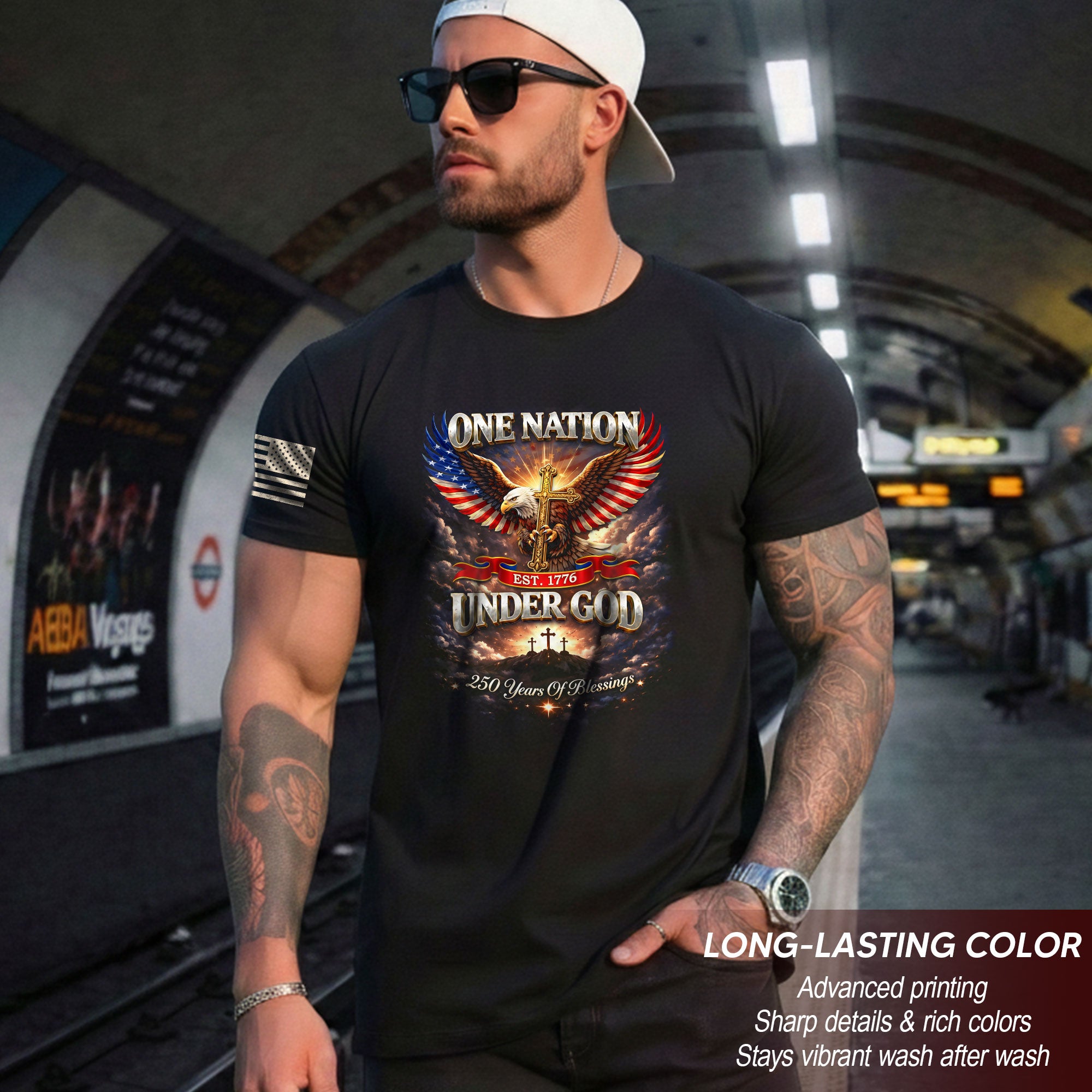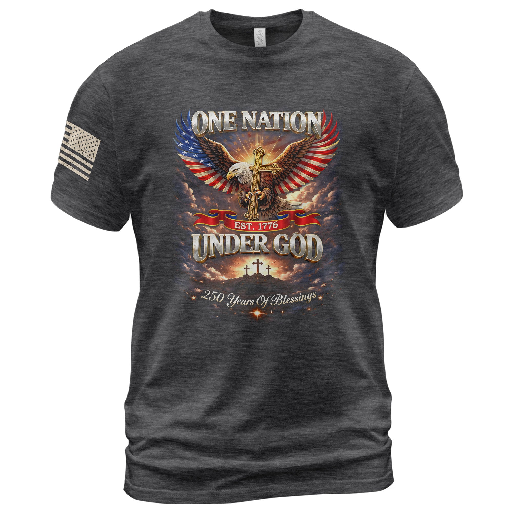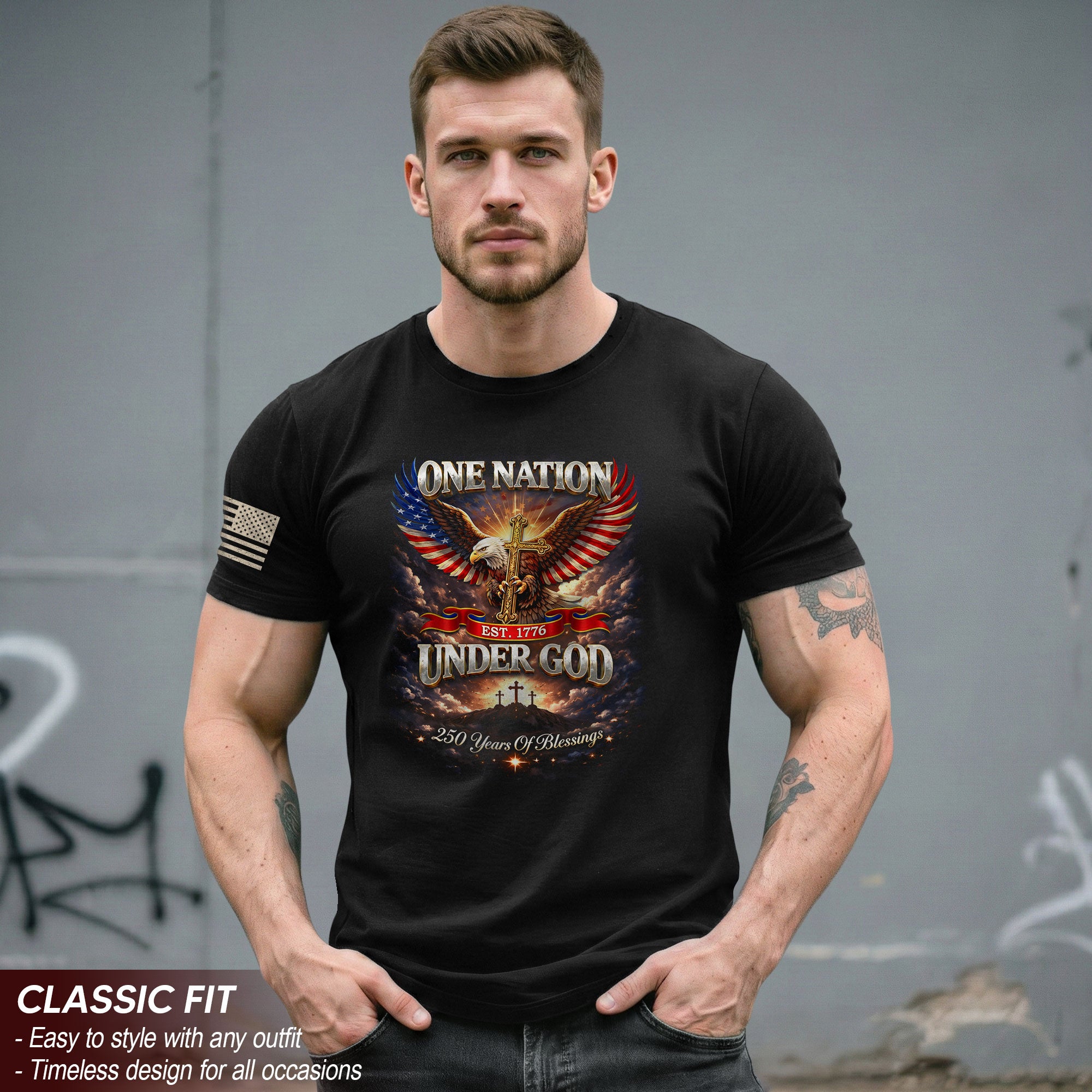 Strength and faith united in celebration.Combining an eagle and cross with anniversary graphics, this tee honors America’s 250th birthday and the legacy of liberty carried across generations.