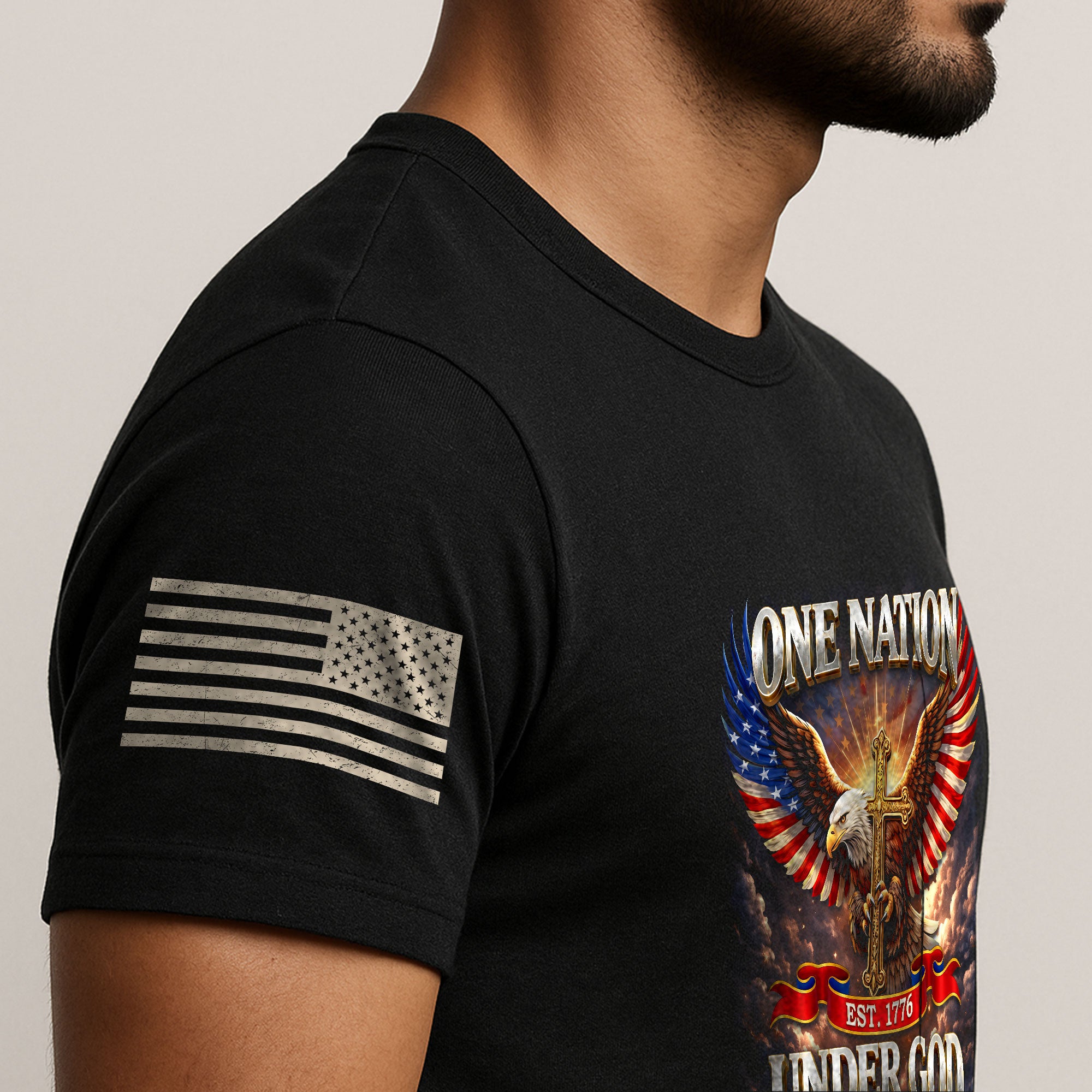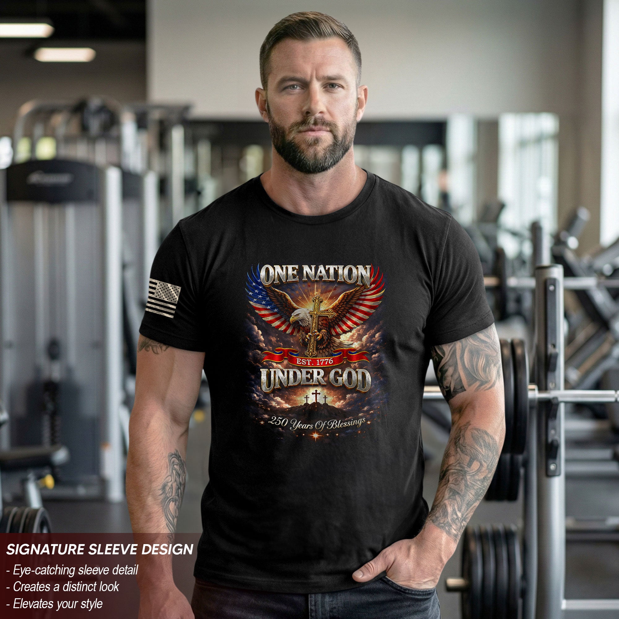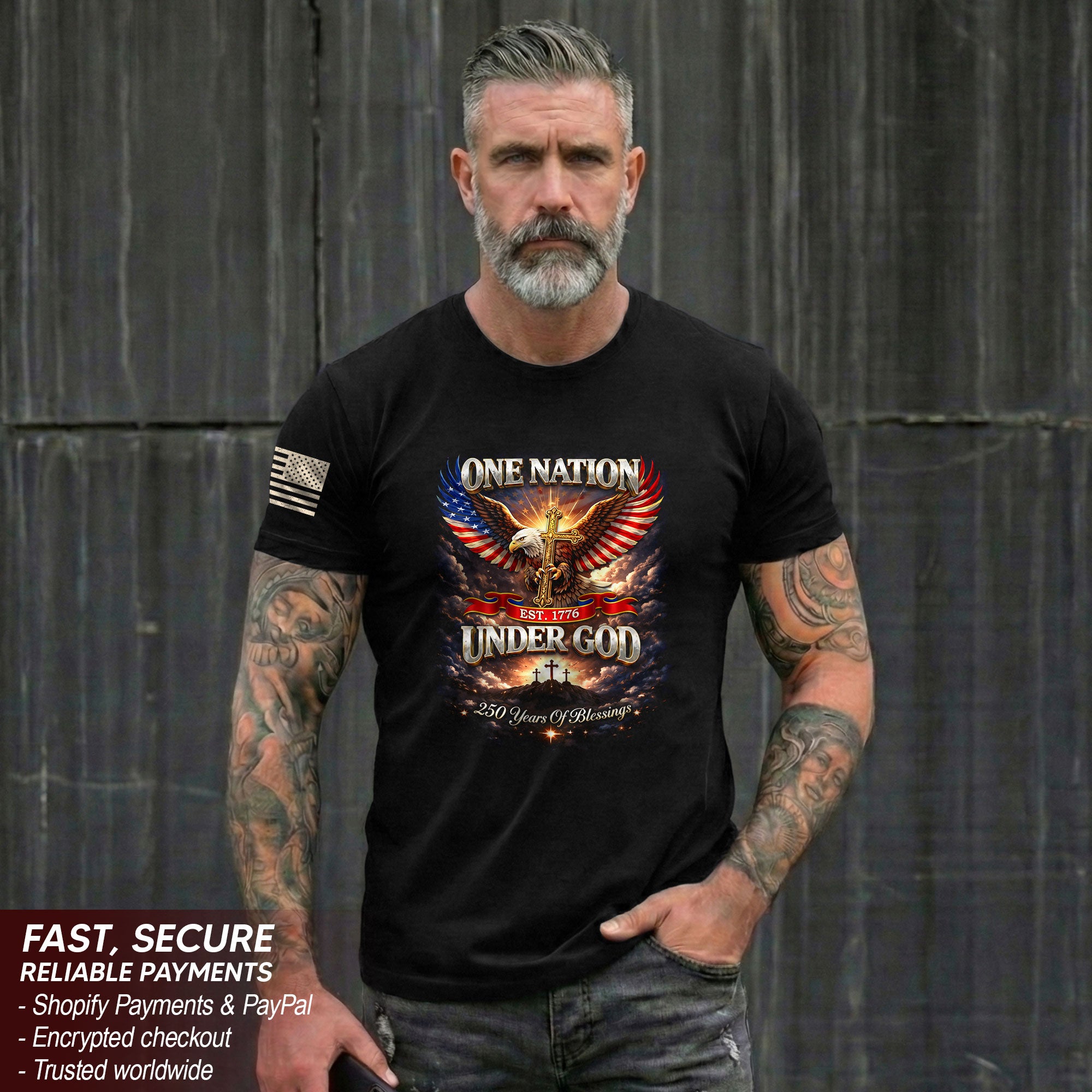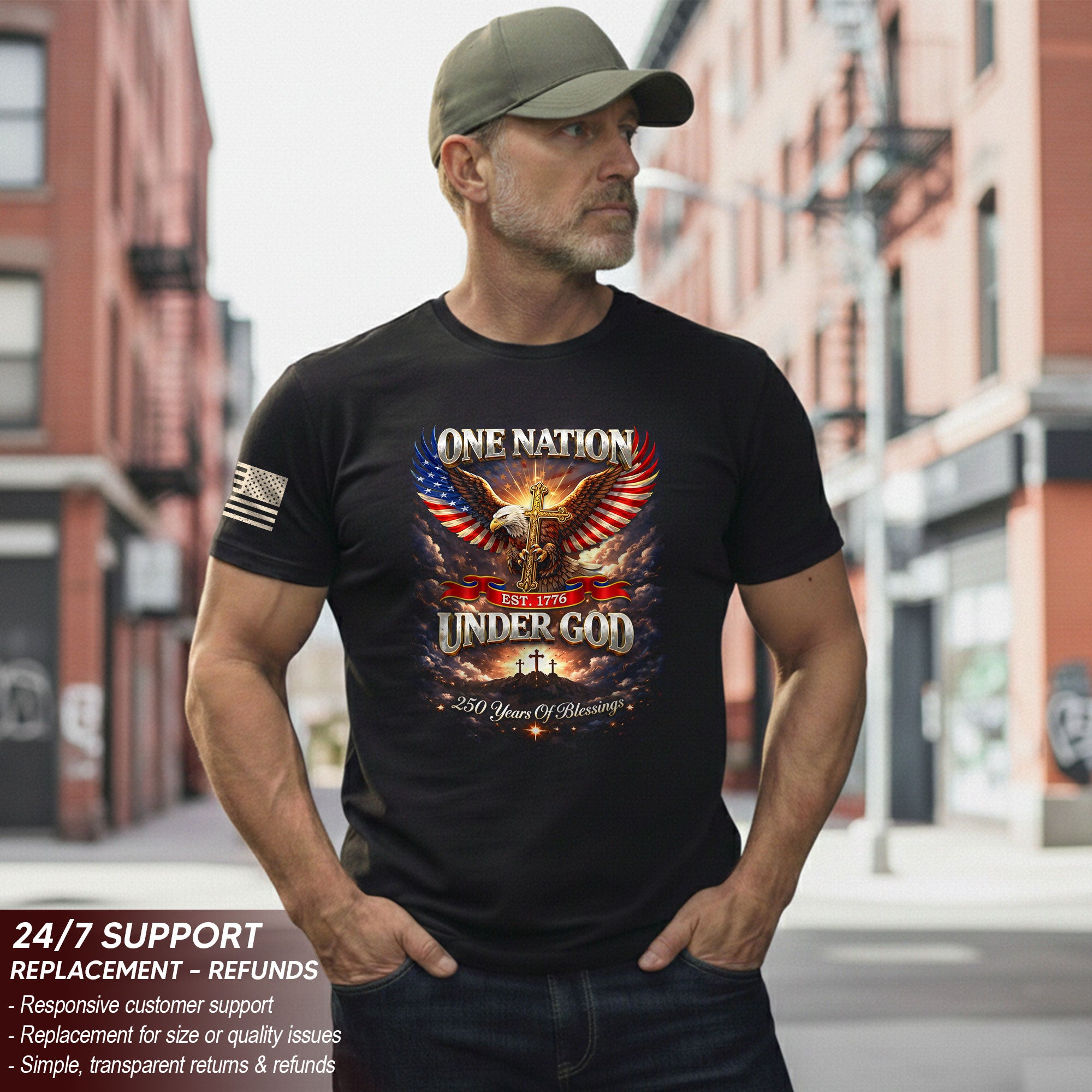 Strength and faith united in celebration.Combining an eagle and cross with anniversary graphics, this tee honors America’s 250th birthday and the legacy of liberty carried across generations.