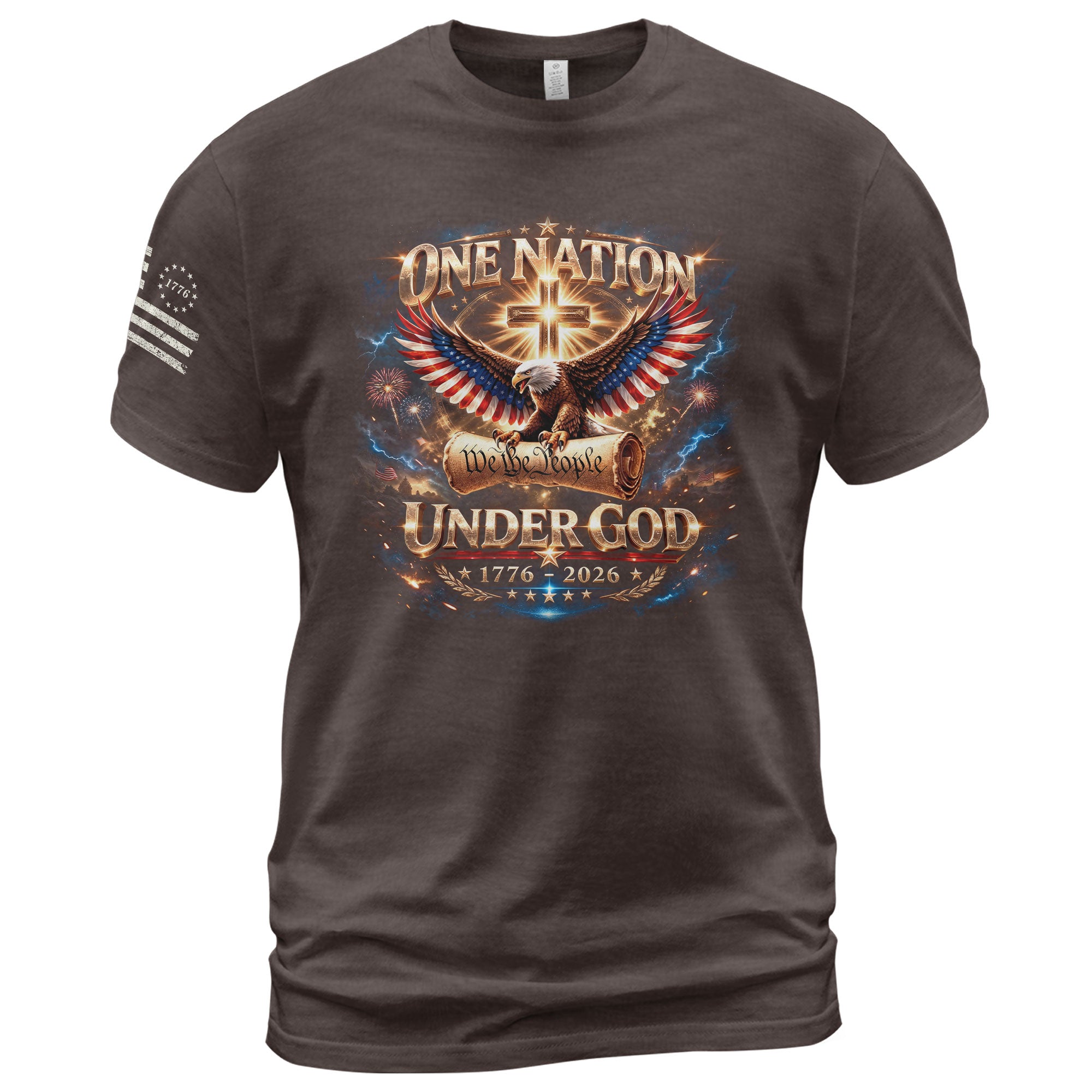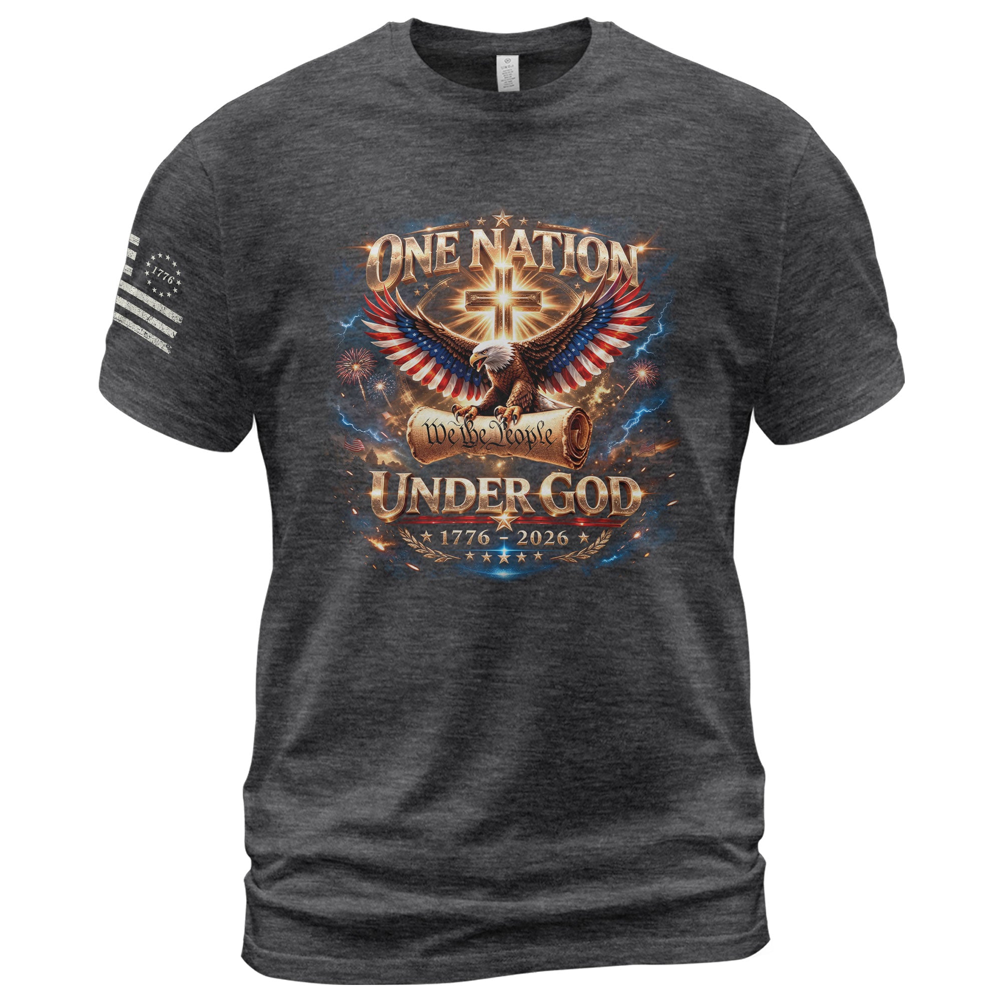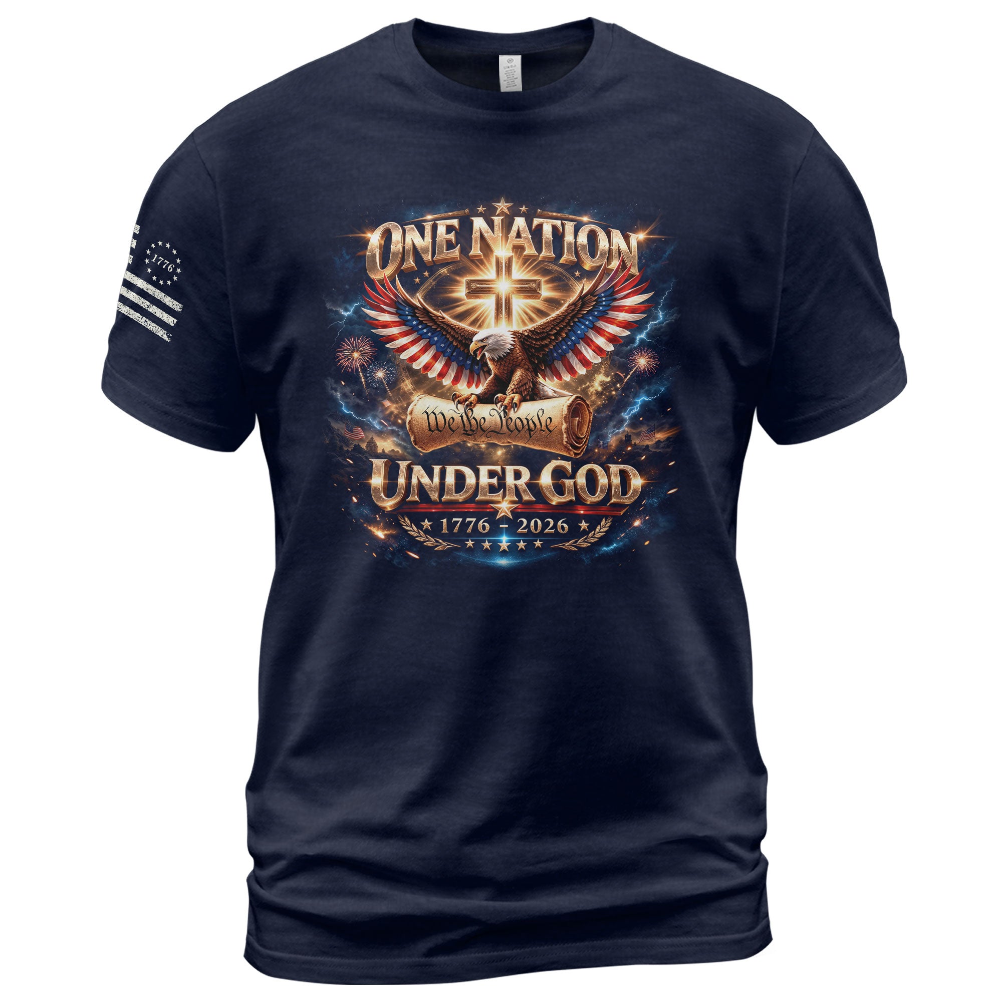 Foundations that shaped a nation.Blending We The People with an eagle, cross, and Constitution-inspired design, this shirt celebrates America’s guiding principles and two and a half centuries of freedom.