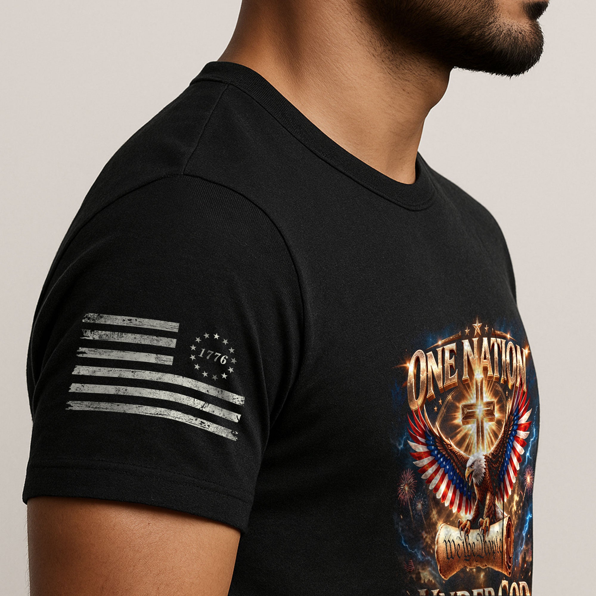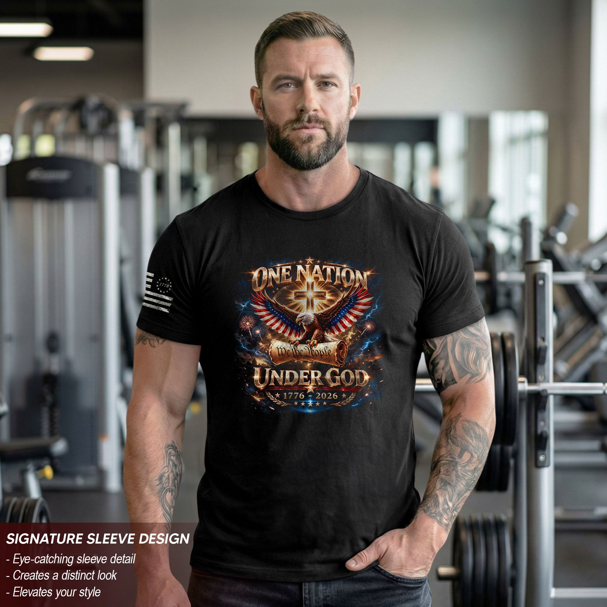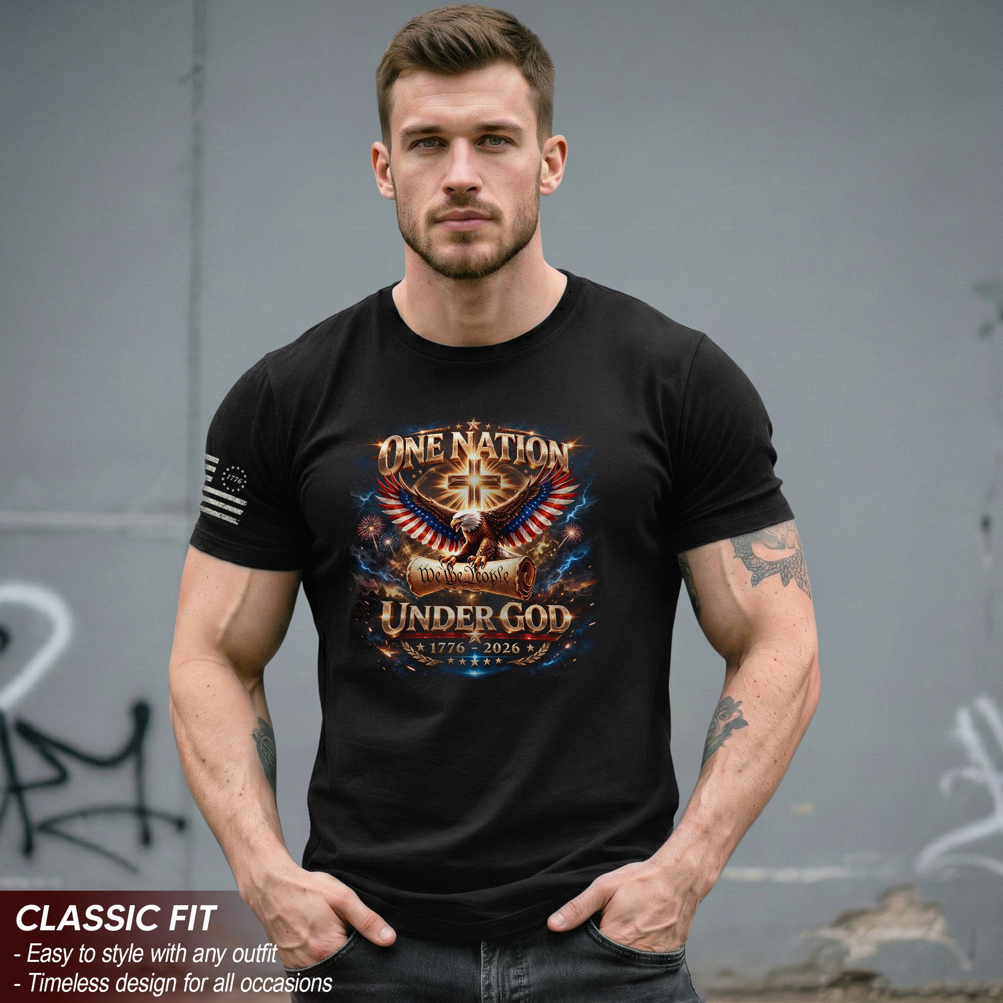 Foundations that shaped a nation.Blending We The People with an eagle, cross, and Constitution-inspired design, this shirt celebrates America’s guiding principles and two and a half centuries of freedom.