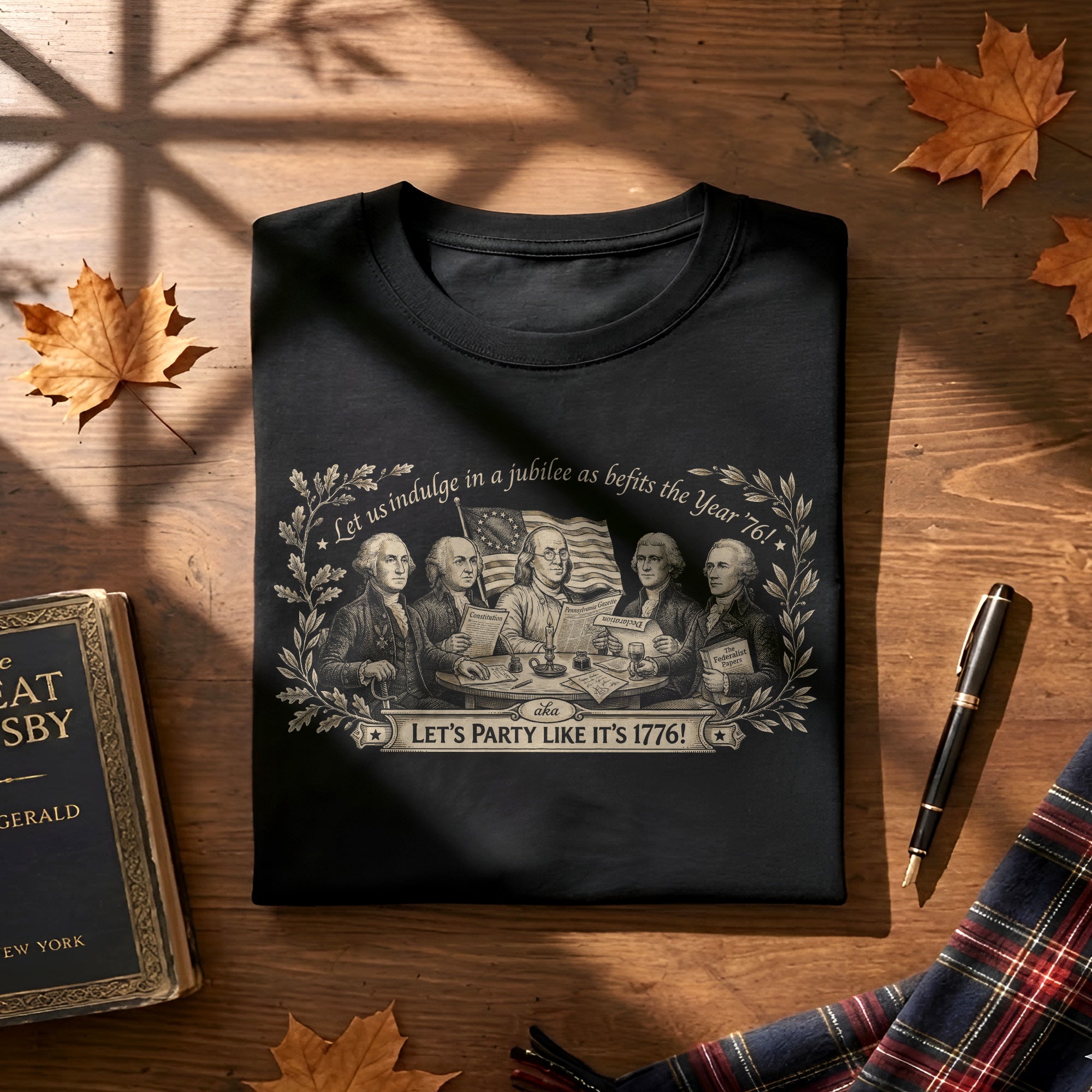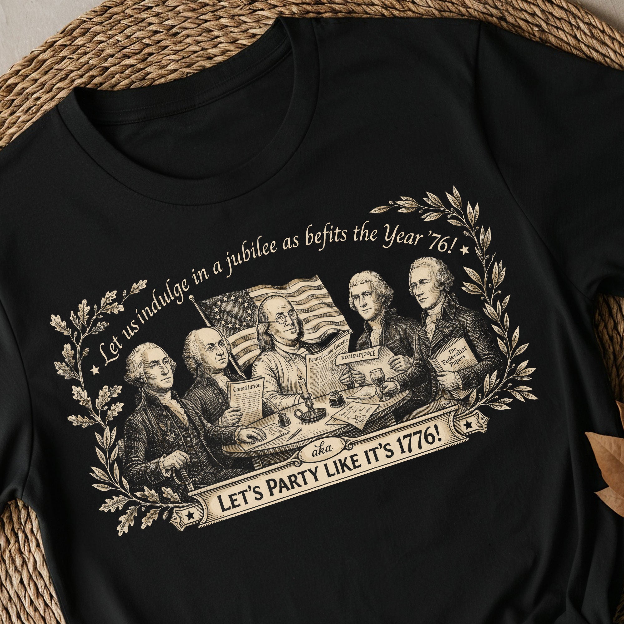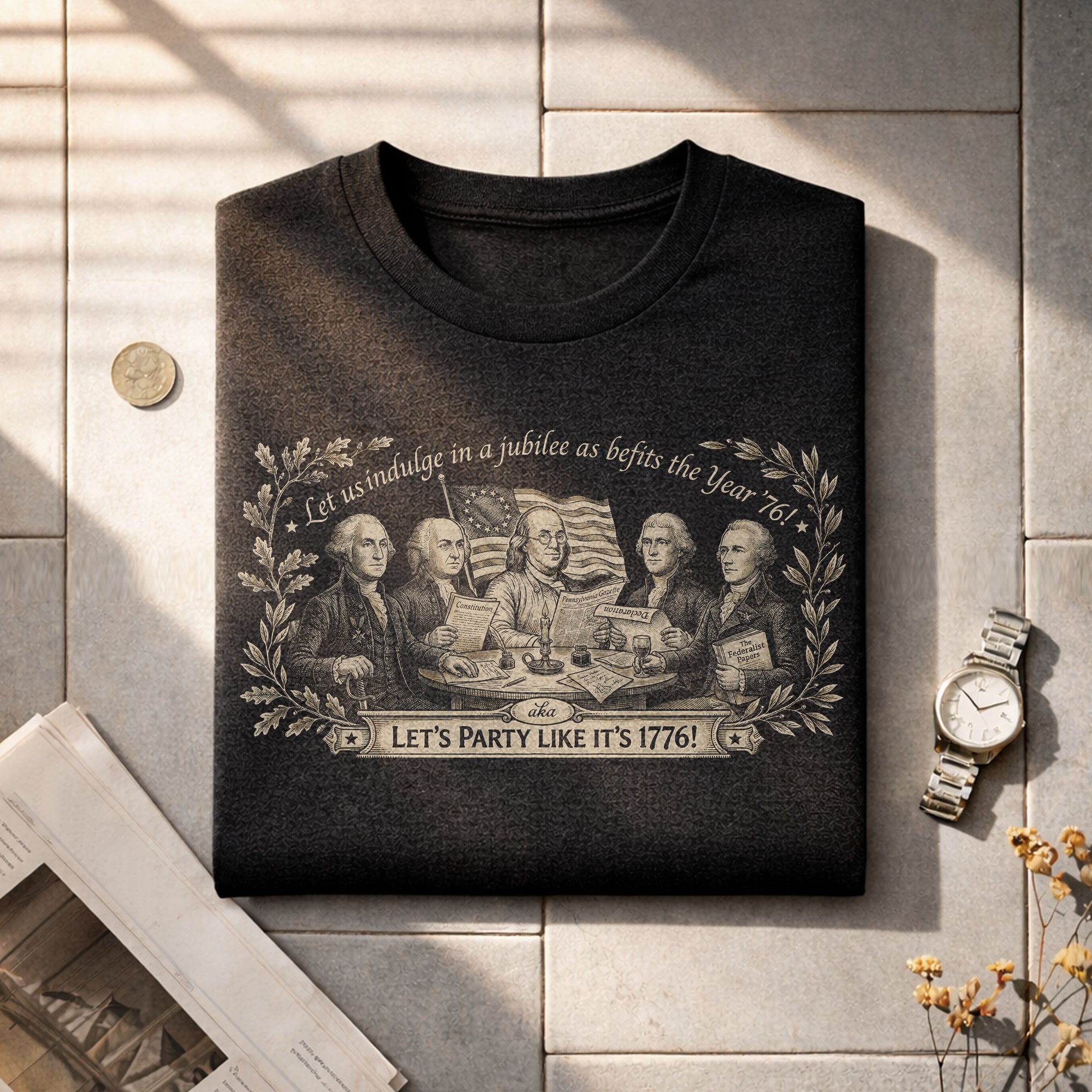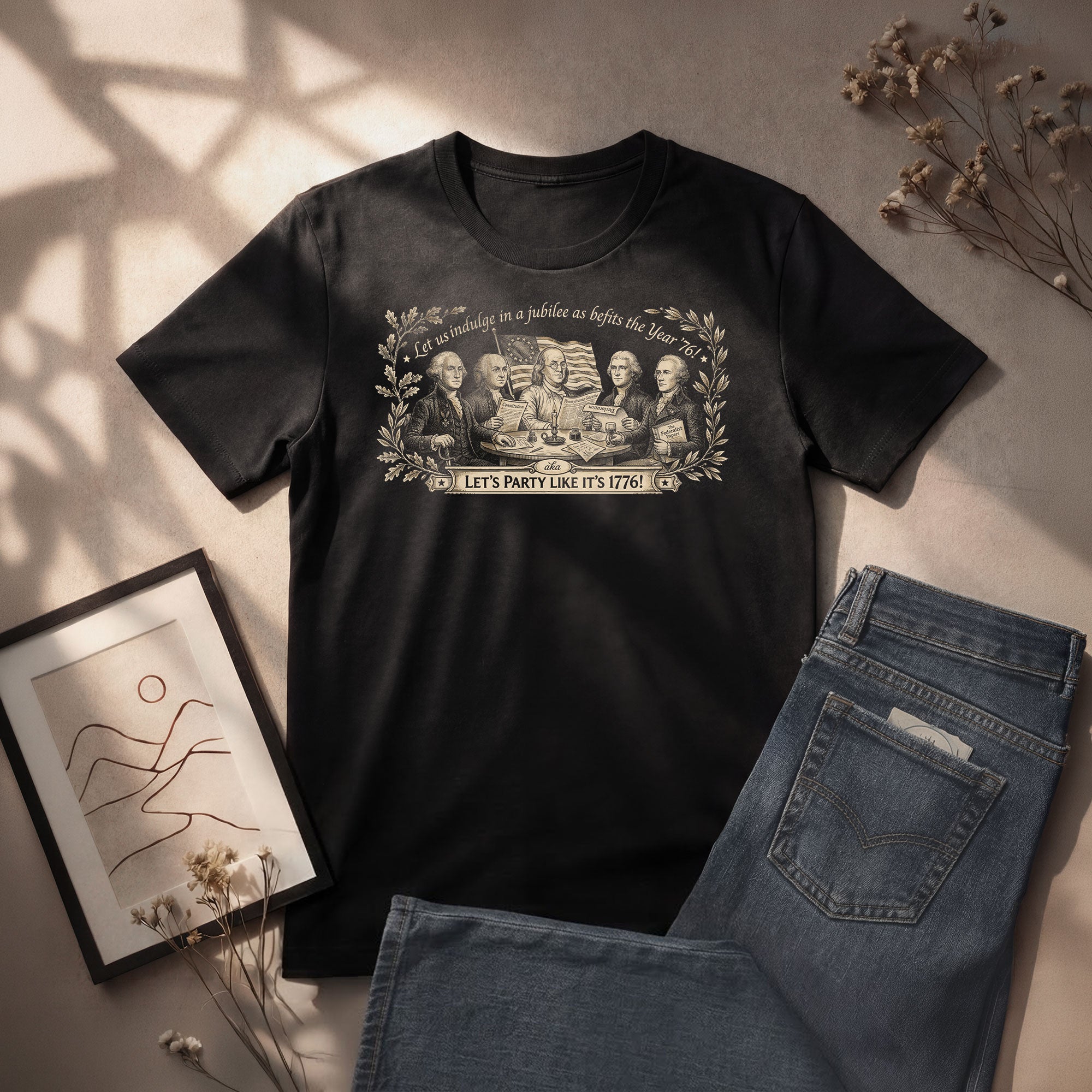 Classic 1776 Founding Fathers vintage T-shirt featuring a patriotic historical design and the quote “Let’s Party Like It’s 1776.” A comfortable unisex tee perfect for celebrating America’s 250th Anniversary, Independence Day, and patriotic events.