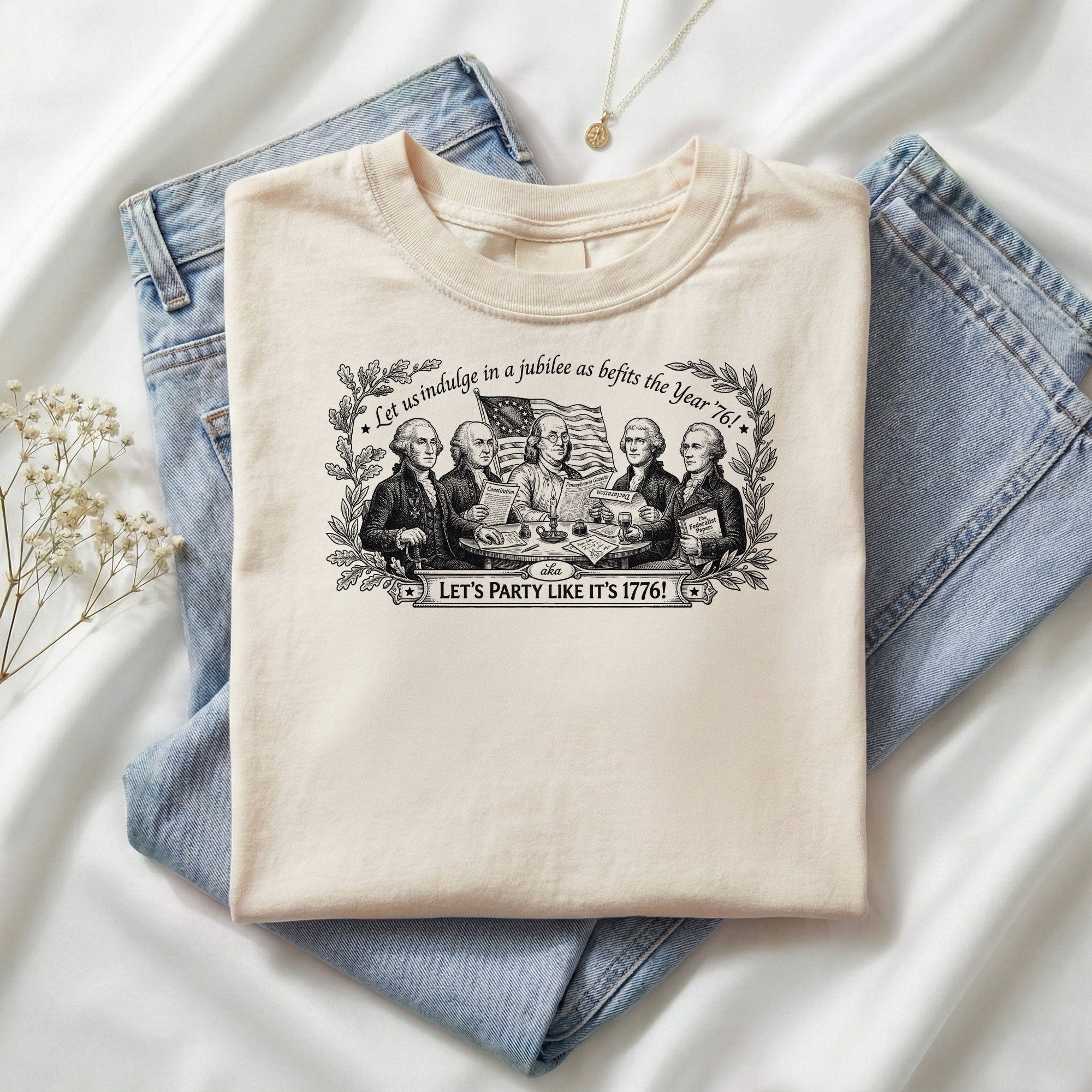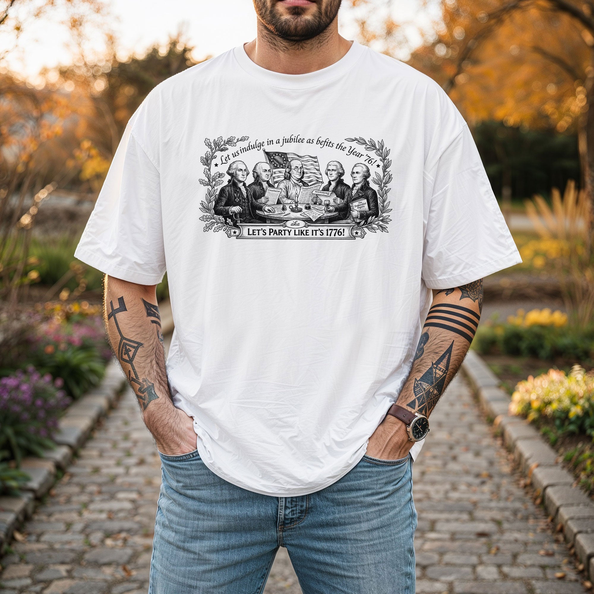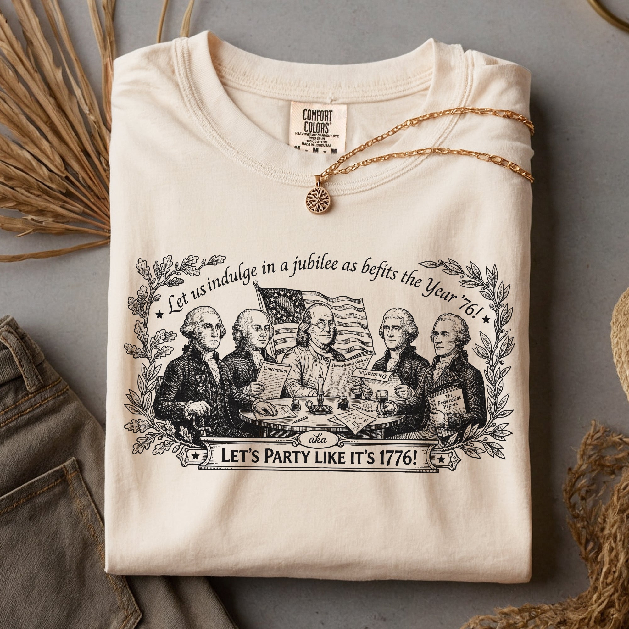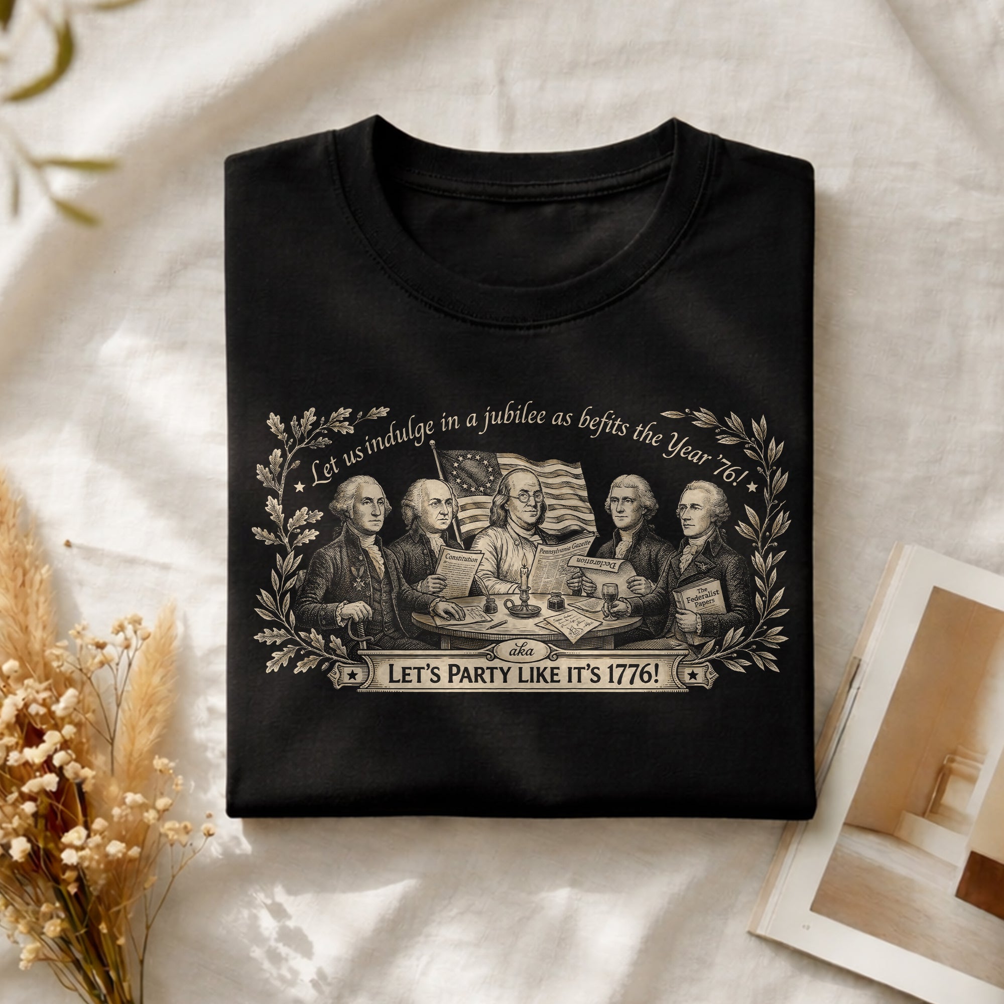 Classic 1776 Founding Fathers vintage T-shirt featuring a patriotic historical design and the quote “Let’s Party Like It’s 1776.” A comfortable unisex tee perfect for celebrating America’s 250th Anniversary, Independence Day, and patriotic events.