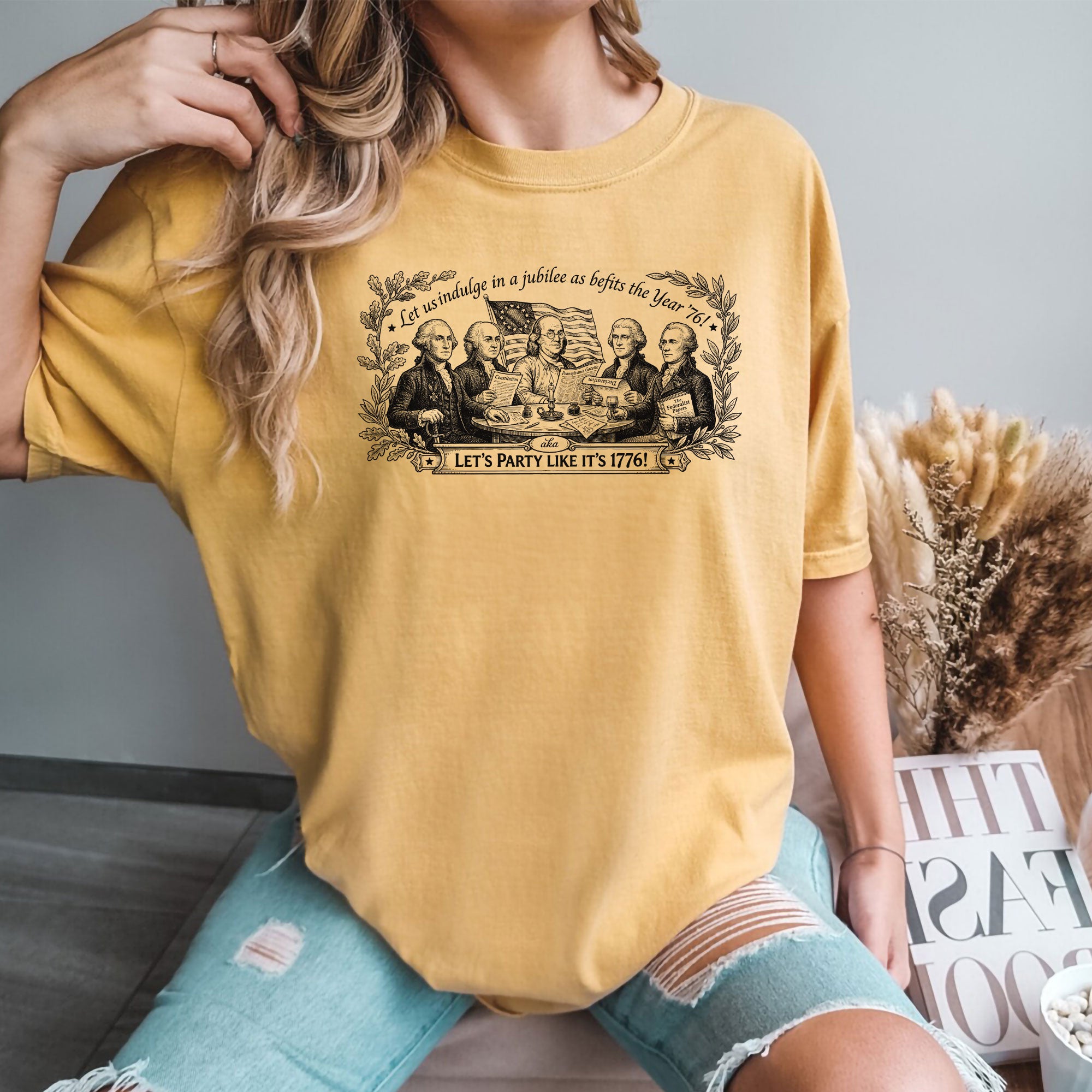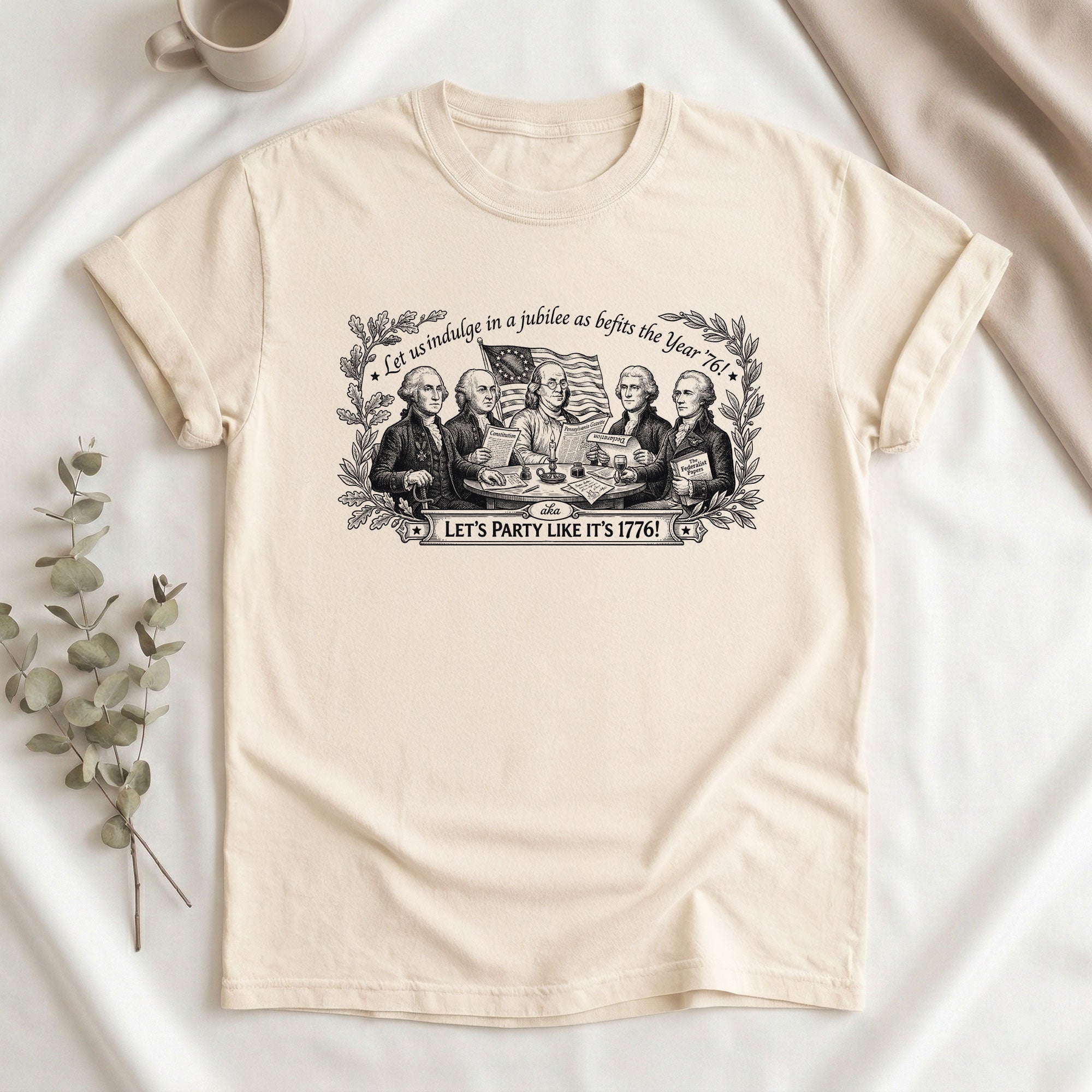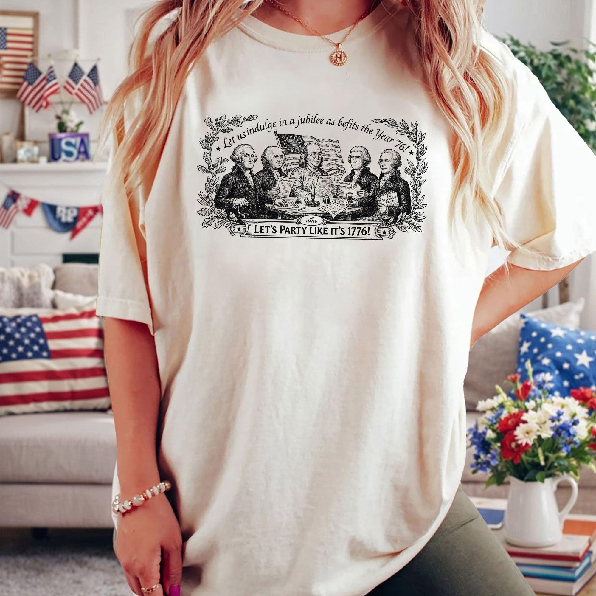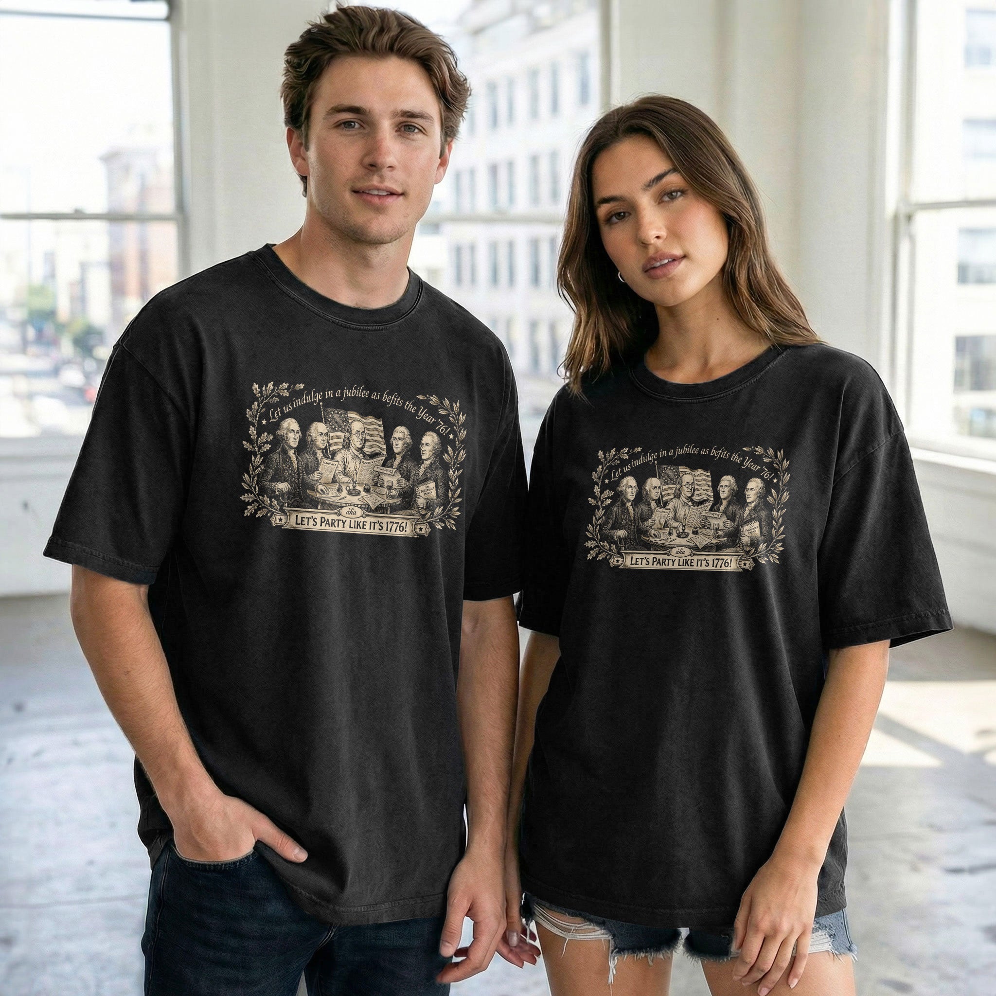 Classic 1776 Founding Fathers vintage T-shirt featuring a patriotic historical design and the quote “Let’s Party Like It’s 1776.” A comfortable unisex tee perfect for celebrating America’s 250th Anniversary, Independence Day, and patriotic events.