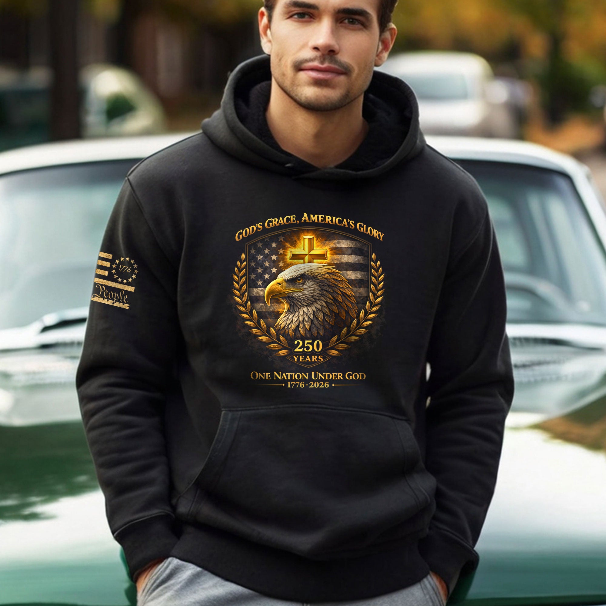 Featuring a powerful Bald Eagle and the Christian Cross, this premium hoodie commemorates America’s 250th Anniversary.A bold patriotic tribute to a Quarter-Millennium of liberty and divine blessings. The perfect keepsake gift for the 2026 milestone.