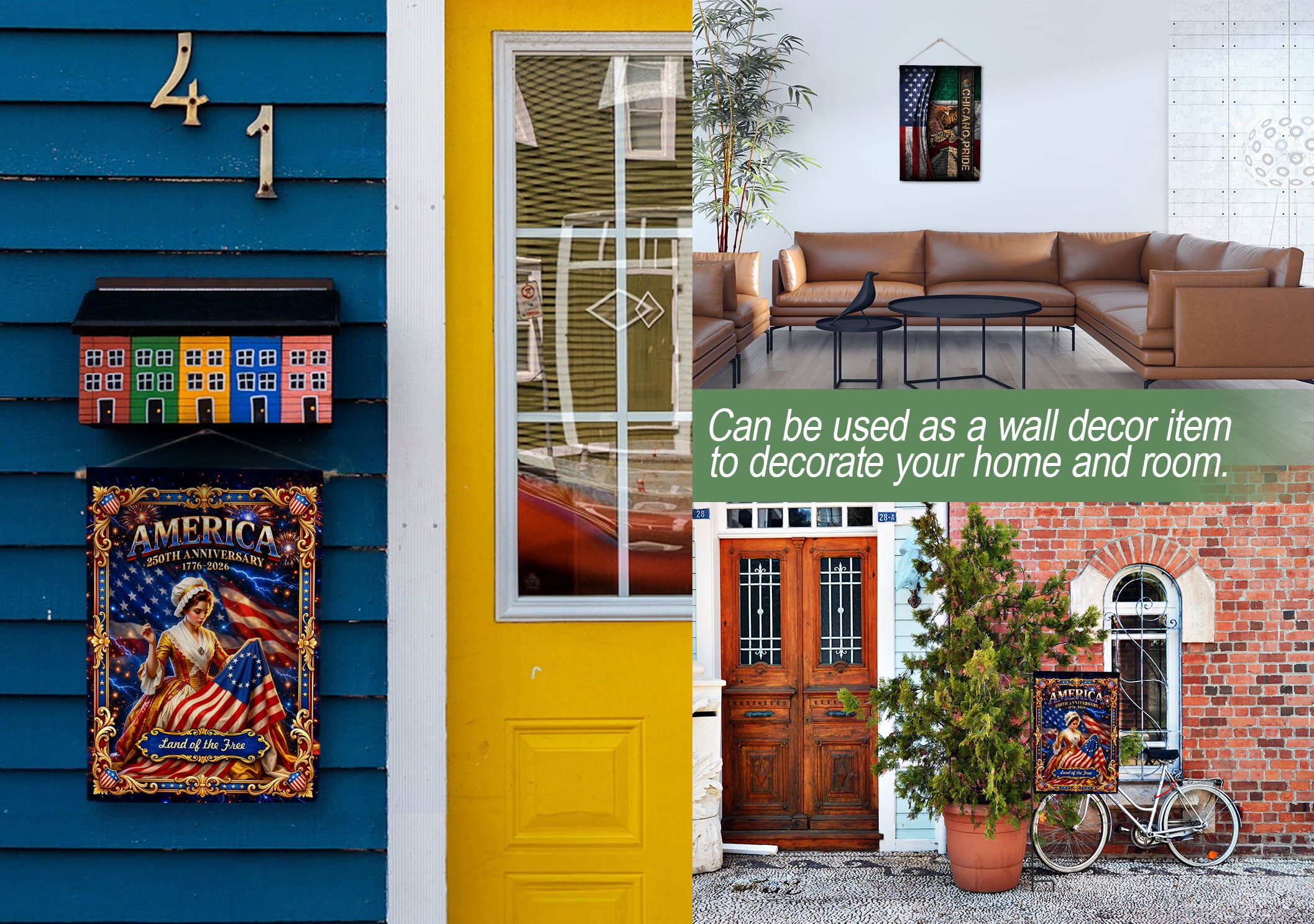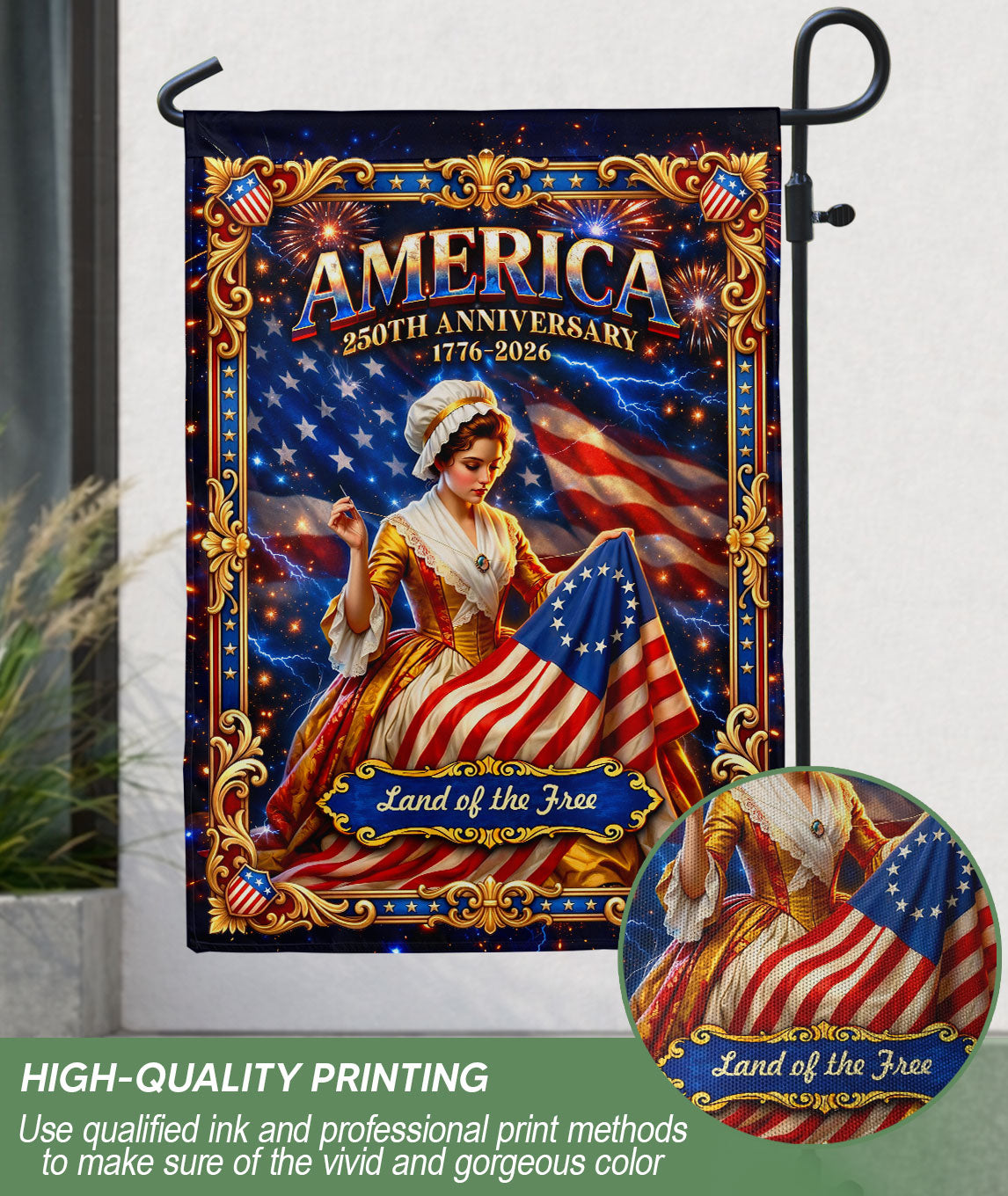 Celebrate 250 years of American independence with this elegant house flag featuring a Betsy Ross-inspired design and vintage patriotic artwork. Crafted with rich, durable colors and historic symbolism, it honors the spirit of freedom from 1776 to 2026. Perfect for porches, gardens, or home exteriors, this double-sided flag displays timeless American pride and heritage. Made from high-quality polyester fabric for weather resistance and long-lasting vibrancy, it’s an ideal decoration for patriotic holidays, Fourth of July, or everyday display of national pride.