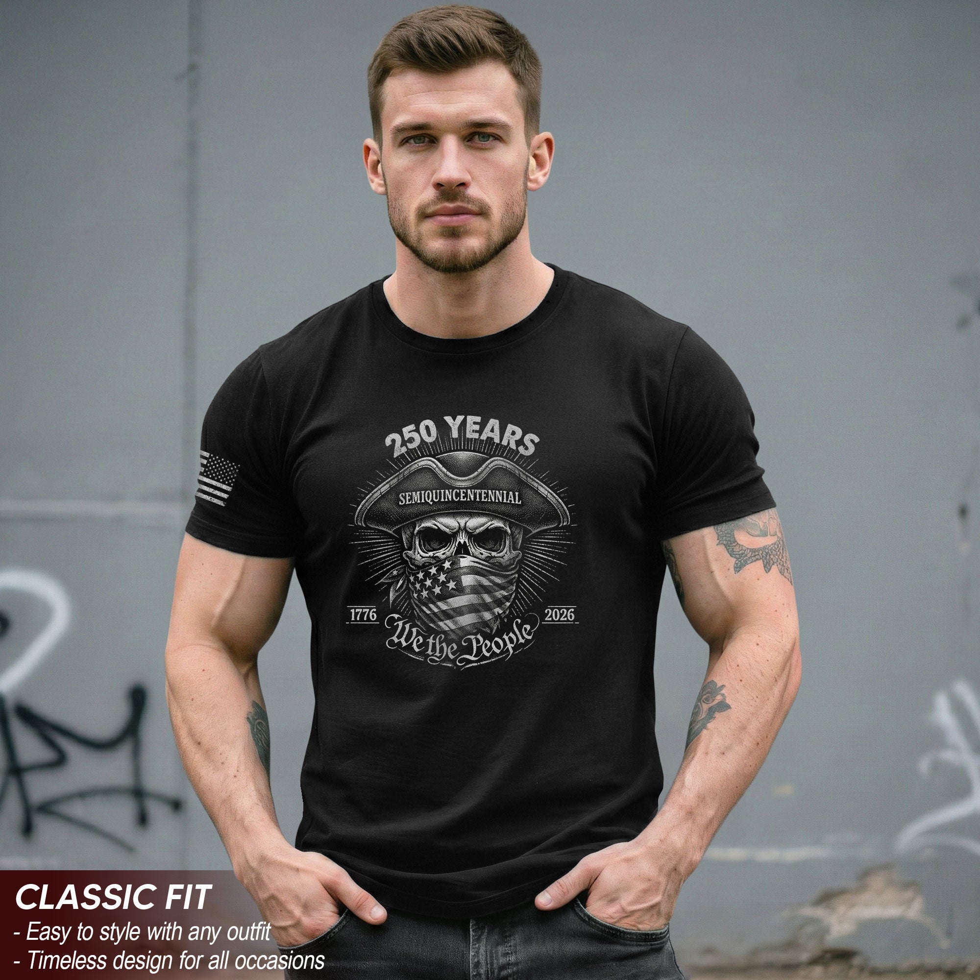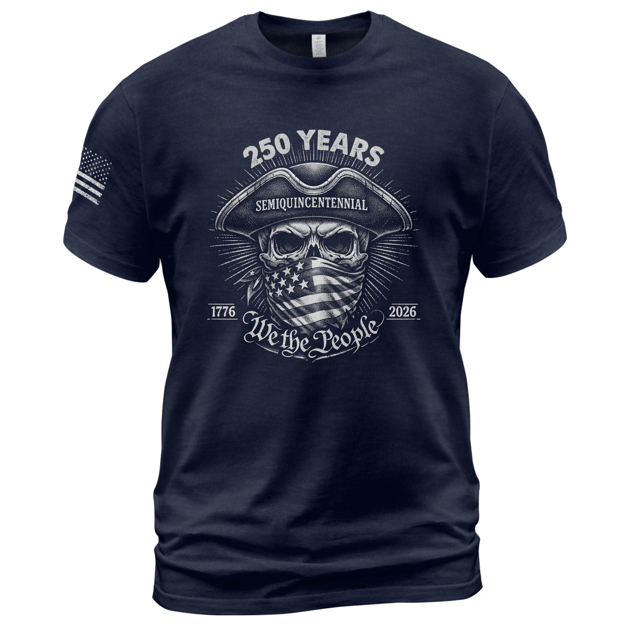 A bold, edgy take on revolutionary spirit.Blending “We The People” with a striking patriot-inspired skull graphic, this design captures the fearless determination that shaped America’s founding era and celebrates 250 years of freedom and resilience.