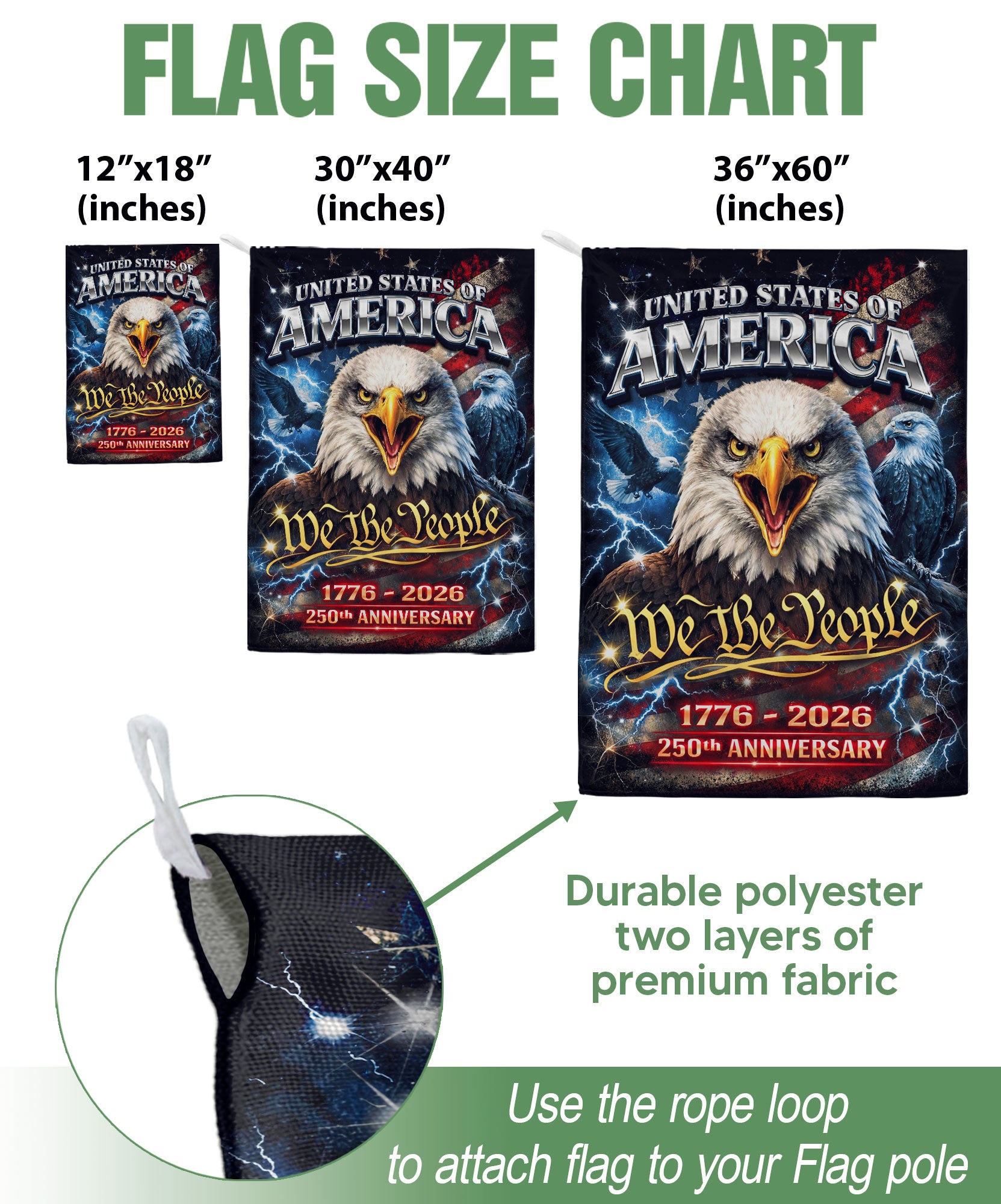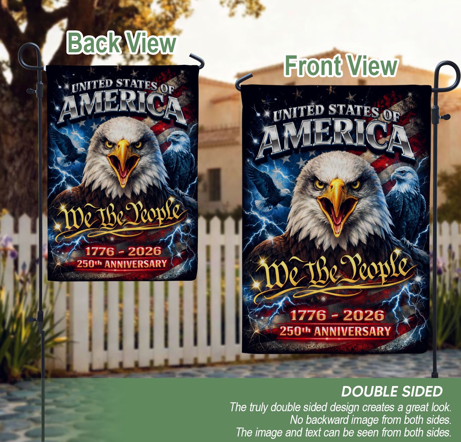 Celebrate America’s 250th anniversary with this double-sided garden flag featuring the iconic ‘We The People’ text and a powerful eagle graphic spanning 1776-2026. Crafted for outdoor durability, it showcases the enduring spirit of freedom, resilience, and national pride. Perfect for displaying in your yard, porch, garden, or patio to honor this historic milestone. The vibrant, weather-resistant design ensures long-lasting color on both sides, making it an ideal decorative accent for patriotic events, holidays, or everyday patriotism.