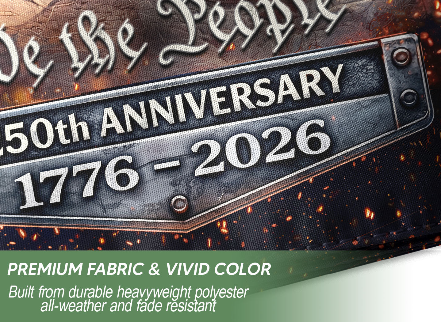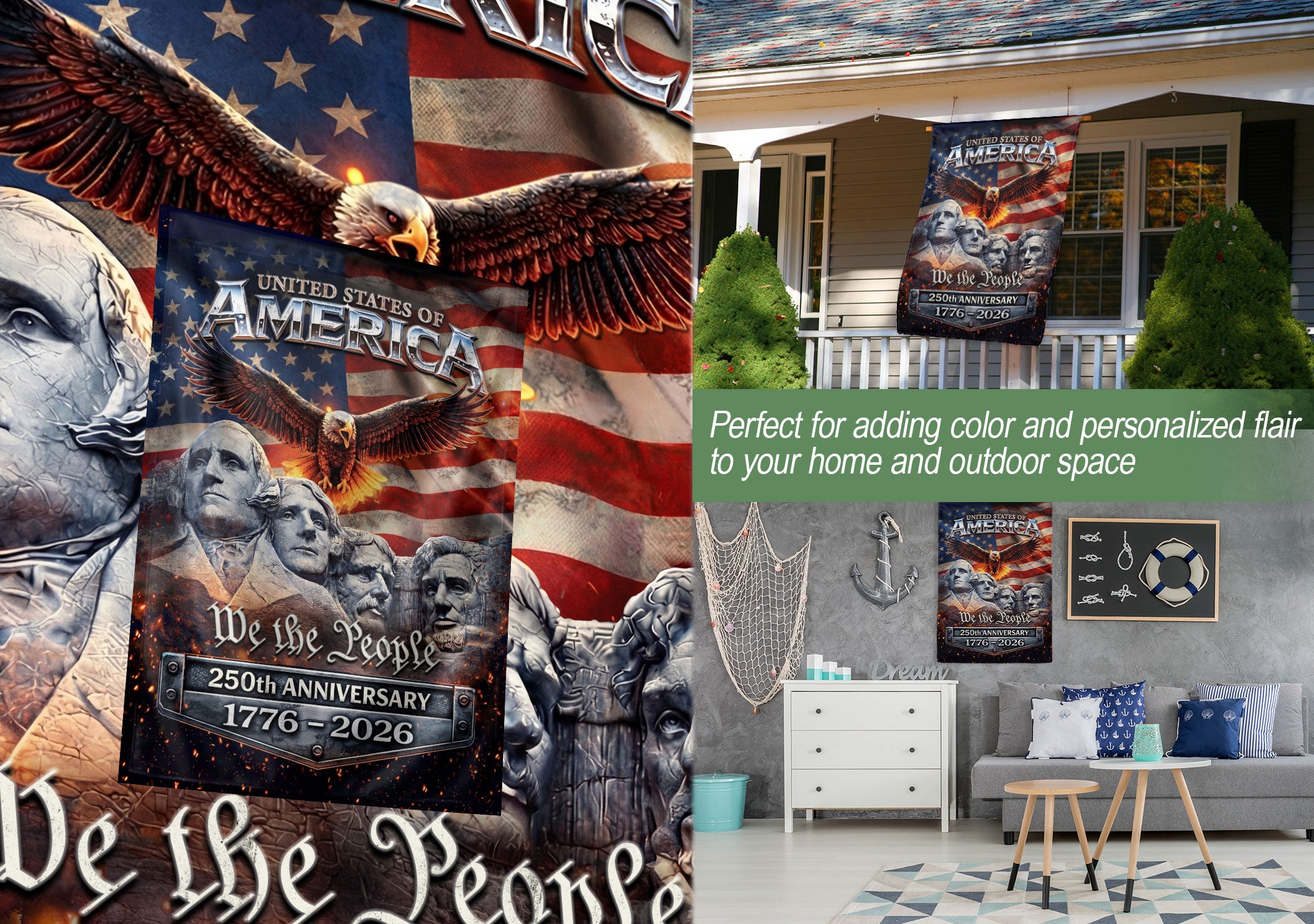 Celebrate 250 years of American independence with this striking double-sided house flag spanning 1776-2026. Featuring the iconic Mount Rushmore presidents, a majestic soaring eagle, and the bold stars and stripes of the American flag, this patriotic outdoor yard decor honors the nation’s enduring legacy of freedom and resilience. Crafted for durability, it’s perfect for porches, gardens, or any outdoor space to display your USA pride year-round. Weather-resistant design ensures vibrant colors and clear graphics withstand the elements, making it an ideal tribute for the 250th anniversary festivities.