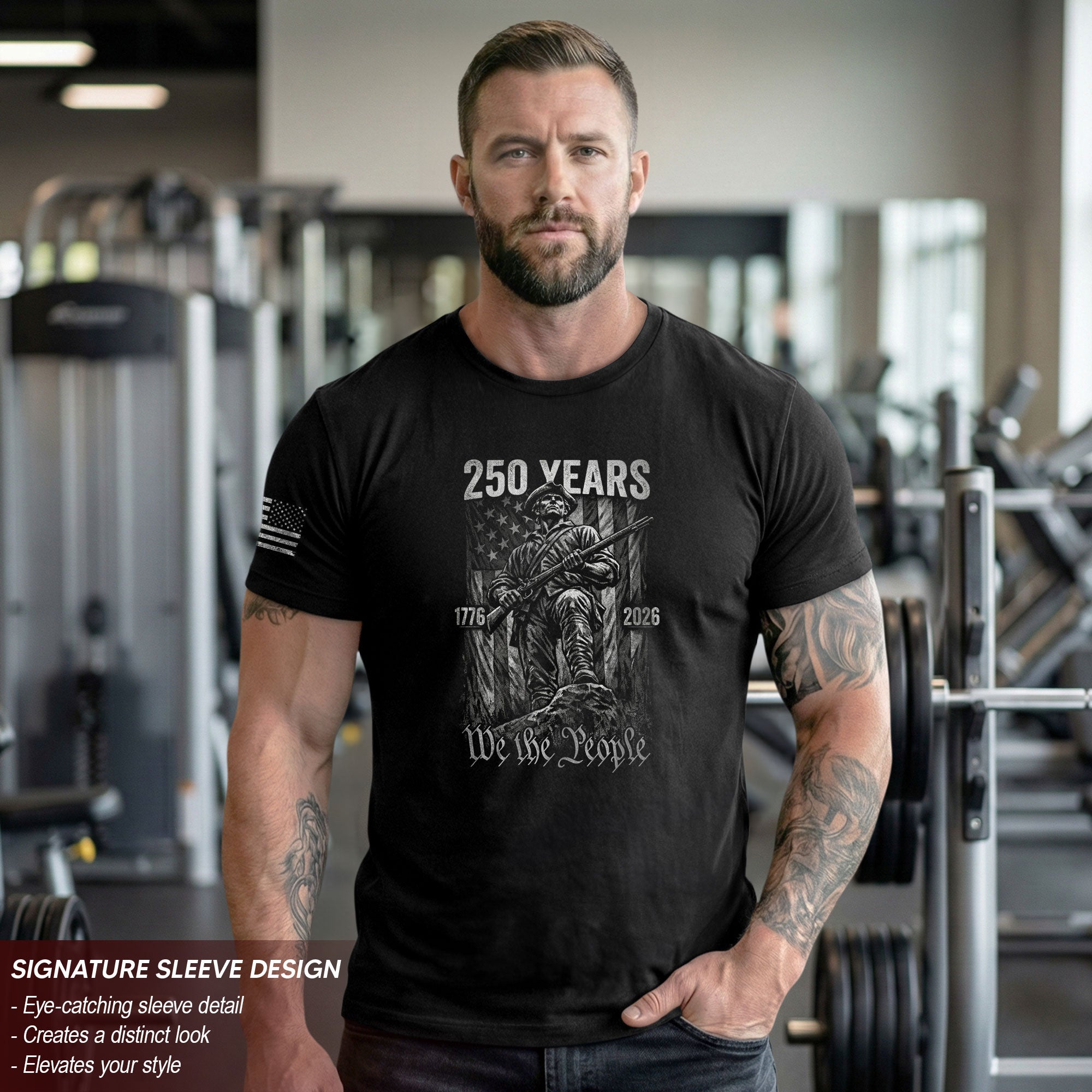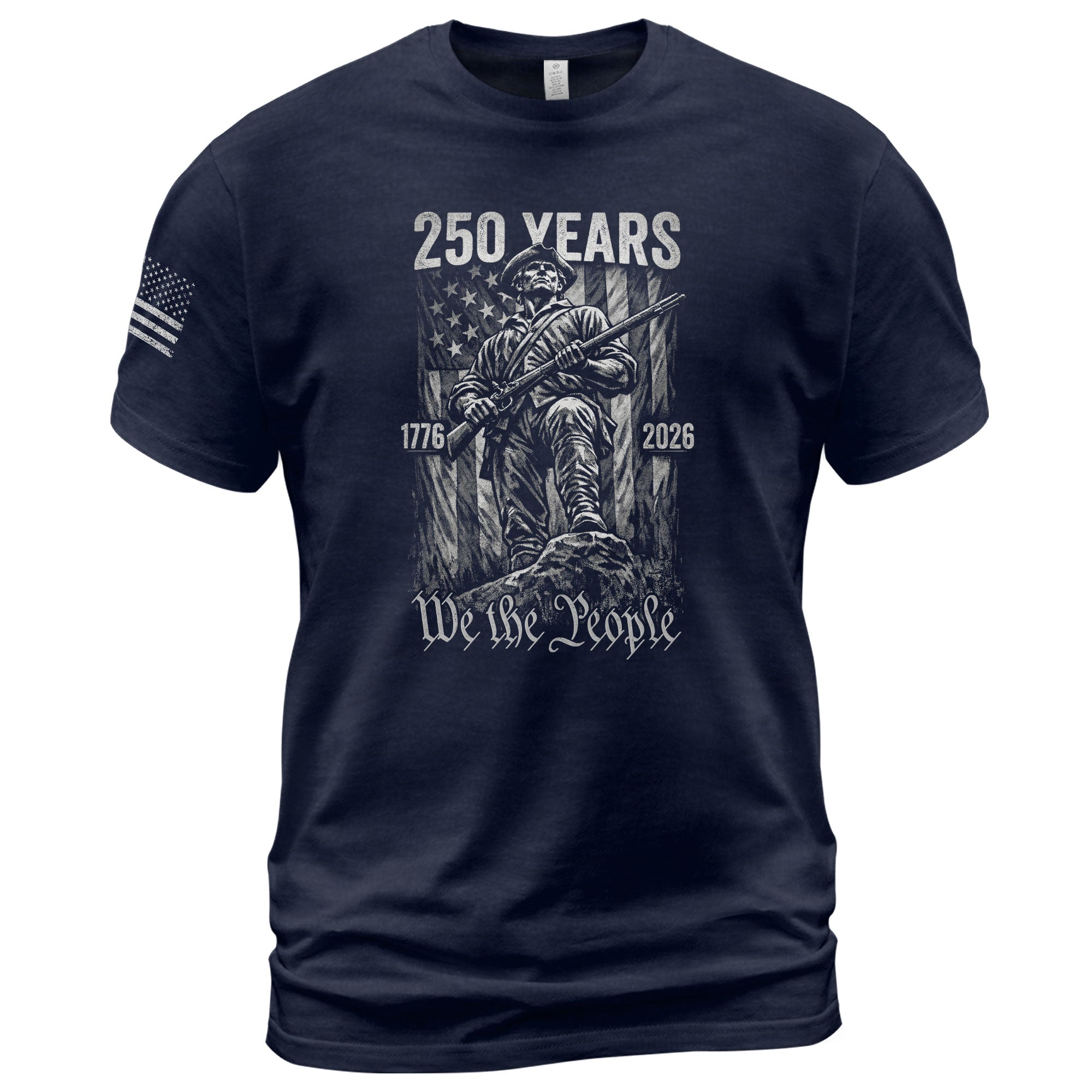 A tribute to the courage that sparked a nation. Inspired by the heroes of the American Revolution, this premium tee features the Minuteman alongside the iconic “We The People” script. Marking America’s 250th Anniversary (1776–2026), this design honors the strength and sacrifice that have shaped our history.
