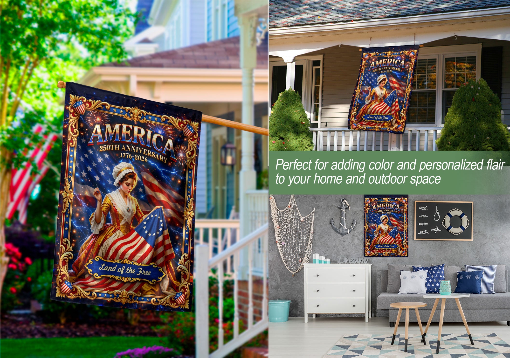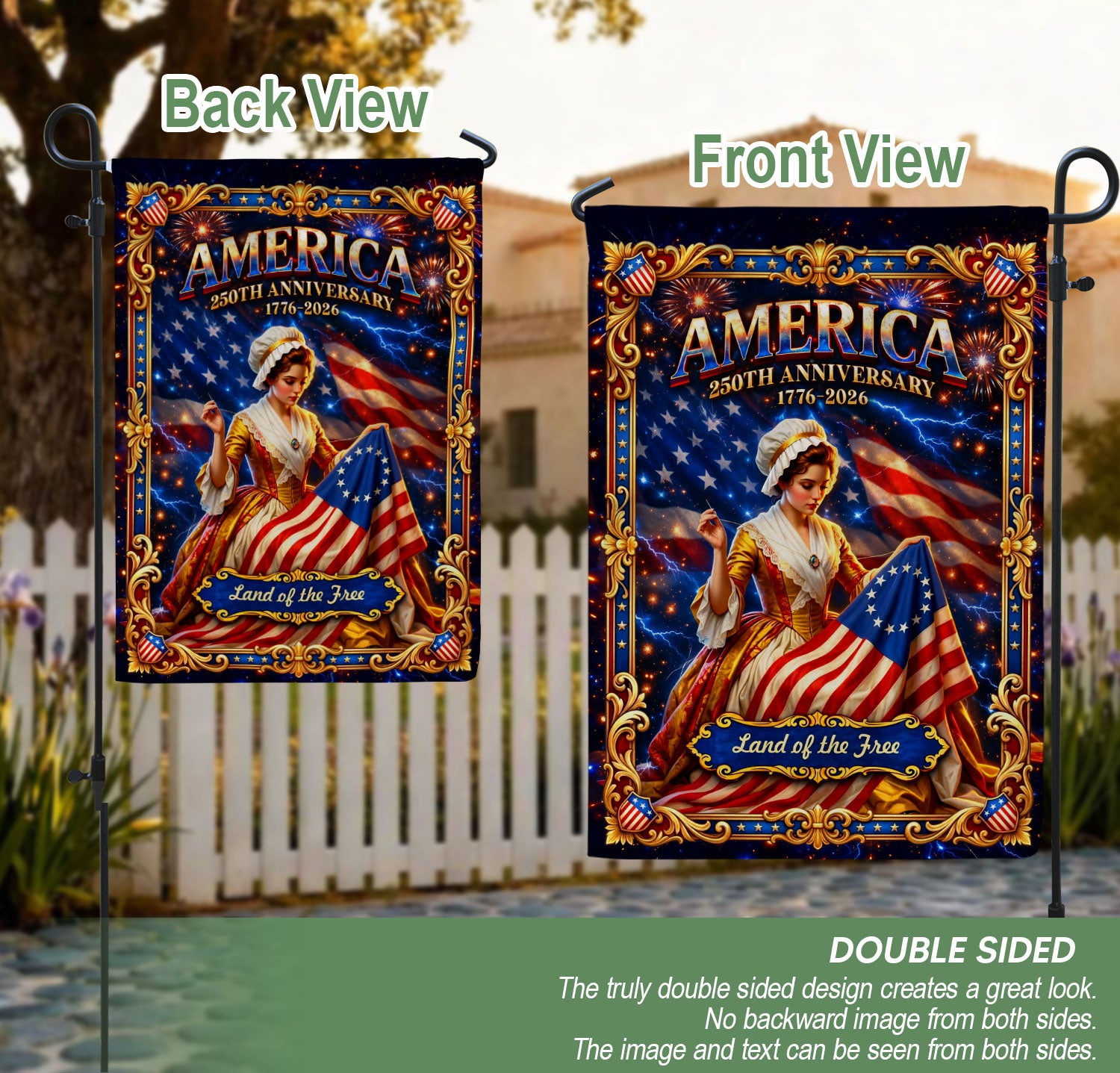 Celebrate America’s 250th anniversary with this Betsy Ross-inspired garden flag. Featuring vintage patriotic artwork from 1776 and the ‘Land of the Free’ theme, this elegant outdoor flag honors timeless American heritage and pride. Perfect for garden, yard, porch, or patio decoration, it adds a classic, meaningful touch to any outdoor space. Durable design withstands weather elements while showcasing historical charm for Independence Day, Memorial Day, or everyday patriotism.