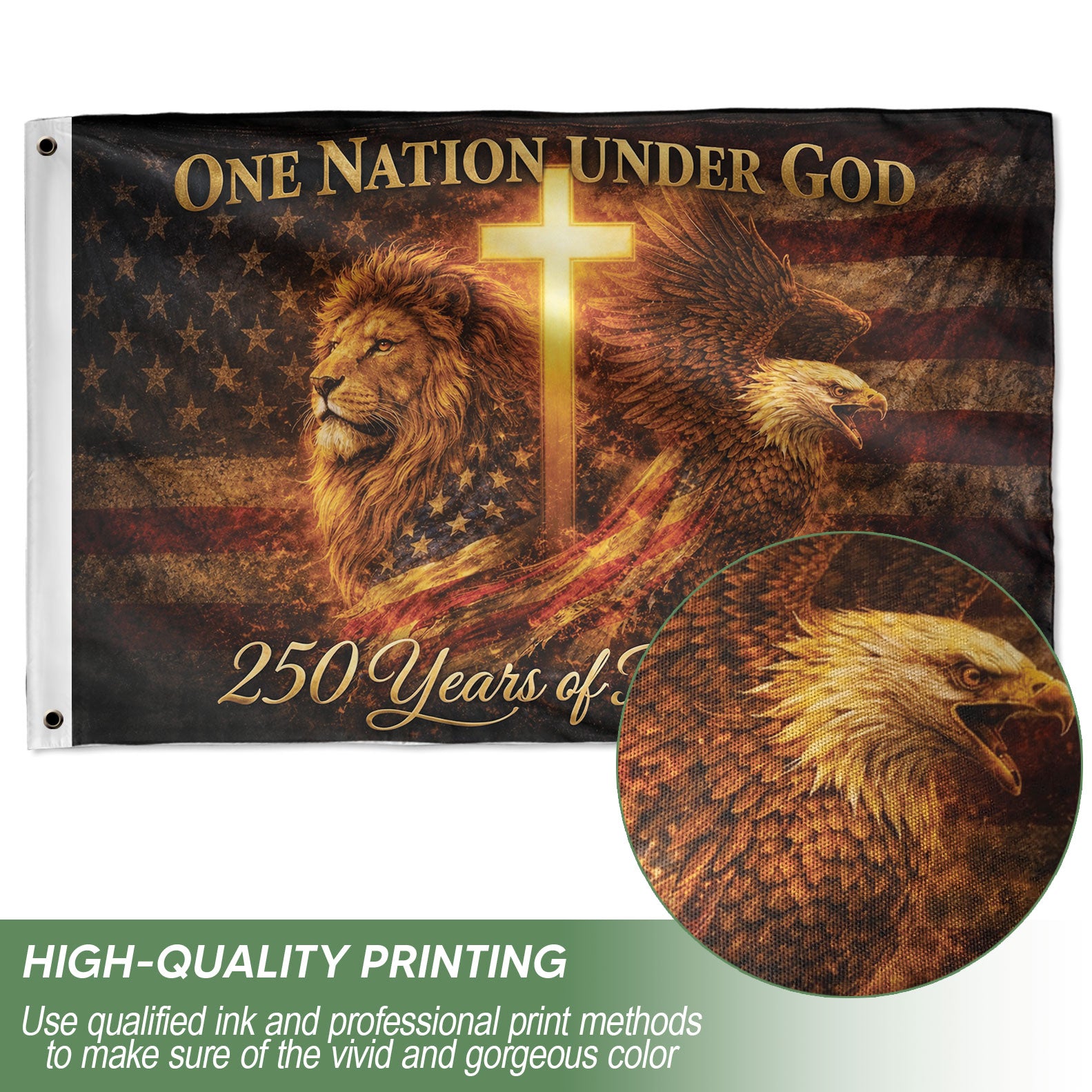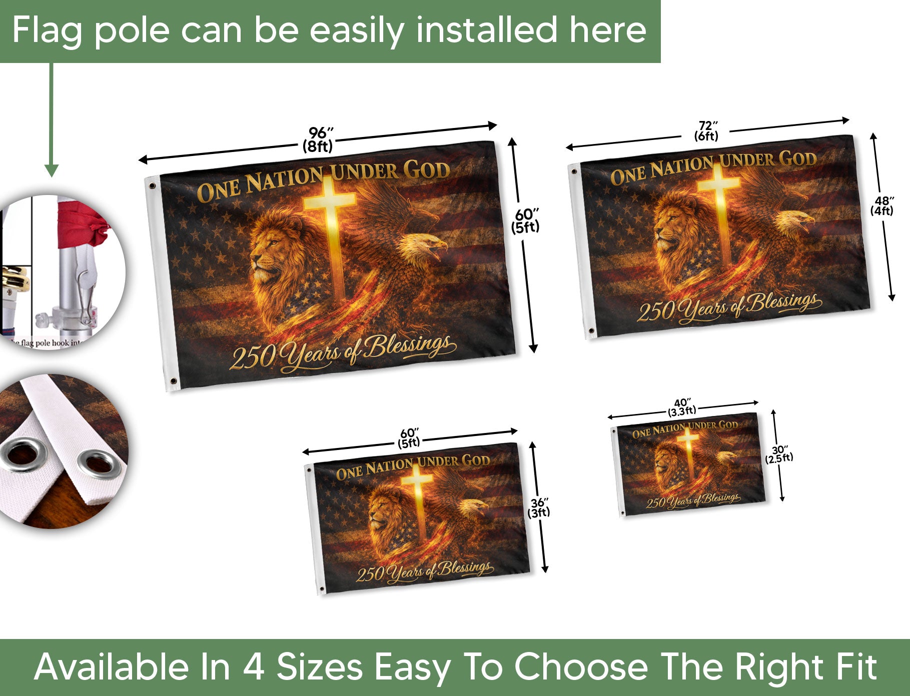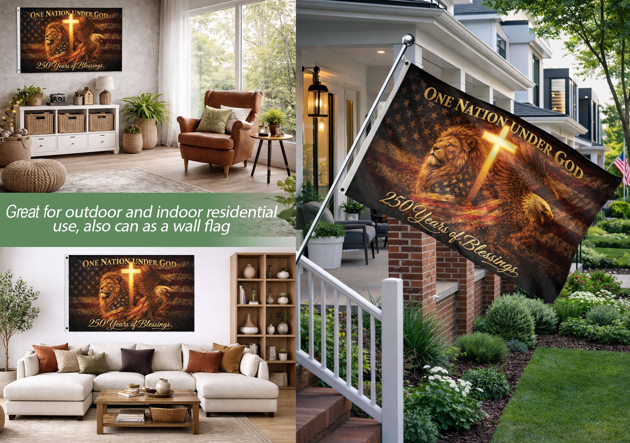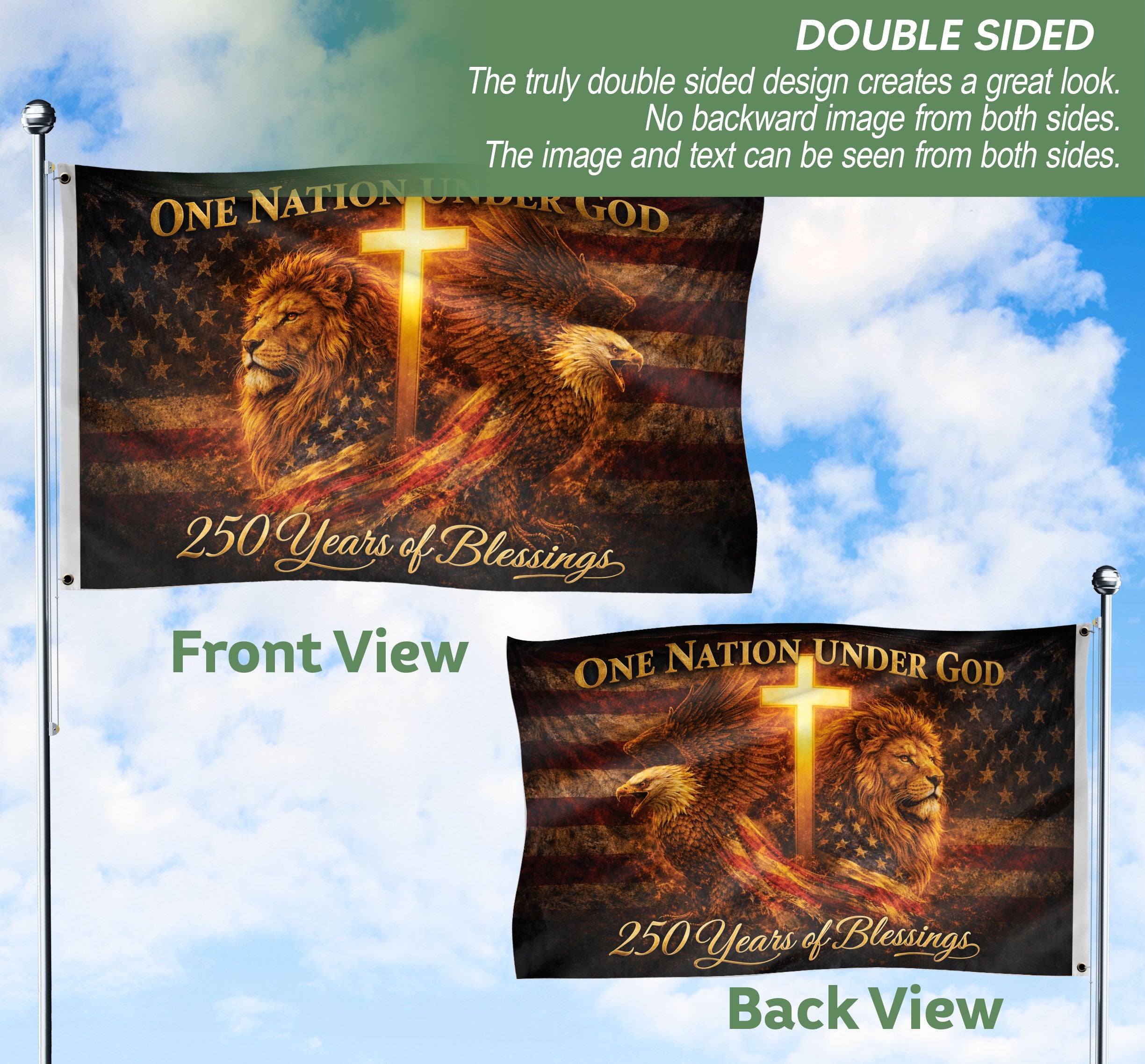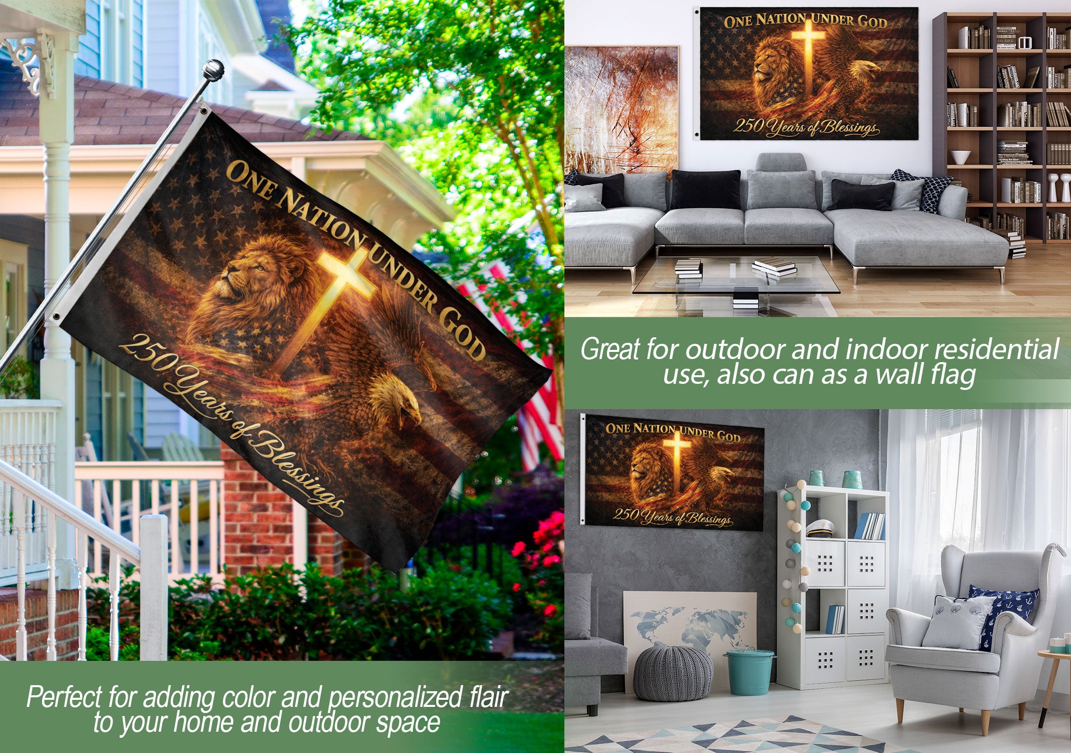Celebrate America’s 250th anniversary with this striking Christian patriotic house flag. Featuring a bold design with a shining cross, majestic lion, and soaring eagle, it symbolizes unwavering faith, strength, and freedom. The prominent message ‘One Nation Under God’ honors the nation’s Christian heritage and patriotic spirit. Crafted from durable, weather-resistant polyester fabric, this double-sided flag measures standard house flag size for easy display on porches, gardens, or flagpoles. Ideal for Christian homes, churches, 4th of July celebrations, Memorial Day, or any display of American pride and religious devotion. Fade-resistant colors ensure long-lasting vibrancy outdoors. Show your faith and patriotism with this meaningful 250th anniversary USA flag.