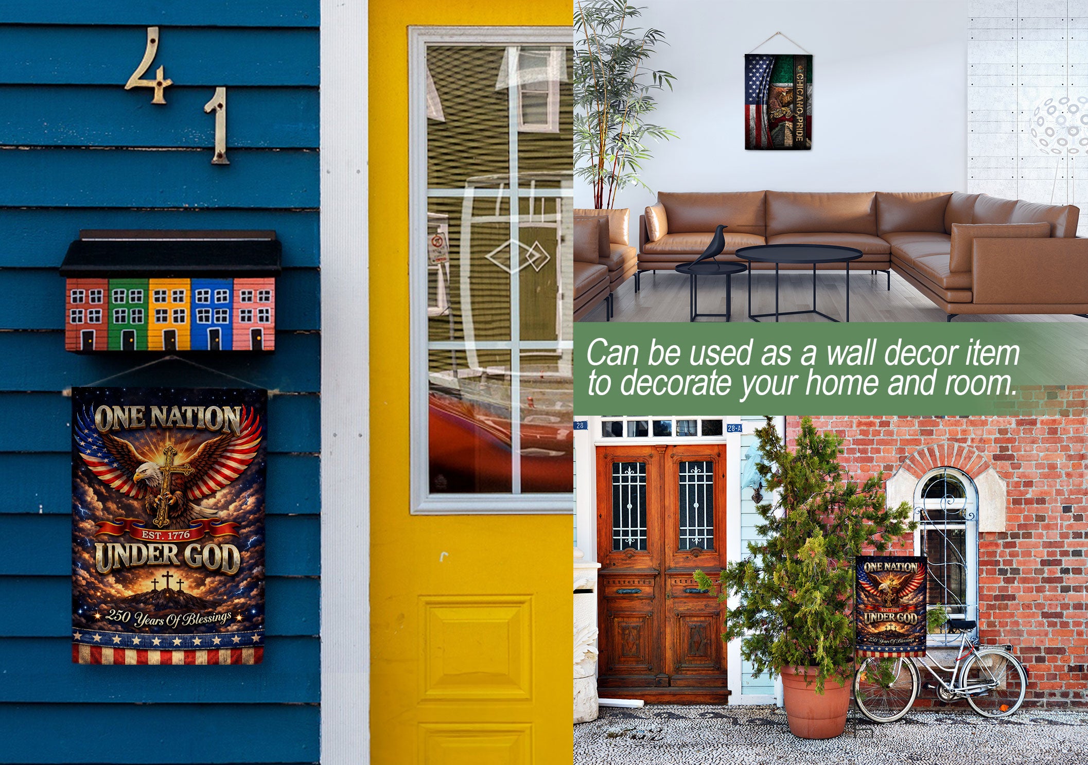 Celebrate America’s 250th anniversary with this patriotic Christian garden flag featuring a bold eagle and glowing cross design. The flag proudly displays ‘One Nation Under God’ in vibrant colors, commemorating the period from 1776 to 2026. Crafted for durability, it’s ideal for gardens, yards, porches, or patios to showcase faith, national pride, and spiritual strength. Weather-resistant material ensures long-lasting display through seasons. Perfect for patriots, Christians, and history enthusiasts wanting to honor the nation’s heritage.