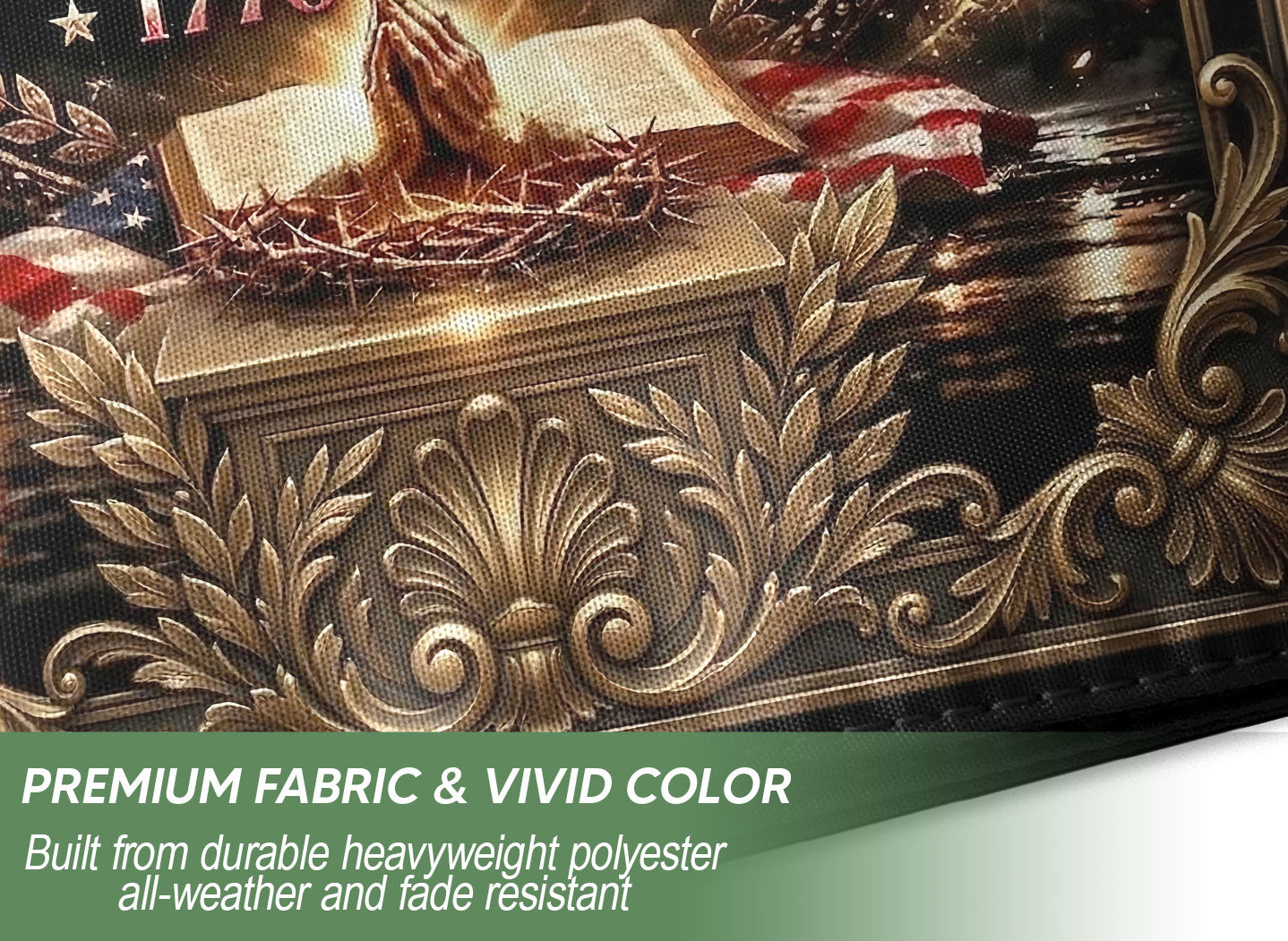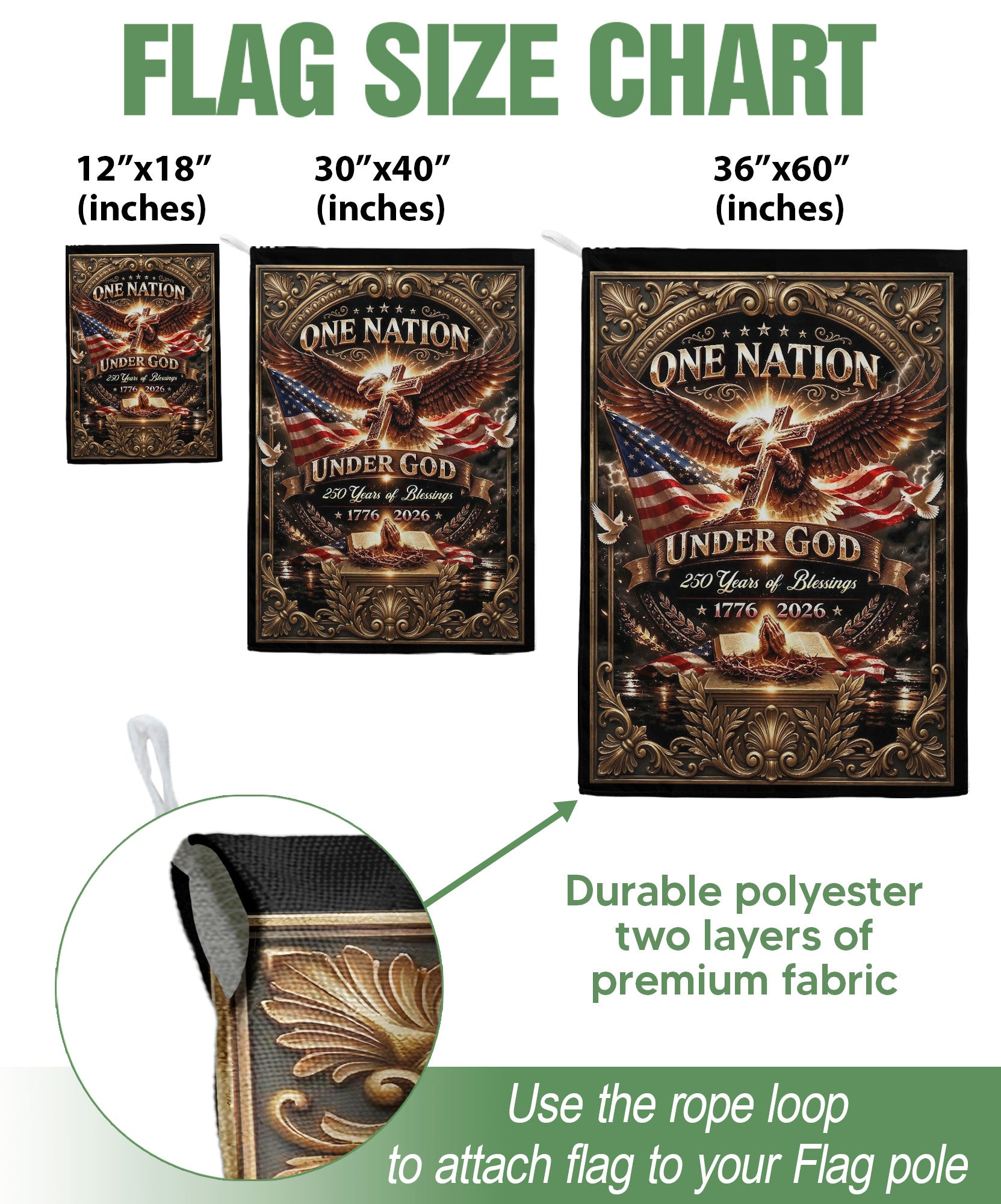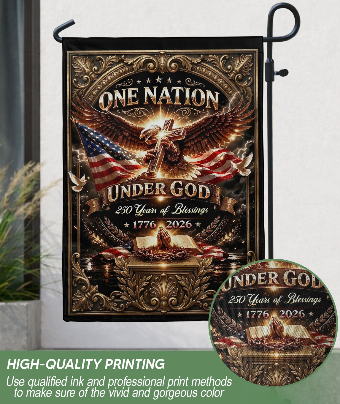 Celebrate 250 years of American blessings with this Christian One Nation Under God garden flag. Featuring a striking eagle and cross design, it symbolizes strength, faith, hope, and divine guidance over the nation’s history from 1776 to 2026. Crafted for outdoor use, this patriotic faith banner is ideal for gardens, porches, mailboxes, or patios. Made from durable, weather-resistant polyester fabric to withstand sun, wind, and rain while maintaining vibrant colors. Double-sided printing ensures clear visibility from both sides. Easy to hang with a sleeve for standard garden flag poles (pole not included). Perfect for Independence Day, Memorial Day, Fourth of July, or everyday display of Christian patriotism and gratitude to God. Measures approximately 12.5 x 18 inches, standard garden flag size. Express your belief in ‘One Nation Under God’ with this meaningful USA commemorative flag.