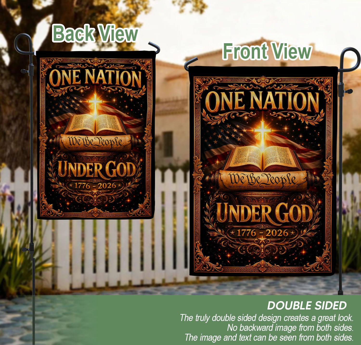 Celebrate America’s 250th anniversary with this striking Christian house flag featuring a Bible and cross design. The bold ‘One Nation Under God We The People’ message honors faith, freedom, and patriotism from 1776 to 2026. Perfect for displaying outside your home, this durable patriotic banner showcases national pride and religious devotion. Crafted for outdoor use, it withstands weather while proudly waving your American heritage. Ideal for holidays, Independence Day, or everyday display to inspire neighbors and passersby with its timeless message of unity under God.