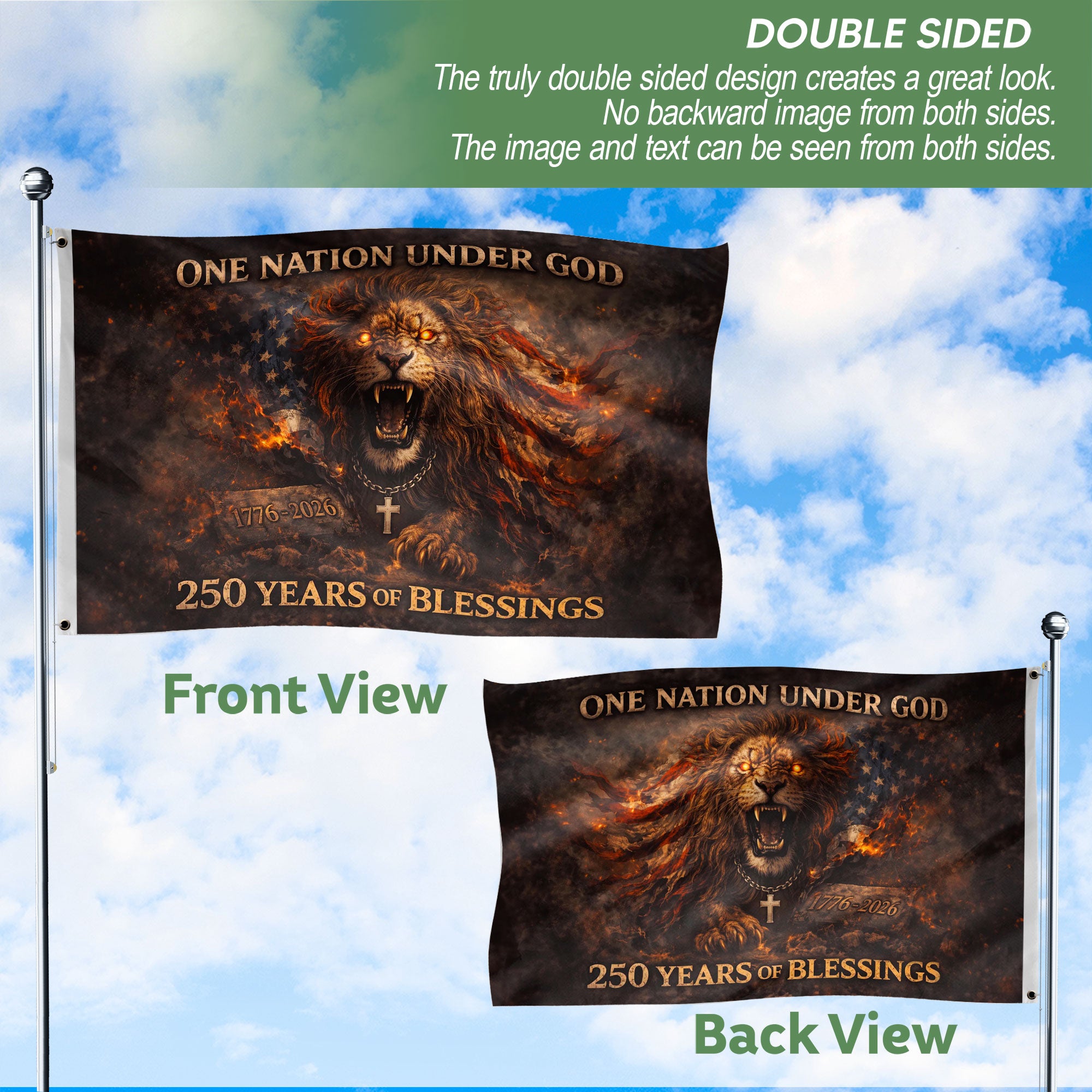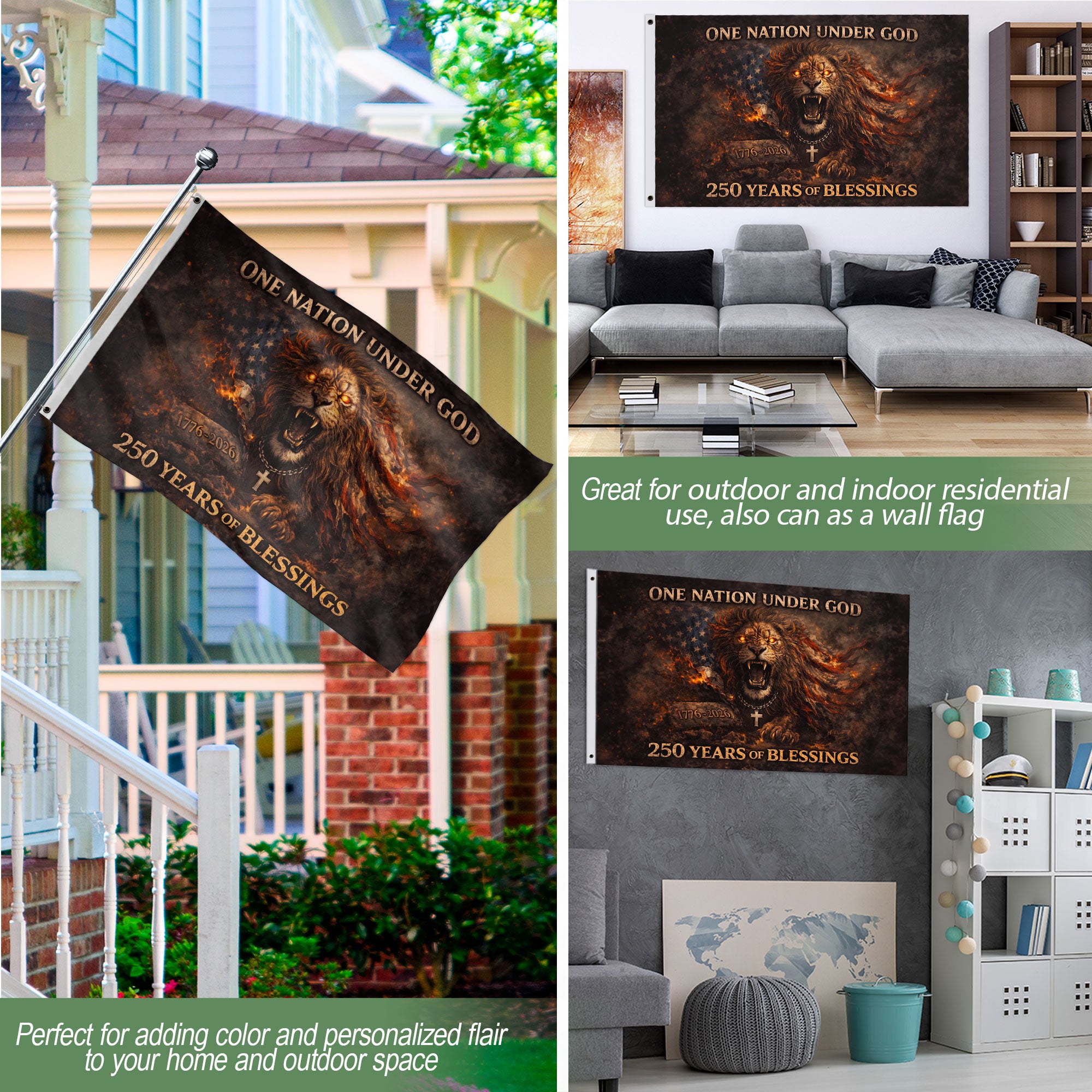 Celebrate America’s 250th anniversary from 1776 to 2026 with this Christian patriotic double-sided house flag. Featuring the iconic Lion of Judah symbol and ‘One Nation Under God’ message, it honors generations of faith, freedom, devotion, courage, and trust in divine guidance. This durable all-weather banner is perfect for displaying on your home, garden, or porch, showcasing national pride rooted in biblical values. The high-quality printed design ensures vibrant colors and sharp details visible from both sides, making it ideal for patriots, Christians, and history enthusiasts. Crafted for outdoor use, it withstands wind, rain, and sun while maintaining its bold appearance.