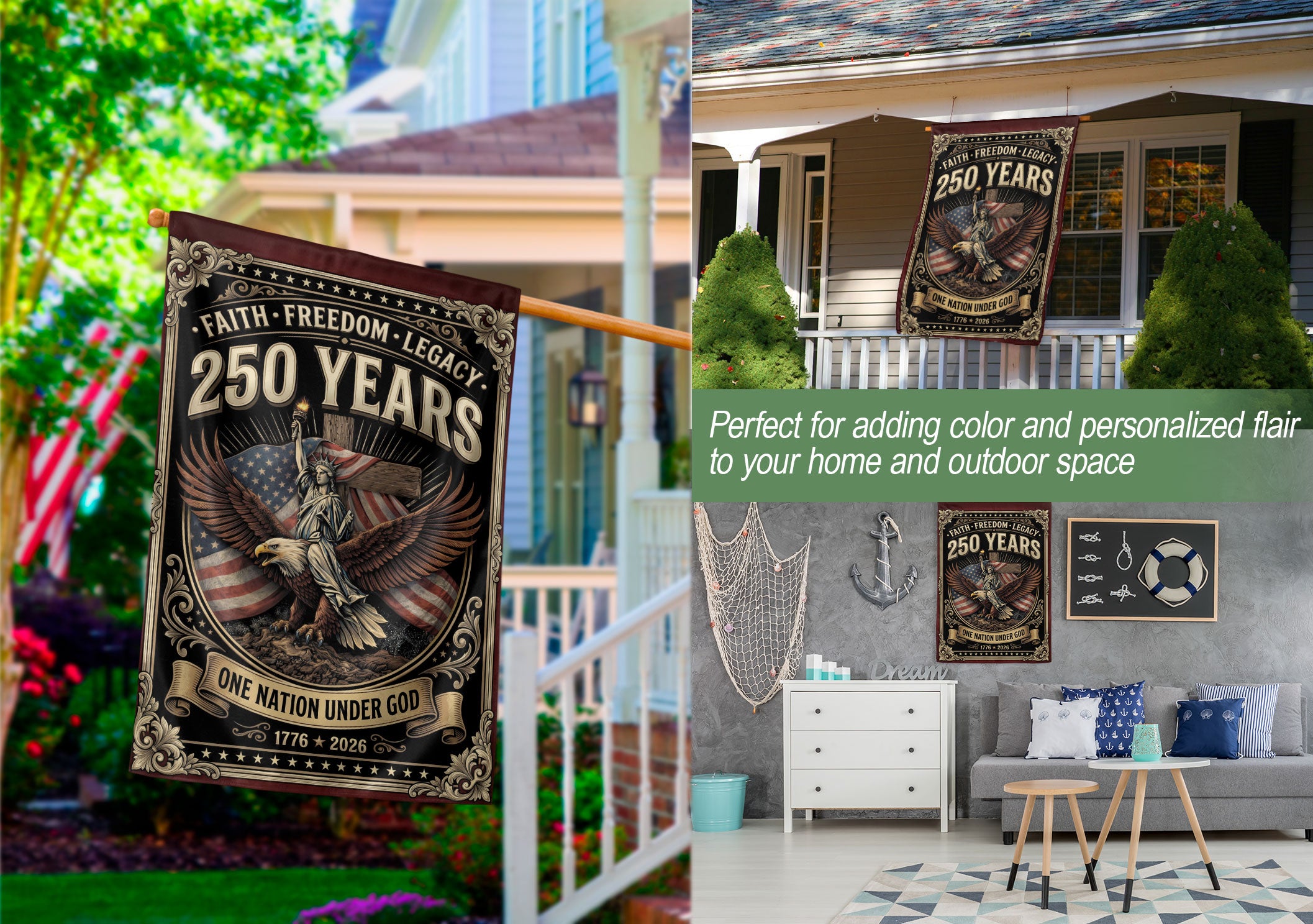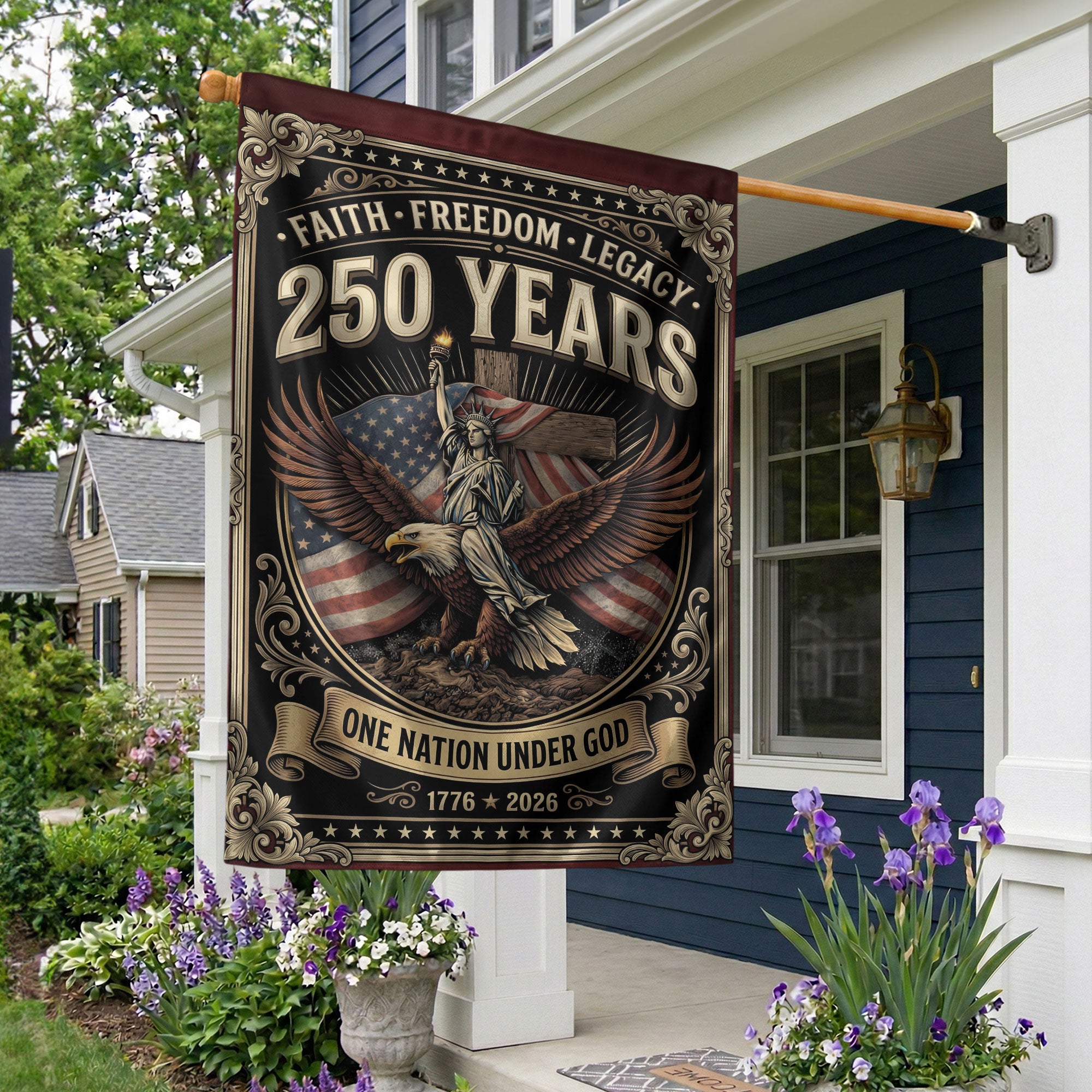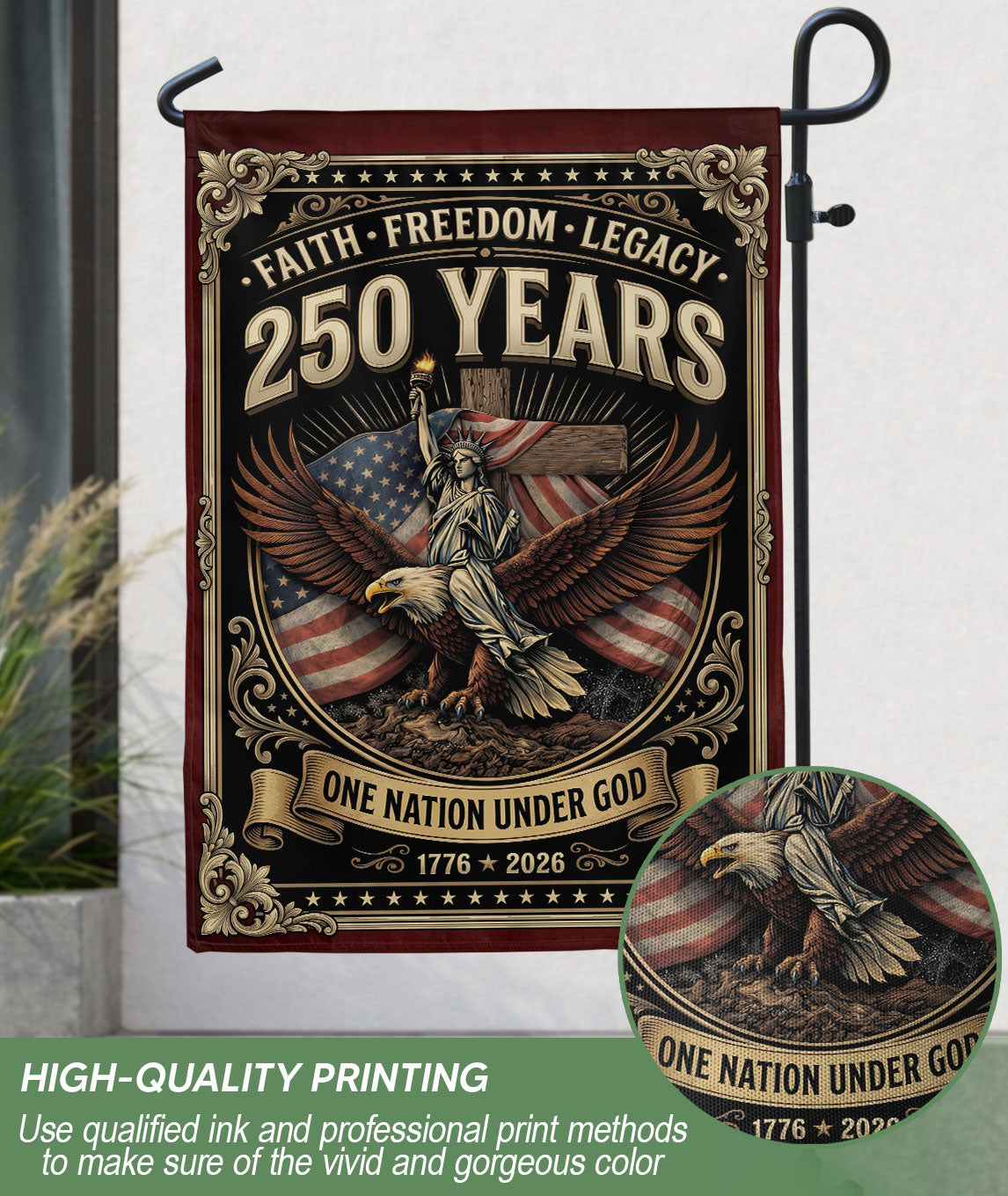 Celebrate American heritage and Christian faith with this double-sided patriotic garden flag. The bold design features ‘One Nation Under God,’ a majestic eagle, patriotic cross, ‘We The People,’ and ‘Faith and Freedom’ to honor 250 years of USA independence, unity, and liberty. Crafted for durability, this garden flag withstands outdoor conditions and displays proudly from both sides. Ideal for gardens, porches, patios, or yards, it’s perfect for patriots, Christians, and history lovers. Use it year-round or during holidays like Independence Day, Memorial Day, and the 250th anniversary celebrations to showcase national pride and spiritual values.