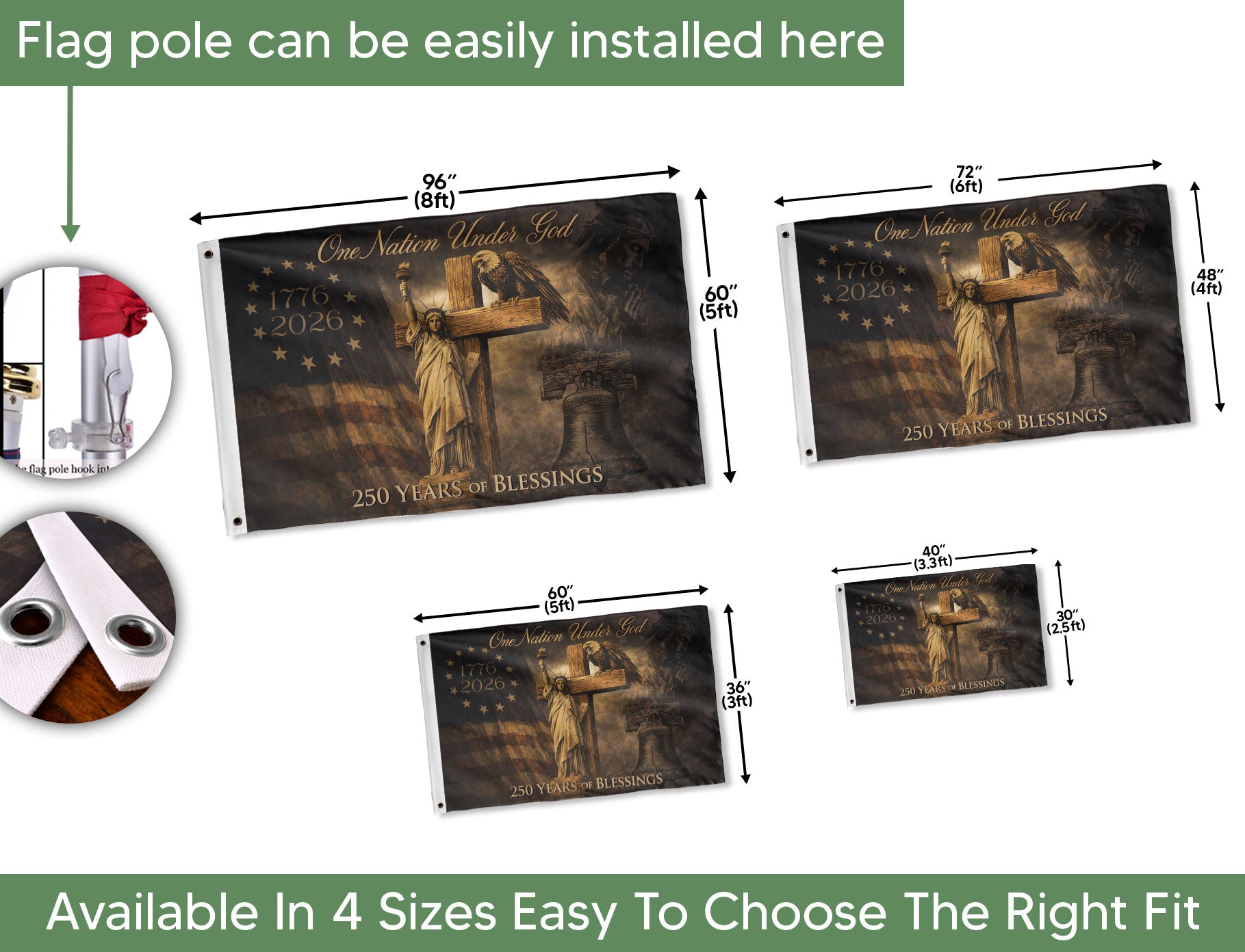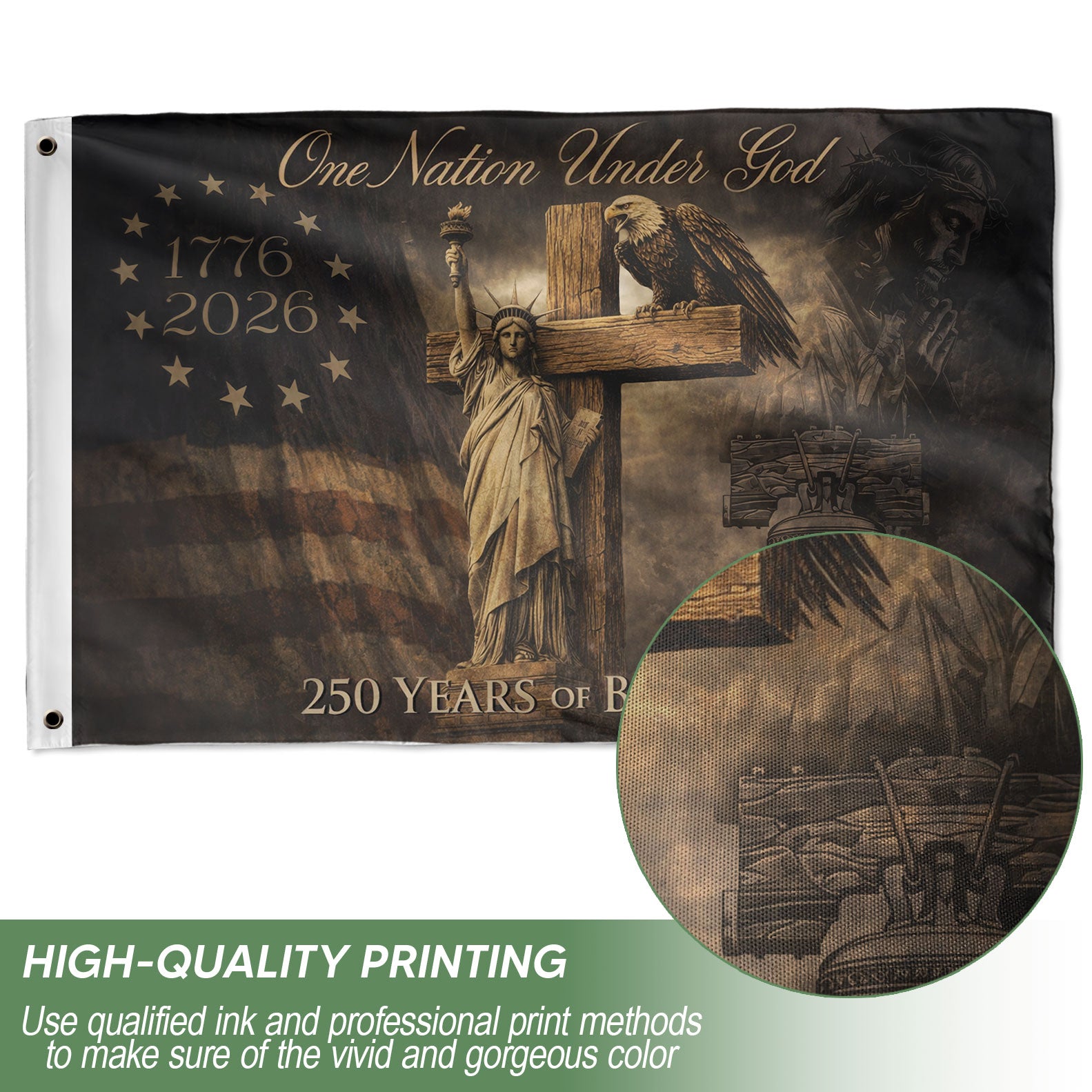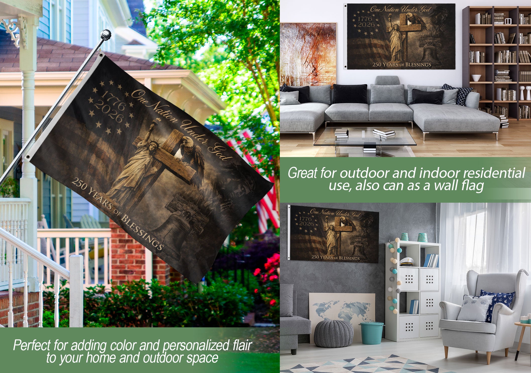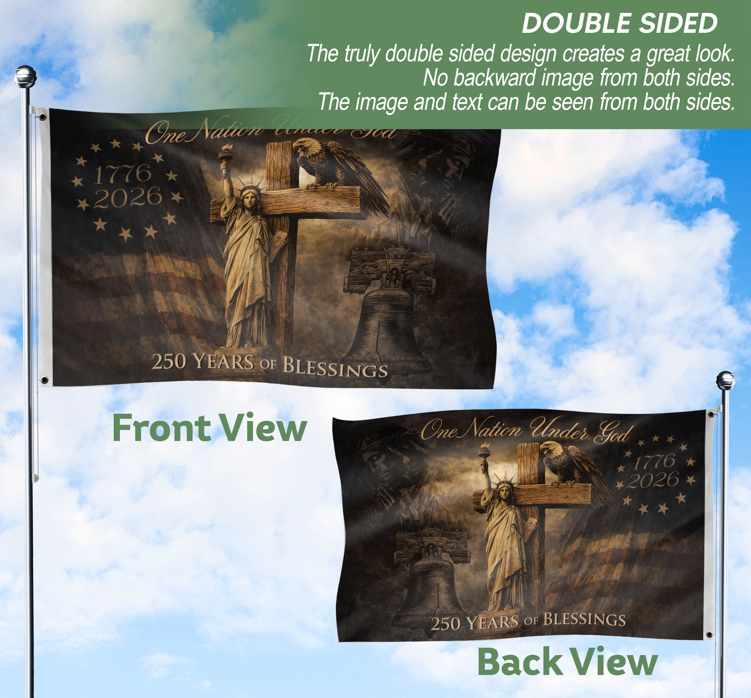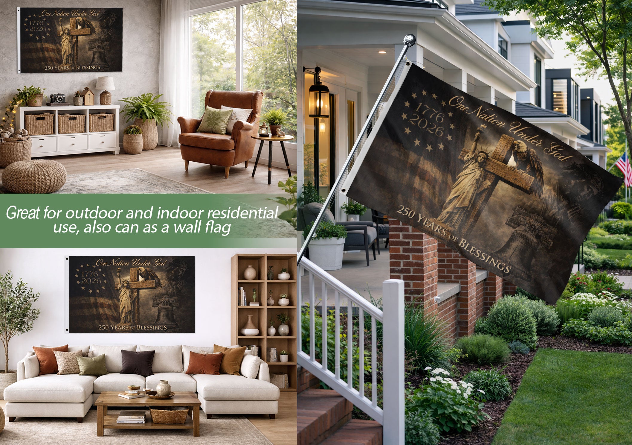 Celebrate America’s 250th anniversary with this striking Christian patriotic house flag, spanning 1776-2026. Featuring bold eagle wings, a prominent cross, and the timeless ‘One Nation Under God’ message, this flag embodies faith, freedom, and national pride. Perfect for displaying on your home porch, garden pole, or during patriotic holidays like the 4th of July, Memorial Day, or Independence Day. Crafted from durable, weather-resistant polyester fabric to withstand outdoor elements, ensuring vibrant colors and crisp details year-round. Easy to hang with a standard house flagpole sleeve. Ideal for Christian homes, veterans, and patriots honoring the nation’s Christian heritage and semiquincentennial milestone. Measures standard house flag size for versatile placement.