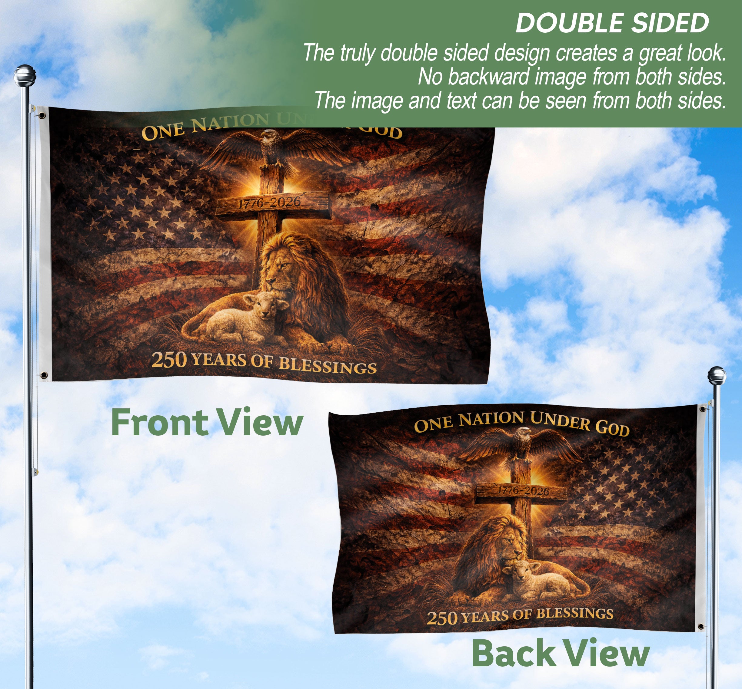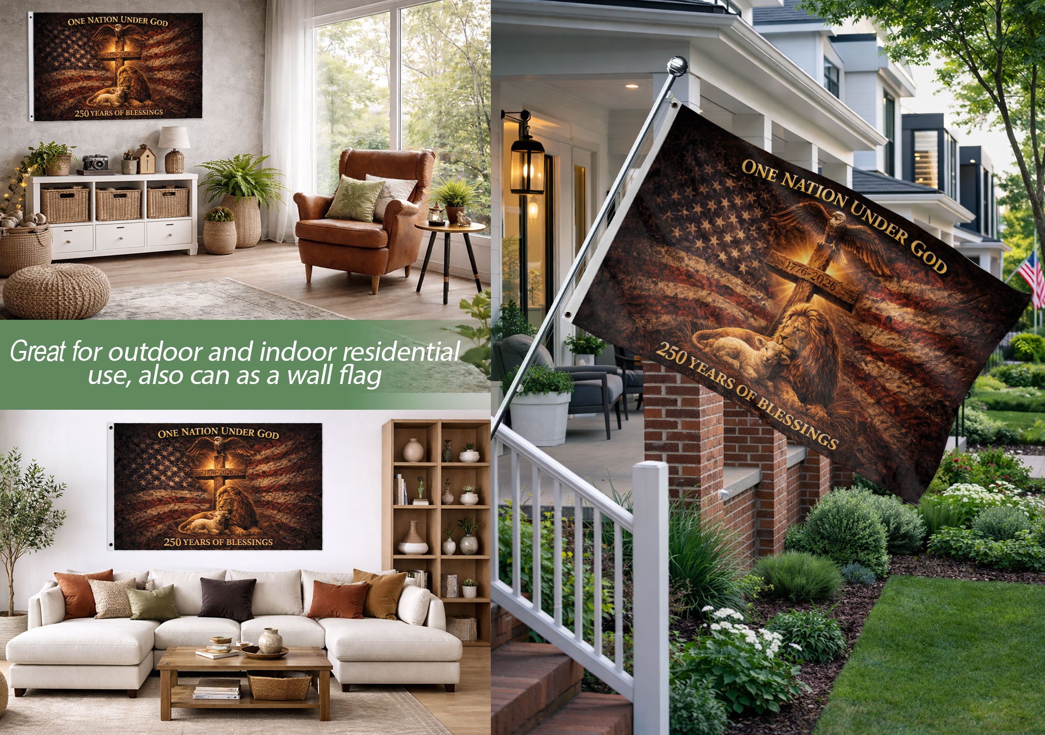 Celebrate America’s 250th anniversary, the semiquincentennial from 1776 to 2026, with this Christian patriotic house flag proudly displaying ‘One Nation Under God.’ This double-sided flag is crafted from durable, weather-resistant polyester fabric that withstands rain, wind, and sun for long-lasting color vibrancy. Measuring 28×40 inches, it’s the perfect size for porches, yards, gardens, or homes. Ideal for patriotic holidays like the 4th of July, Memorial Day, Independence Day, or Veterans Day, it honors American heritage, Christian values, faith, freedom, and national pride. Easy to hang on a standard house flag pole (not included), the bold graphics are visible from both sides, uniting family and community in meaningful decoration. Display your patriotism and faith with this high-quality USA house flag.